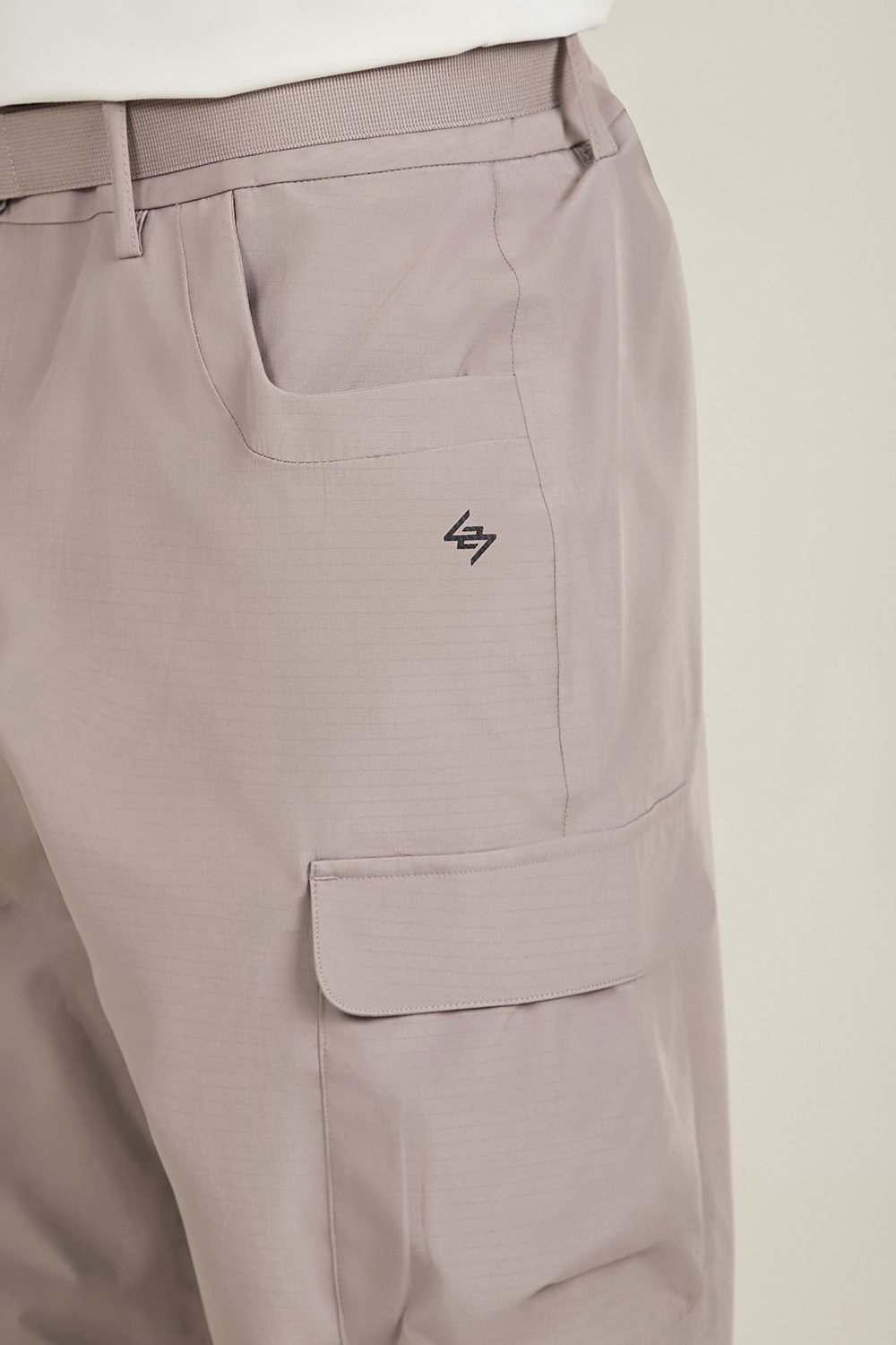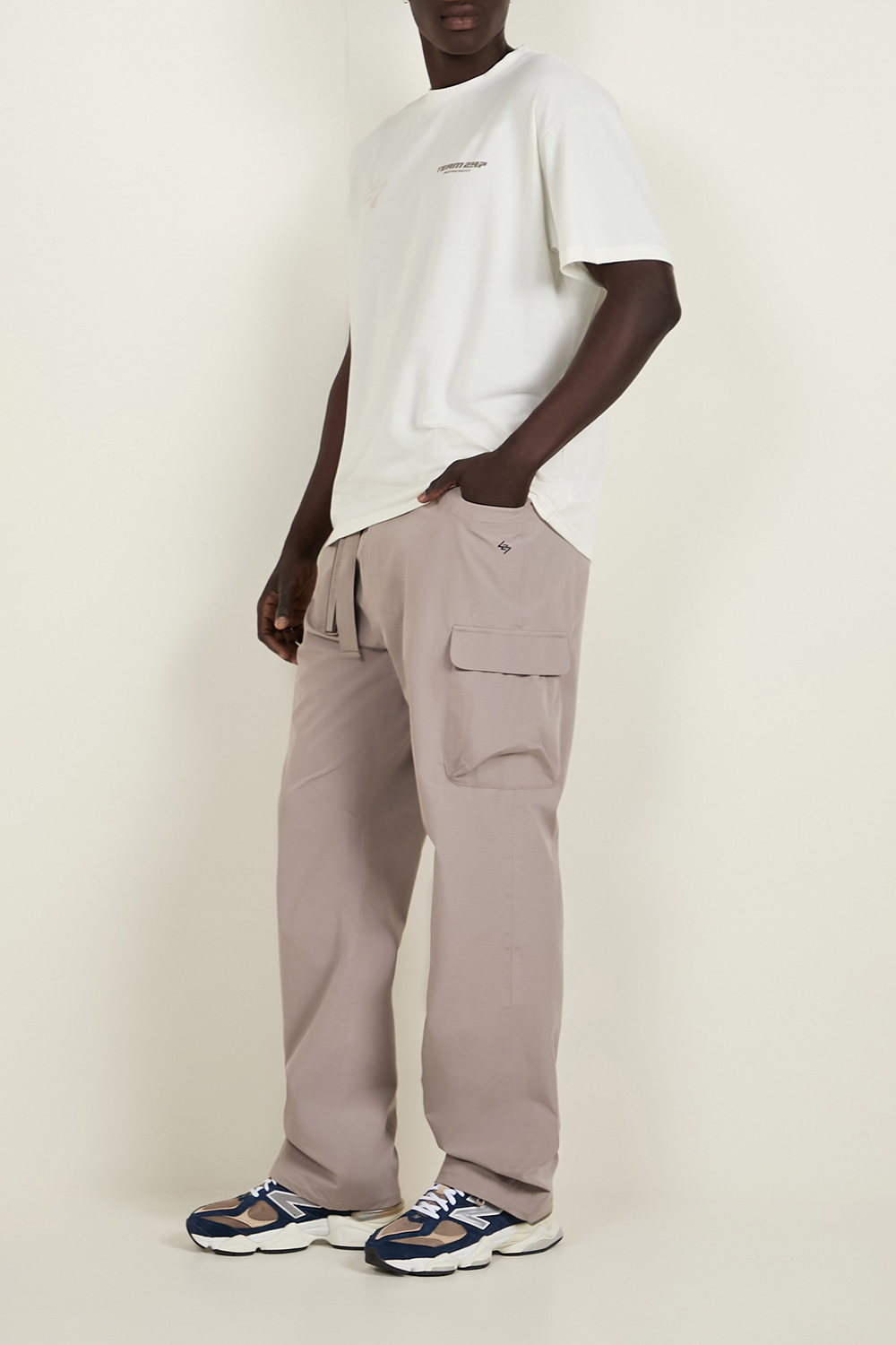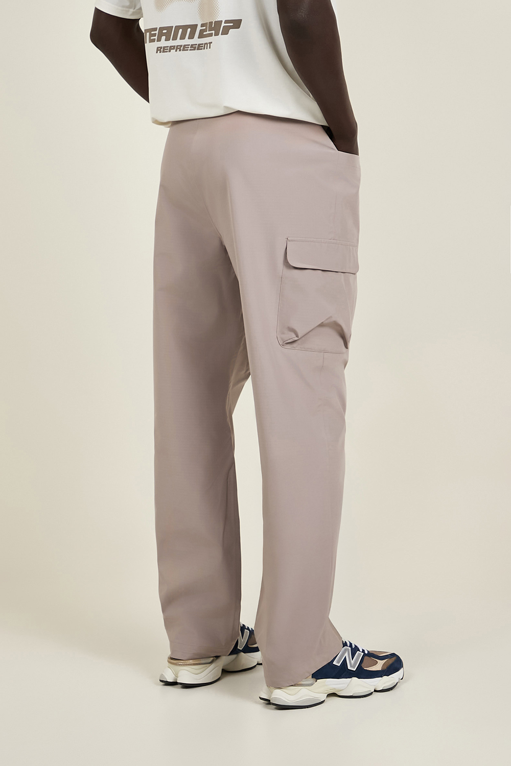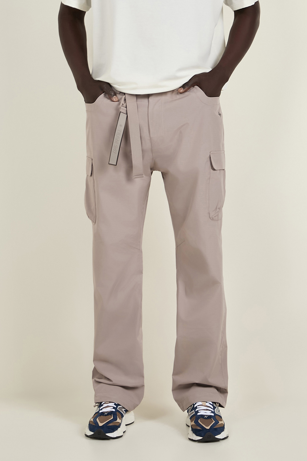 מכנסי קרגו מבית Represent, עשויים פוליאסטר בצבע בז' בשילוב חגורת מותניים עם אבזם שחור ורצועת לוגו המחוברת בלולאה. המכנסיים מעוצבים בטכנולוגיית 247 המתייבשת במהירות, נמתחת לארבעה כיוונים עם חופש תנועה.