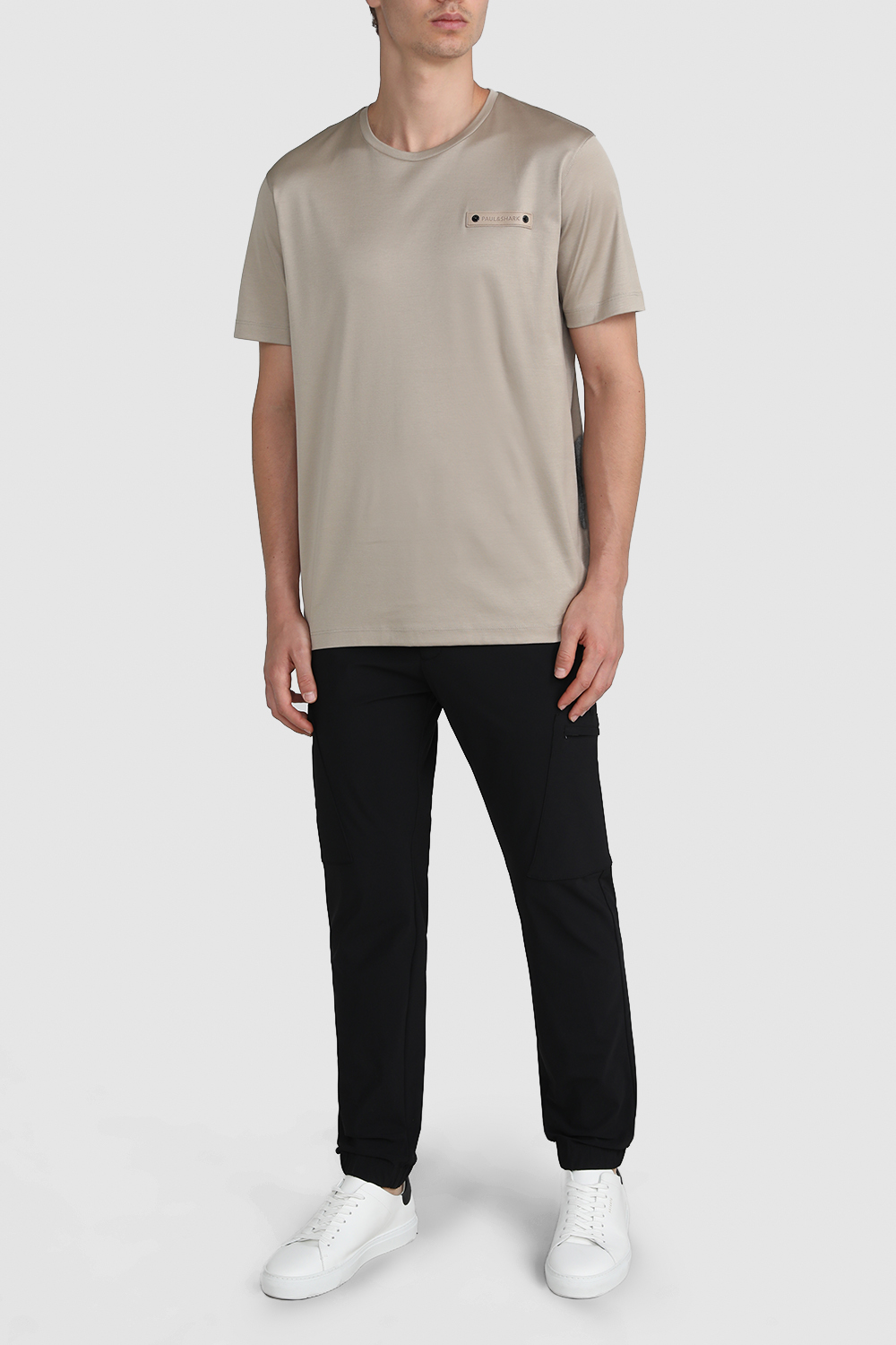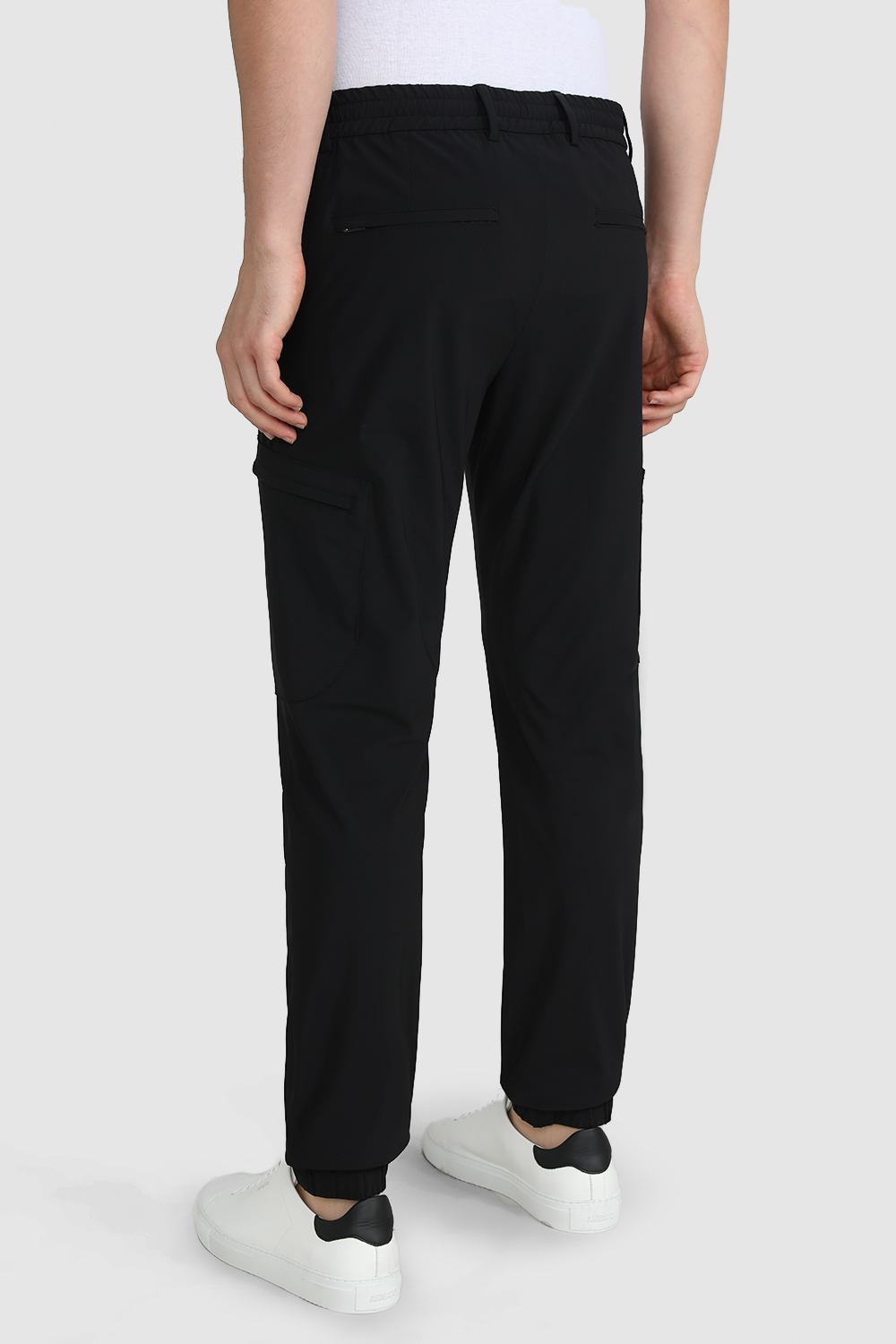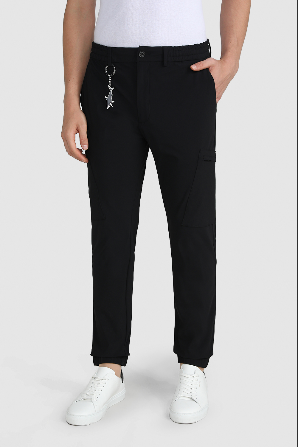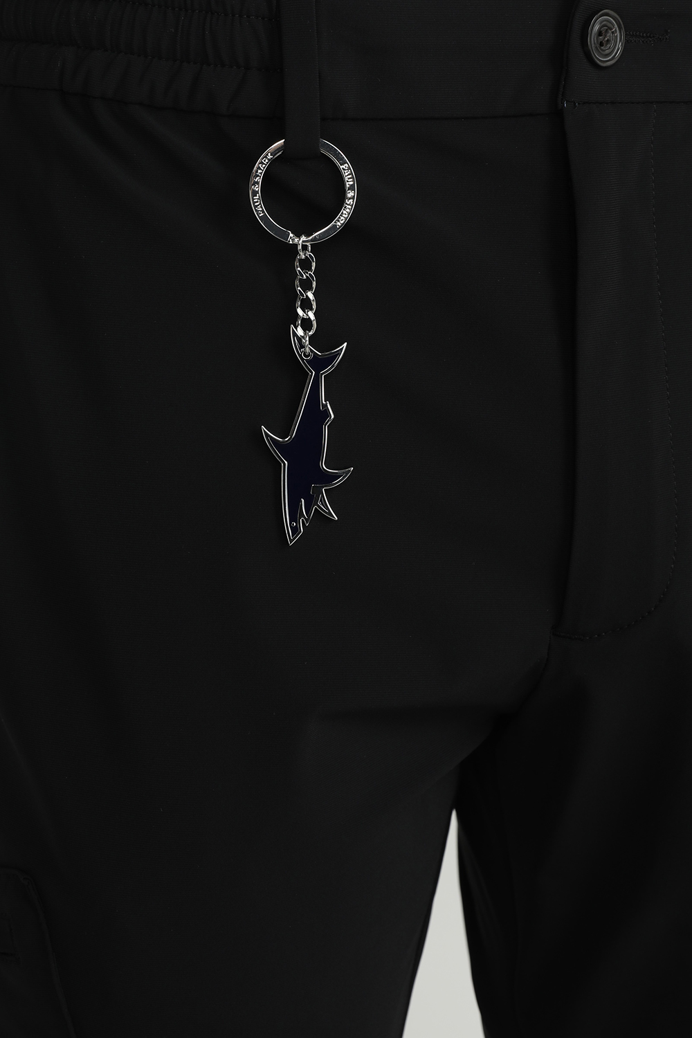 מכנסי קרגו מבית Paul & Shark, עשויות אלסטן וניילון בצבע שחור עם מחזיק מפתחות של כריש מטאלי כחול. למכנסיים שני כיסים בסגירת רוכסן.