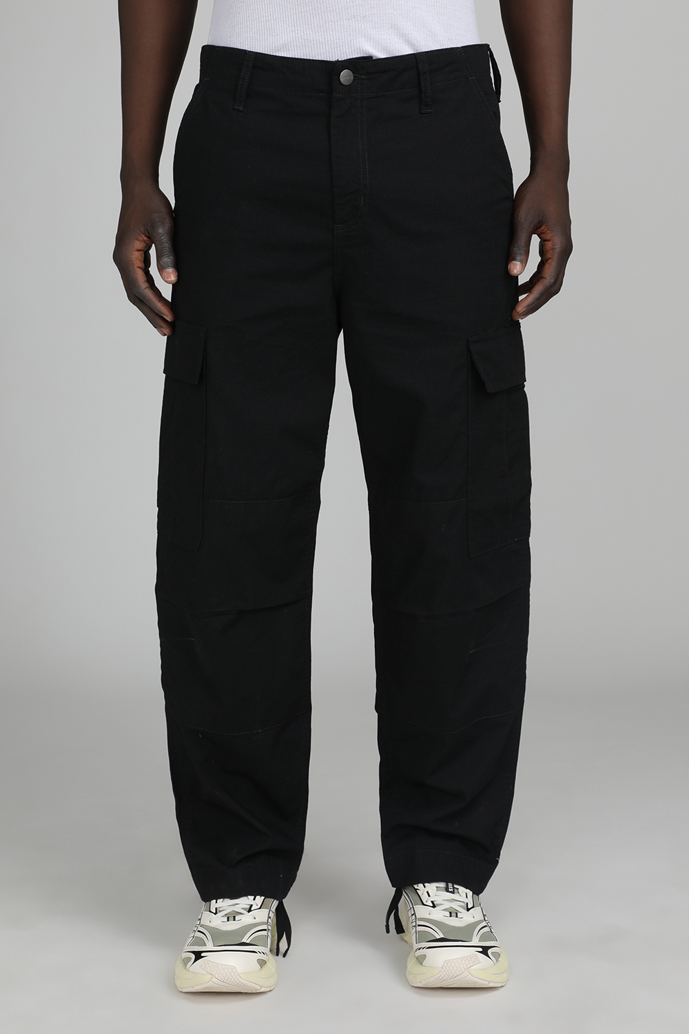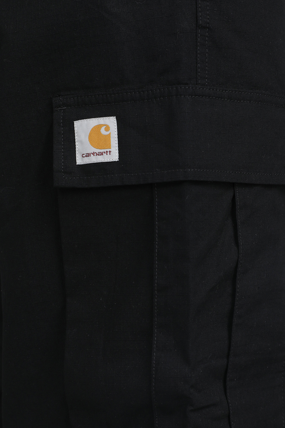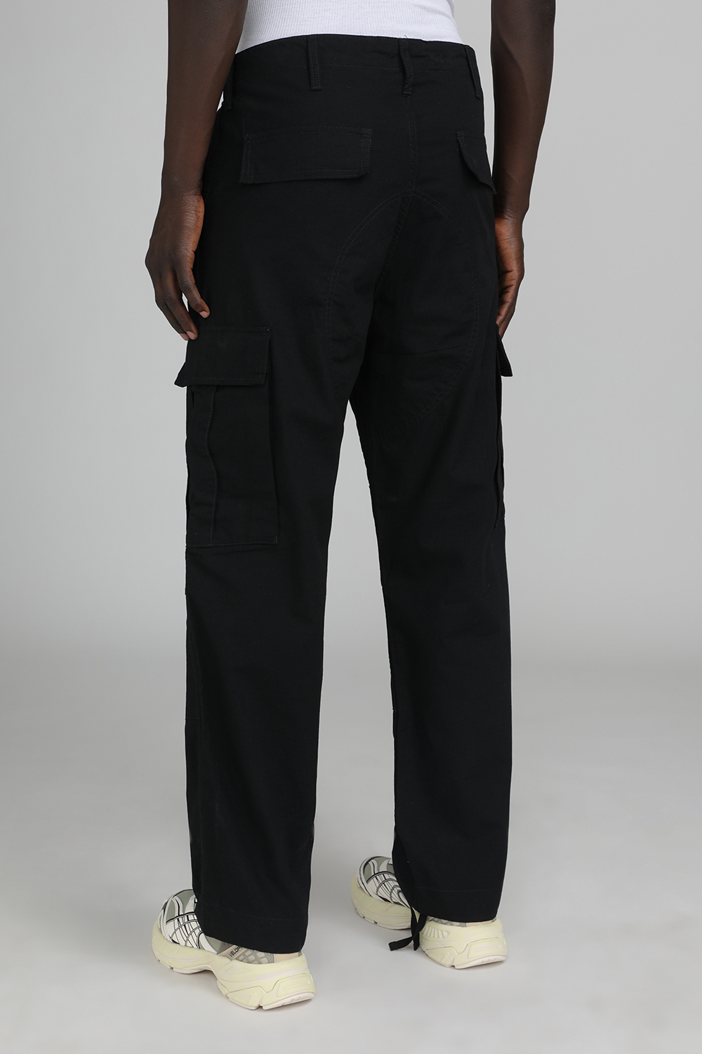 מכנסי קרגו מבית Carhartt Wip, עשויים כותנה בצבע שחור בשילוב כיסים צדדים ובסיומת שרוכים מתכווננים ליצירת מראה מהודק או משוחרר.