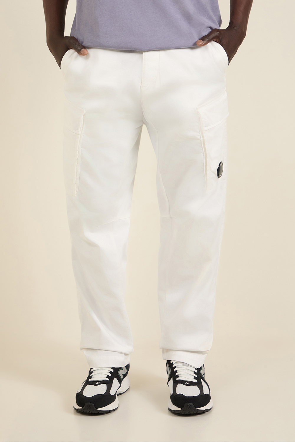 מכנסי קרגו מבית המותג האיטלקי C.P Company, המציג עיצובים בהשראת מכוניות, צעצועים ועדשות משקפיים ייחודיות. המכנסיים עשויים תערובת כותנה ואלסטן בצבע לבן בשילוב כיסים צדדיים, עם הטבעת העדשה האייקונית על גבי אחד מהם.