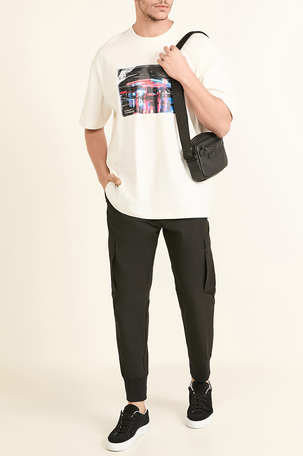 מכנסי קרגו מבית Hugo, עשויים תערובת פוליאמיד ואלסטן בצבע שחור ובעיצוב כיסים צדדיים עם סיומת גומי רחבה.