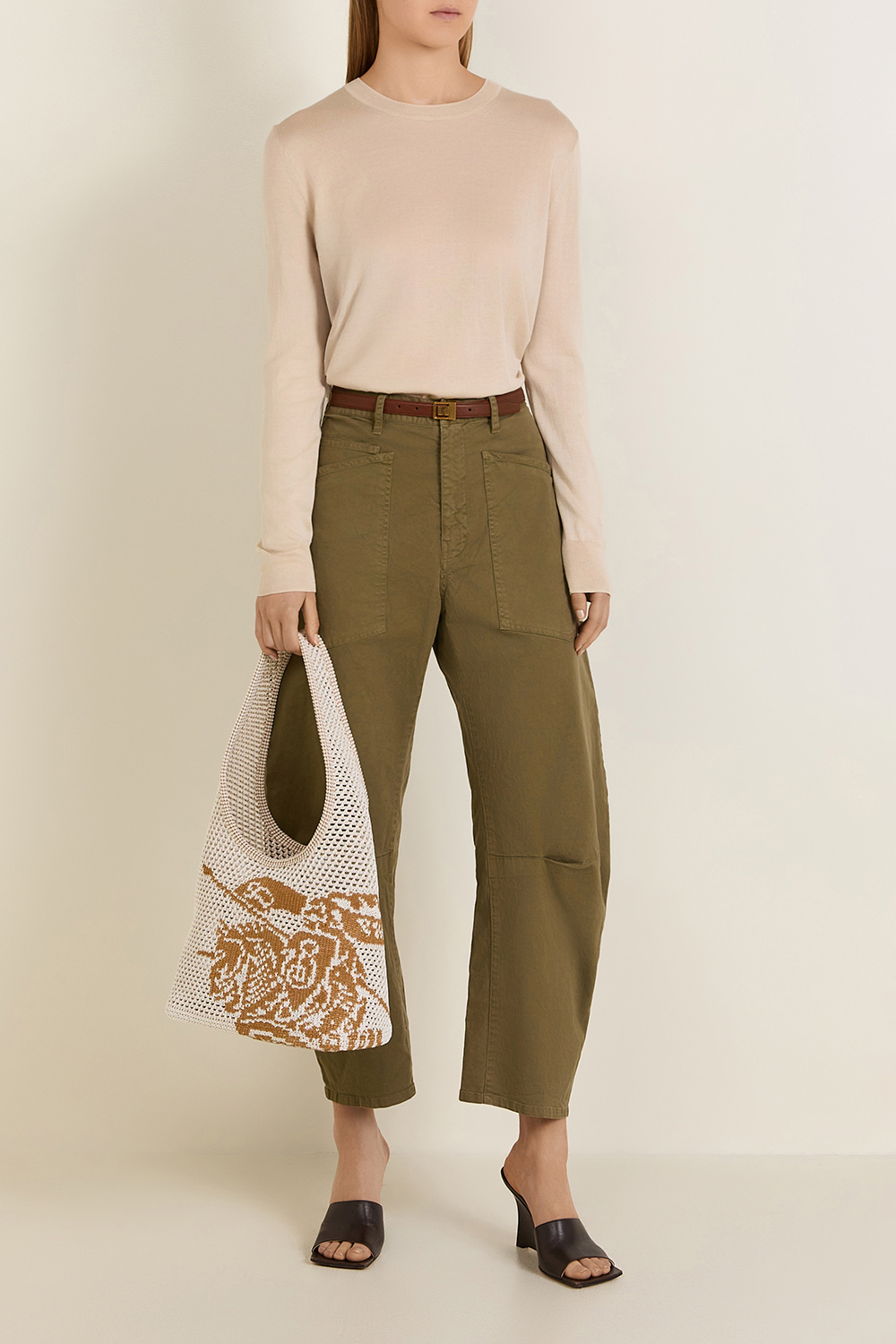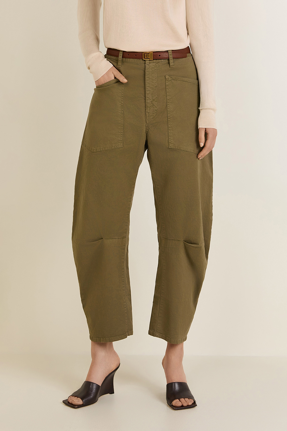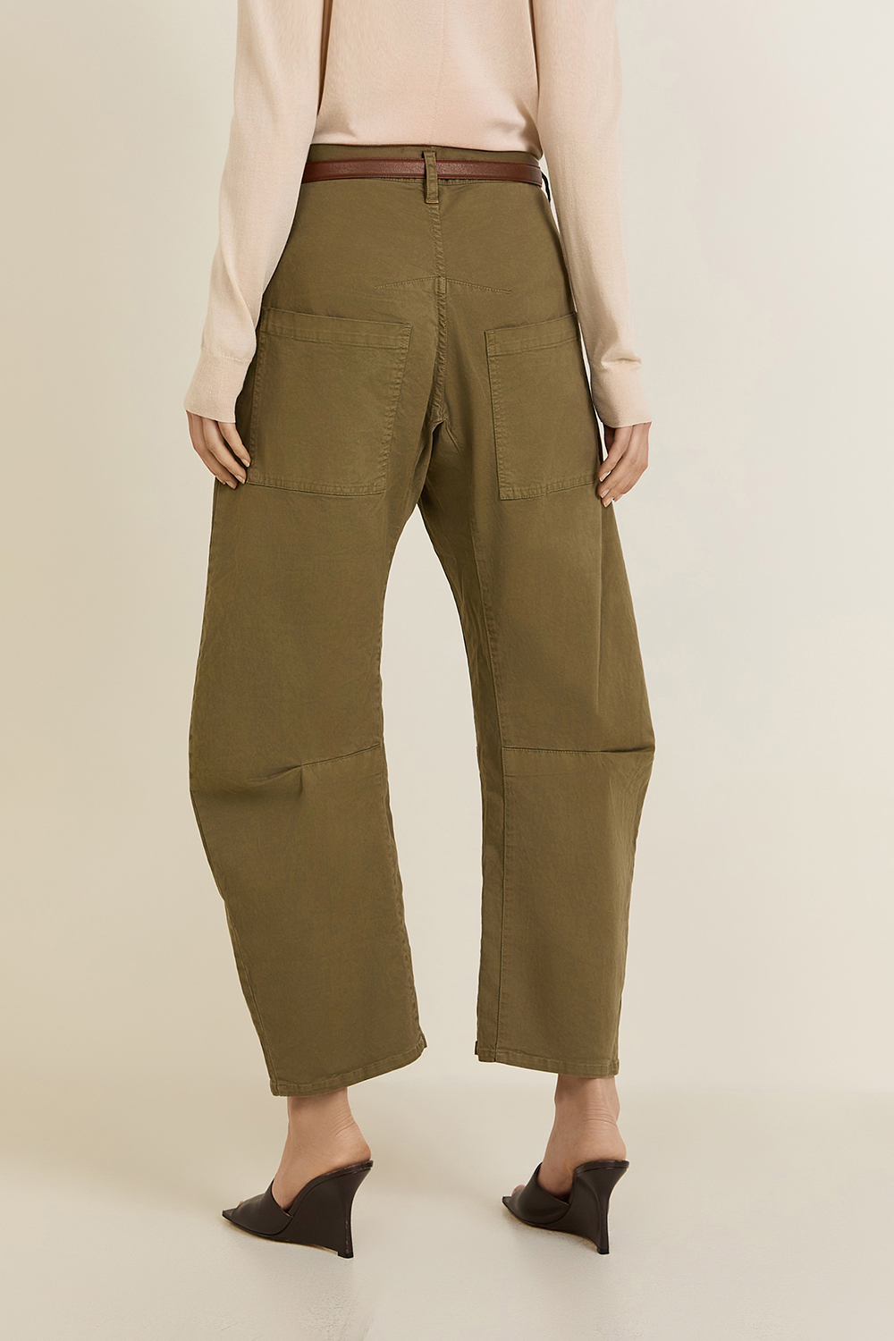 מכנסיים Shon ארוכים מבית Nili Lotan, עשויים תערובת כותנה ואלסטן בצבע ירוק ובגזרת מותניים בינונית ומשוחררת עם סיומת מעט צרה.
