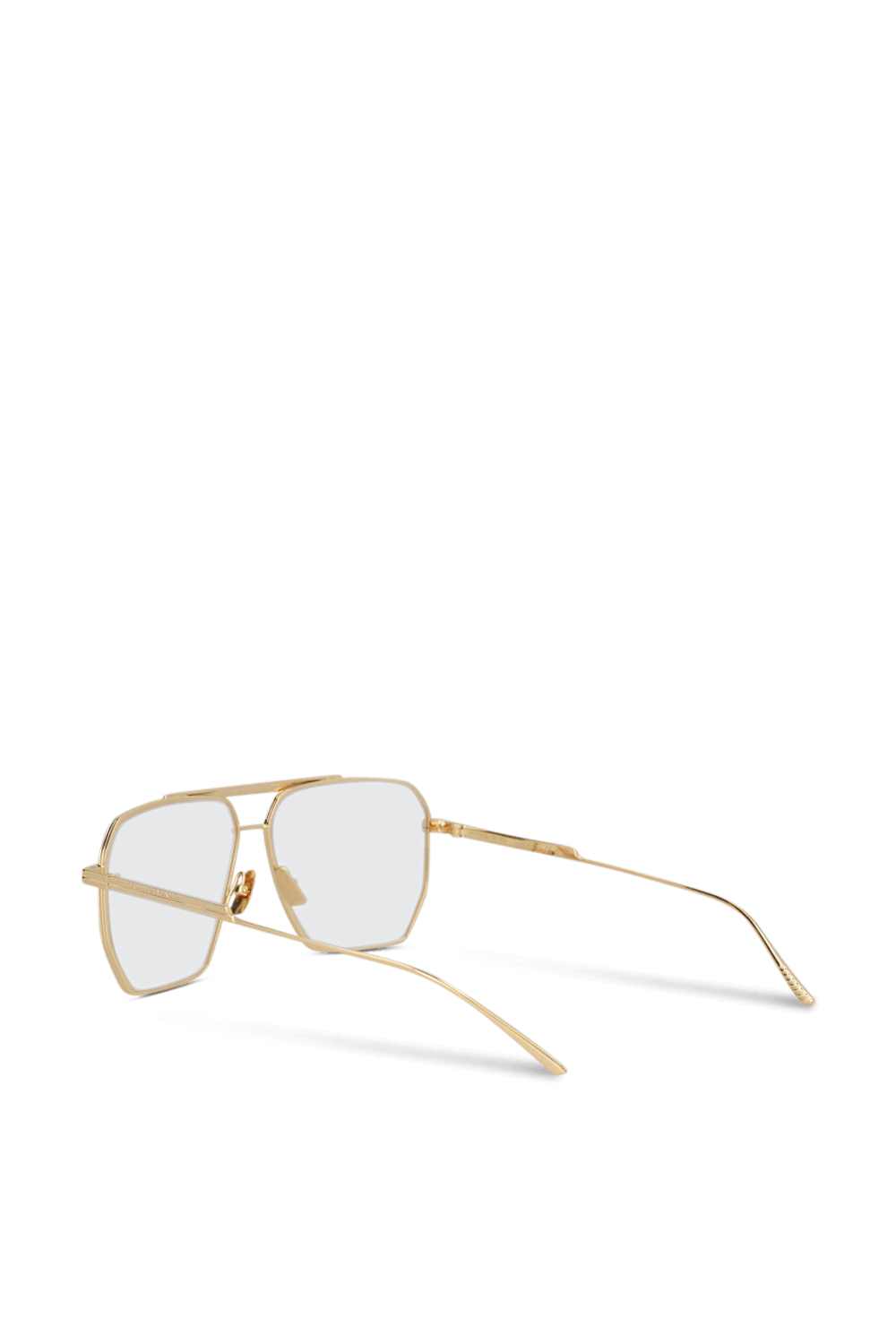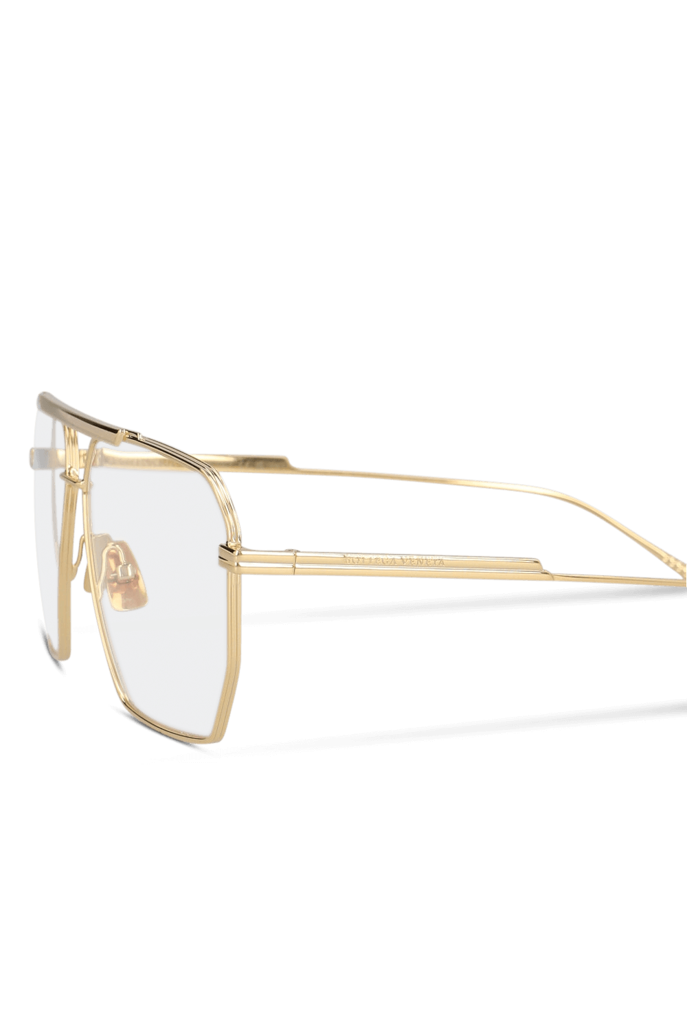 מסגרת למשקפי ראייה מבית Bottega Veneta, תוצרת איטליה. המסגרת עשויה אצטט בצבע זהב, עם אפונים גמישים הניתנים להתאמה אישית. היא מגיעה עם עדשות לדוגמה בלבד וללא מספר, ויש להתאים אותן באופן אישי לפי מרשם רופא או אופטמטריסט לפני השימוש.