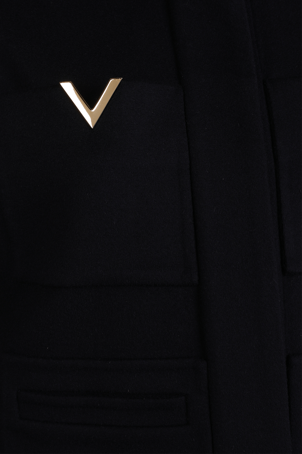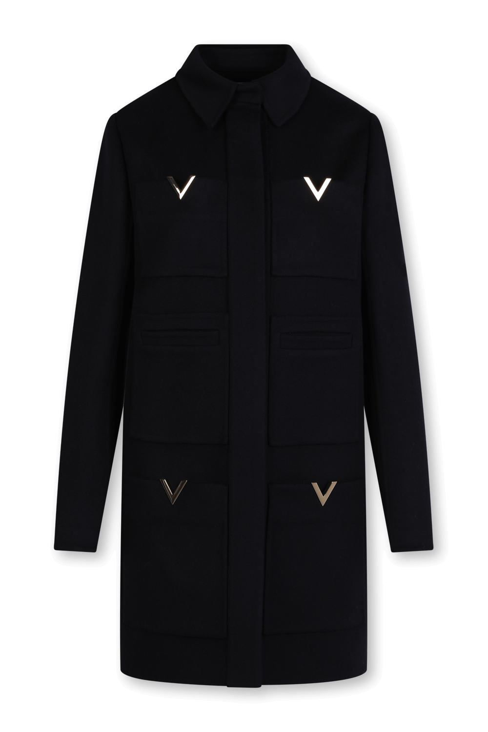 מעיל בעיצוב המותג היוקרתי Valentino העשוי 100% צמר משובח בצבע שחור. לפריט גזרה ארוכה וישרה עם סגירה חבויה ושישה כיסים על הפרונט כאשר ארבעה מתוכם מעוטרים באלמנט מטאלי כסוף בחיתוך האות V האייקונית של המותג. זהו פיס שישדרג כל לוק חורפי בסטייל עוצר נשימה ועל זמני.