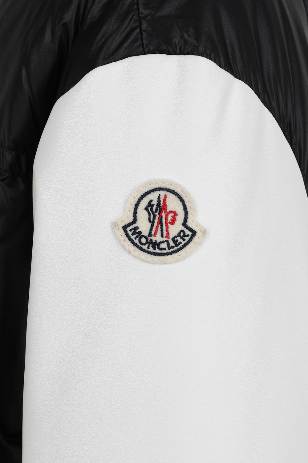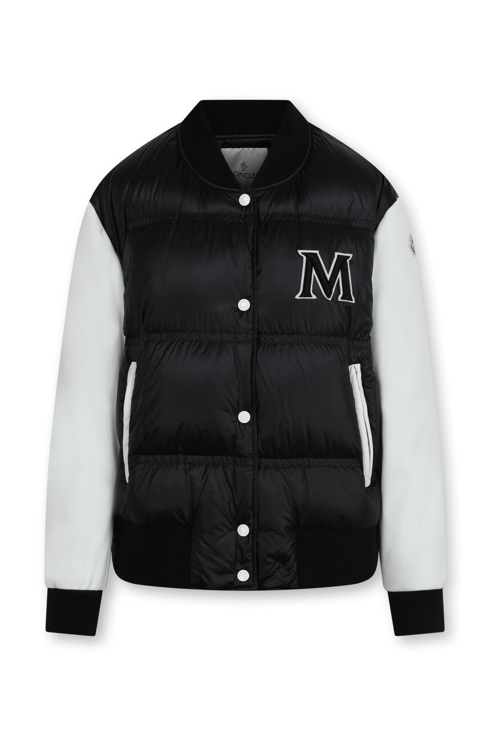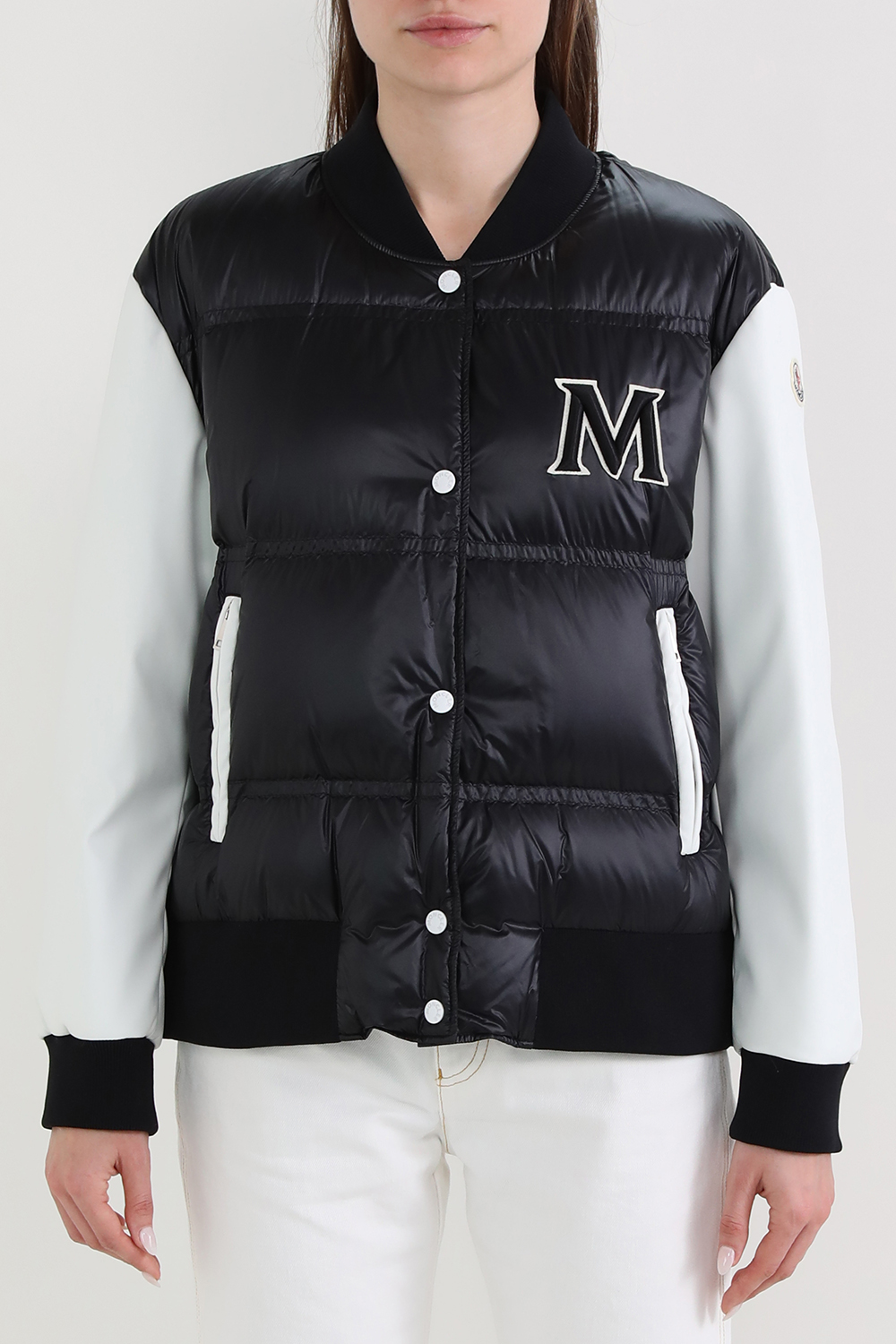 מעיל בומבר בעיצוב המותג הצרפתי היוקרתי Moncler. זהו דגם במראה וסט פוך עם תפרי קווילט בצבע שחור עם שרוולים לבנים ארוכים בעלי אמרות ריב. לפריט כפתורי תיק תק לפנים לאורך החזית עם שני כיסים צדדיים והאות M מעטרת את צד החזה.
