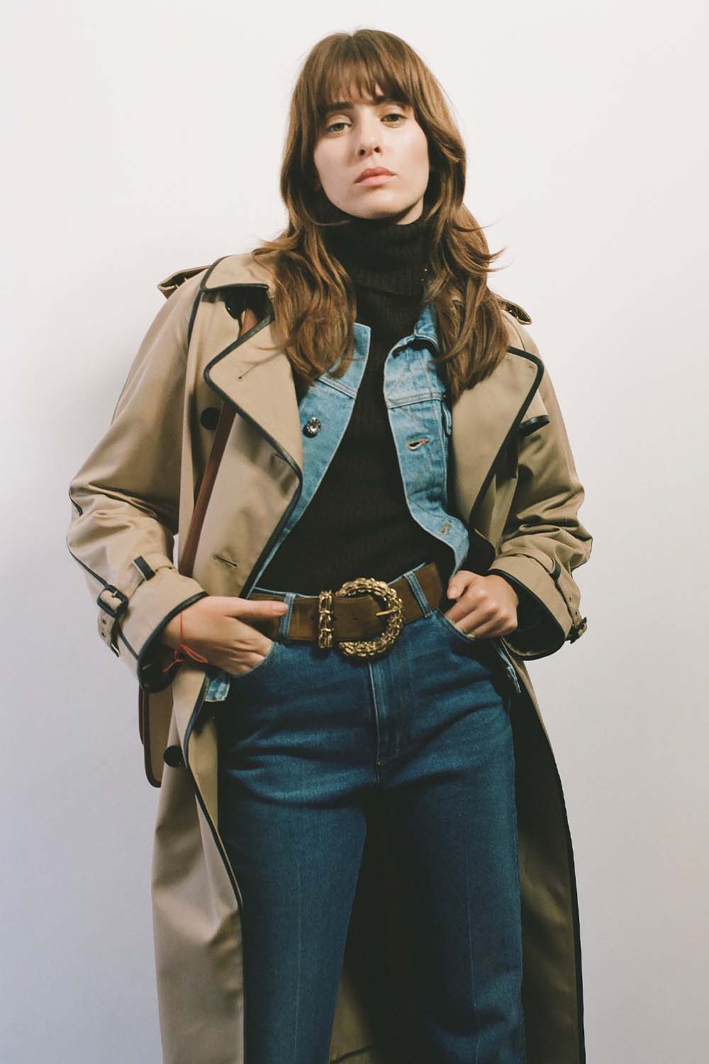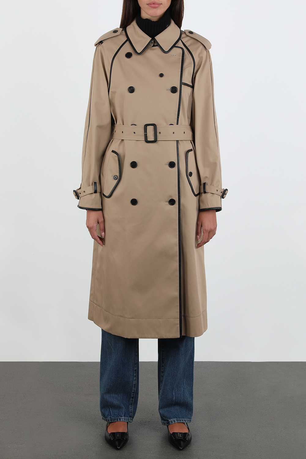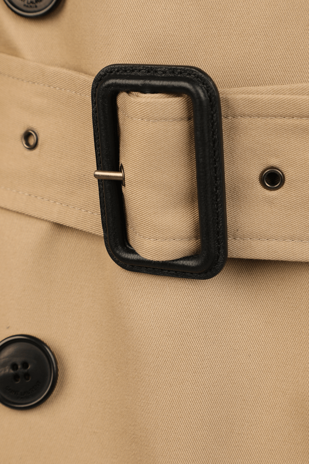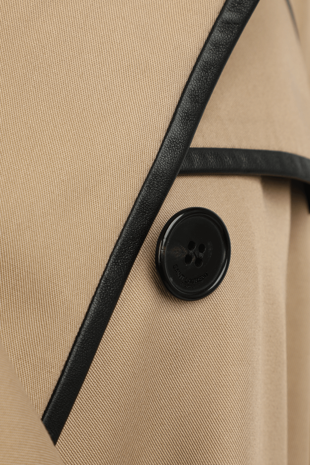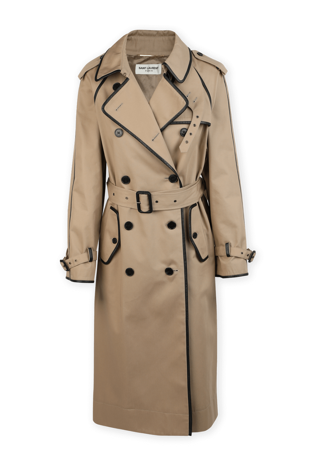 מעיל טרנץ' סופר שיקי בעיצוב בית האופנה היוקרתי סן לורן. זהו דגם העשוי טקסטיל משובח בגוון ניודי טרנדי. לפריט גזרה ישרה עם חגורת בד המעניקה דגש מחמיא לקו המותן. אלמנטים נוספים כמו כיסים מכופתרים וצווארון משולש משדרגים פיס חורפי נהדר זה.