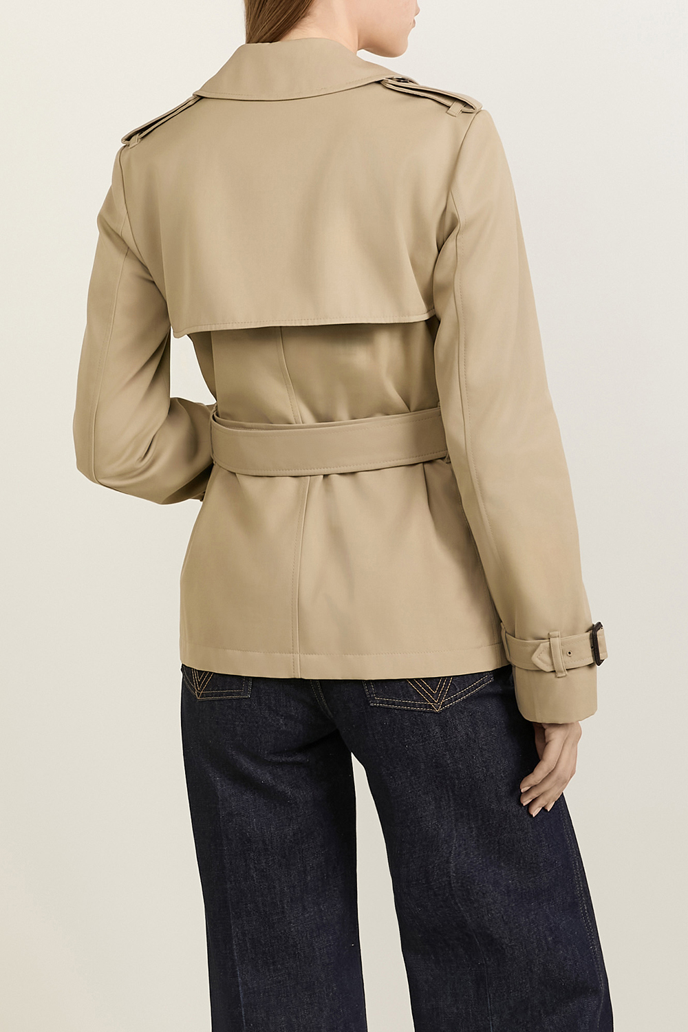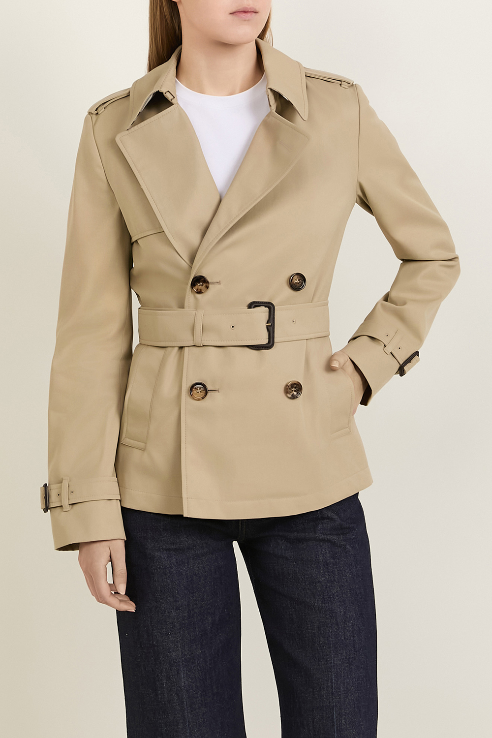 מעיל טרנץ' קצר מבית Burberry, עשוי כותנה עמידה במים בצבע חאקיף עם ביטנה בדוגמת המשבצות הקלאסית של המותג, המשולבת גם בצידו האחורי של הצווארון. הוא נסגר ברכיסת כפתורים כפולה ובחגורת מותניים.