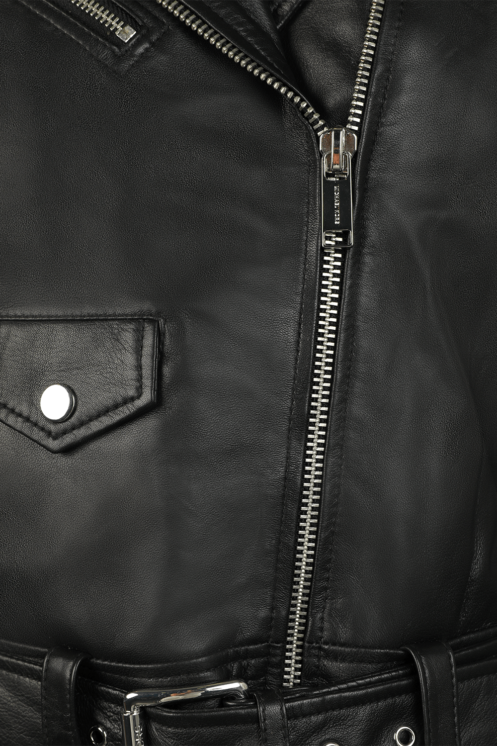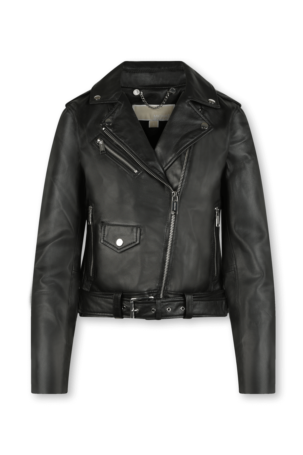 ז`קט עור בסגנון בייקר בעיצוב בית האופנה האמריקאי מייקל קורס. הפריט עשוי מ-100% עור משובח בגוון שחור ומציג צללית קרופ סלים מחמיאה הכוללת שני כיסים מרוכסנים, פלוס סגירת שני רוכסנים אלכסוניים בחזית בשילוב אלמנטים מטאליים כסופים. מדובר בפריט יוקרתי שילווה אותך לאורך שנים ובשיא הסטייל.