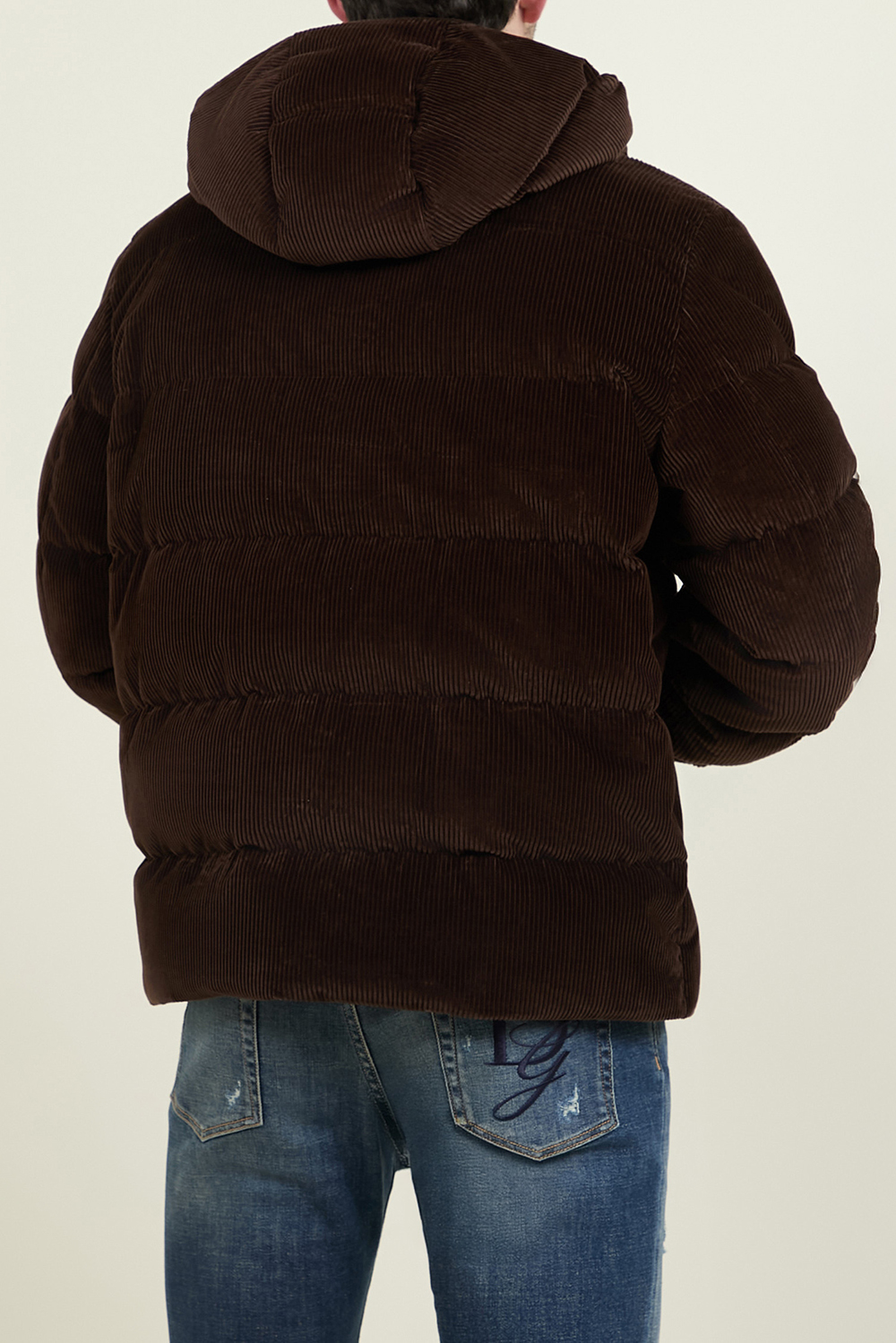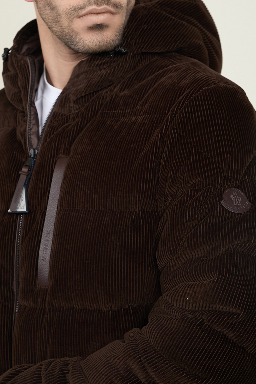 מעיל פוך מבית Moncler, עשוי כותנה בגימור קורדרוי רך במיוחד בצבע חום, עם ריפוד מחמם השומר על חום הגוף עבור ימי החורף הקרים. למעיל כובע קפוצ'ון מתכוונן עם רוכסן לאורך החזית ושני כיסי צד.