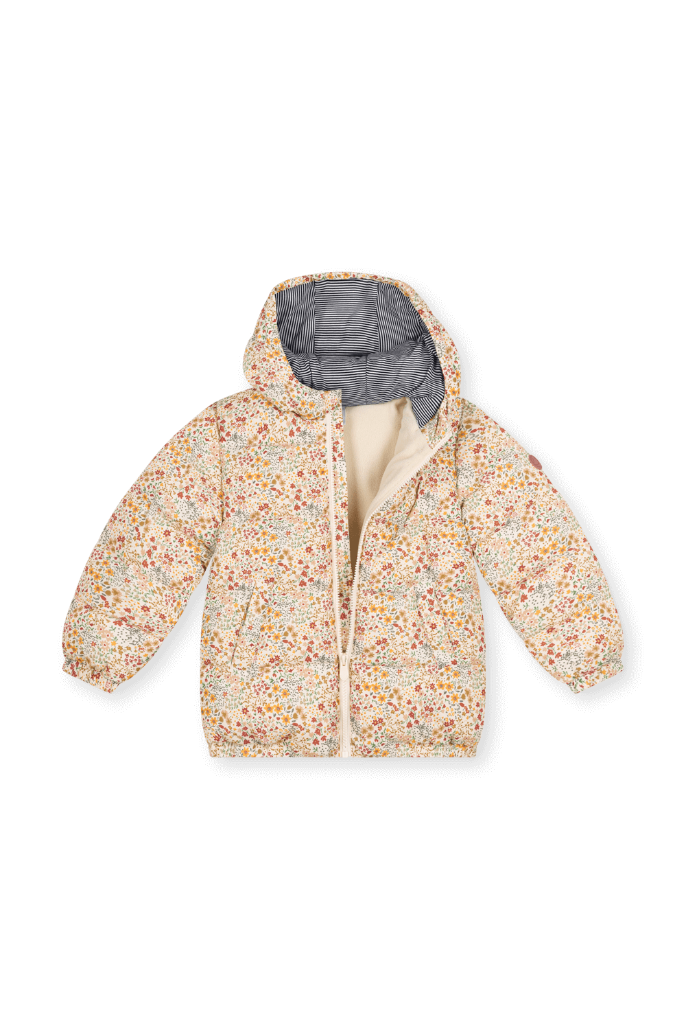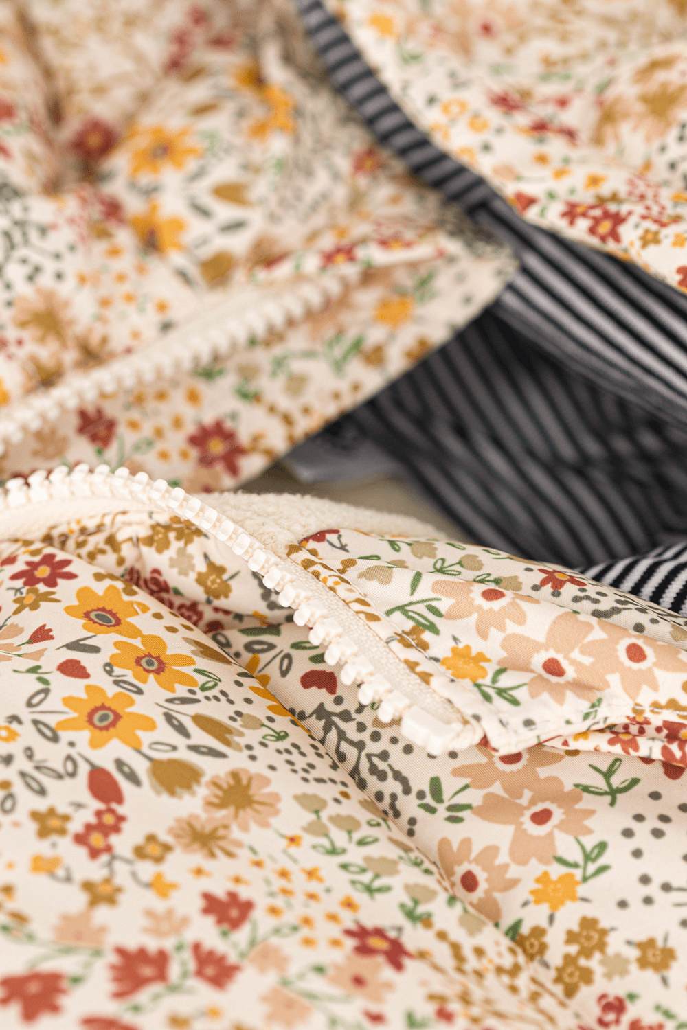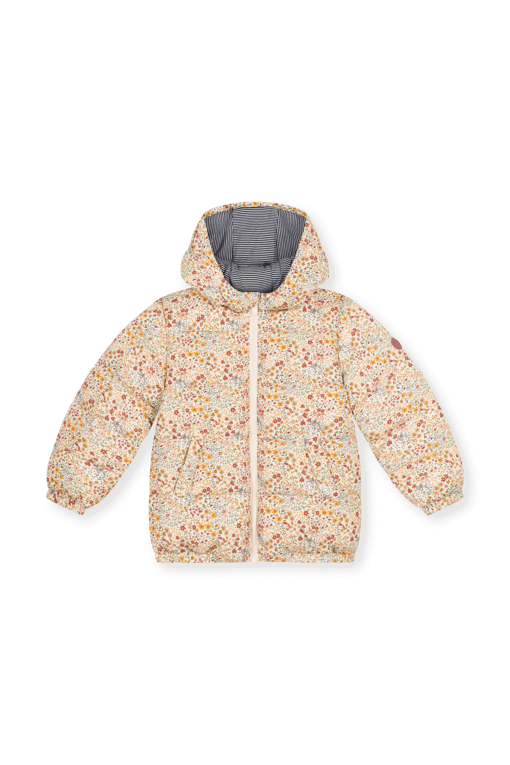 מעיל פוך מפנק מבית המותג הצרפתי Petit Bateau בהדפס פרחים צבעוני. הוא עשוי פוליאסטר ממוחזר בחלקו ובריפוד מיקרופליז נושם ומנדף לחות, המעניק רכות וחמימות. למעיל קפוצ'ון עם ביטנת כותנה בעיצוב פסים, ואורכו מכסה את החלק העליון של הרגליים ובכך חוסם מעבר אוויר קר. נסגר ברוכסן.