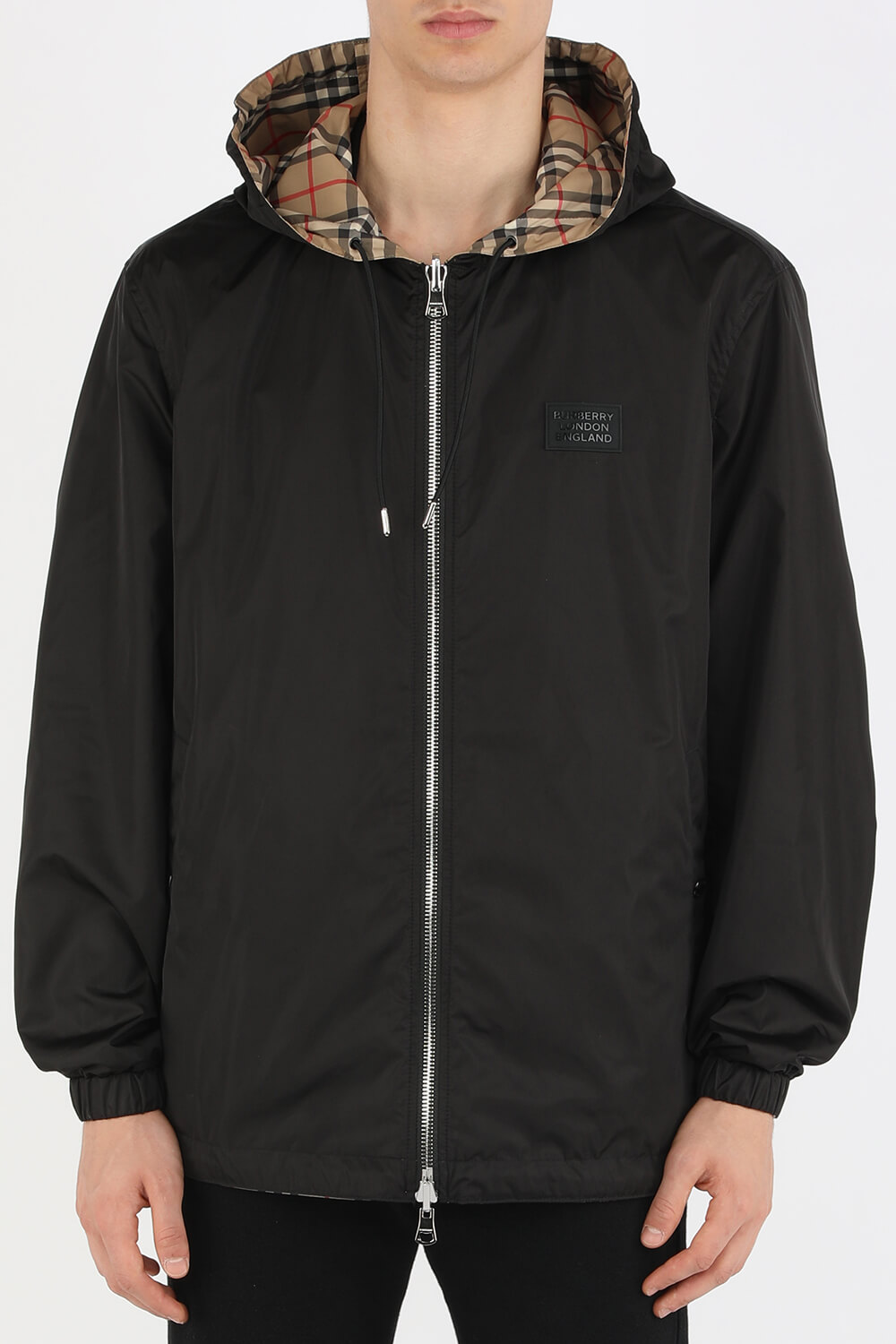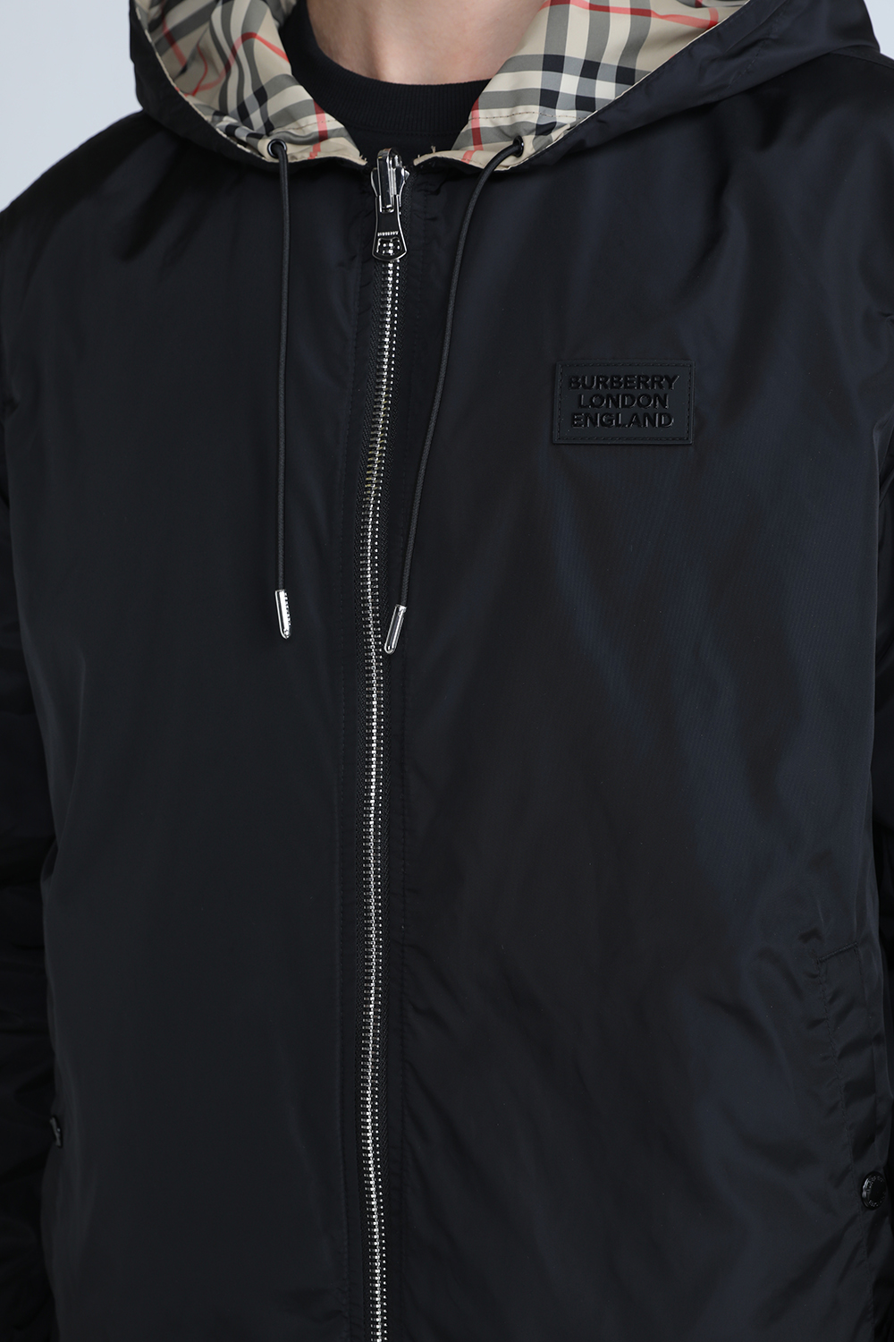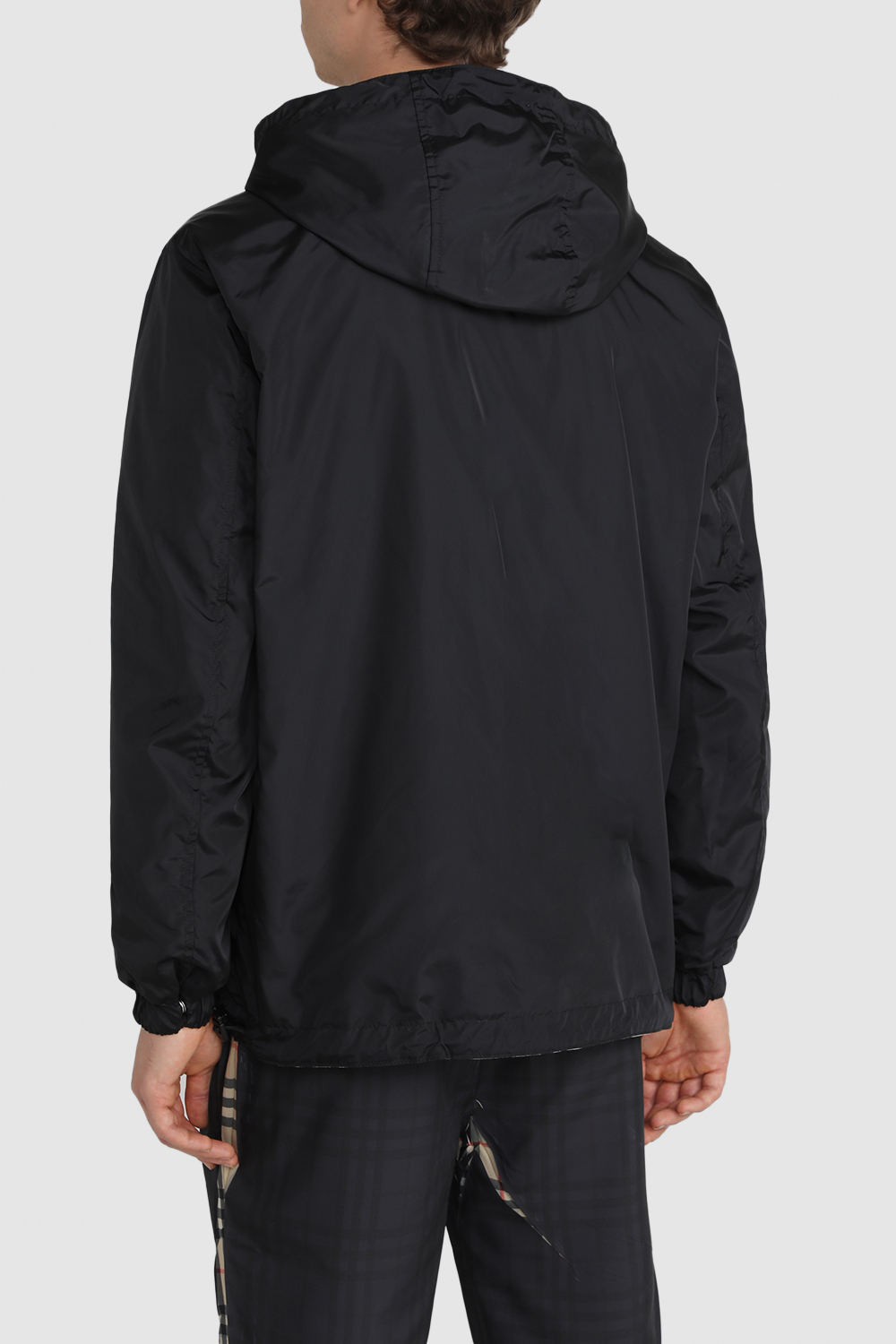 מעיל רוח צדדי עם קפוצ`ון מבית Burberry, עשוי פוליאסטר וניילון. מצידו האחד בצבע שחור ומצידו השני בדוגמת המשבצות האייקונית של המותג. הוא נסגר ברכוסן מגיע עם צמד כיסים בסגירת כפתורי תיק-תק.