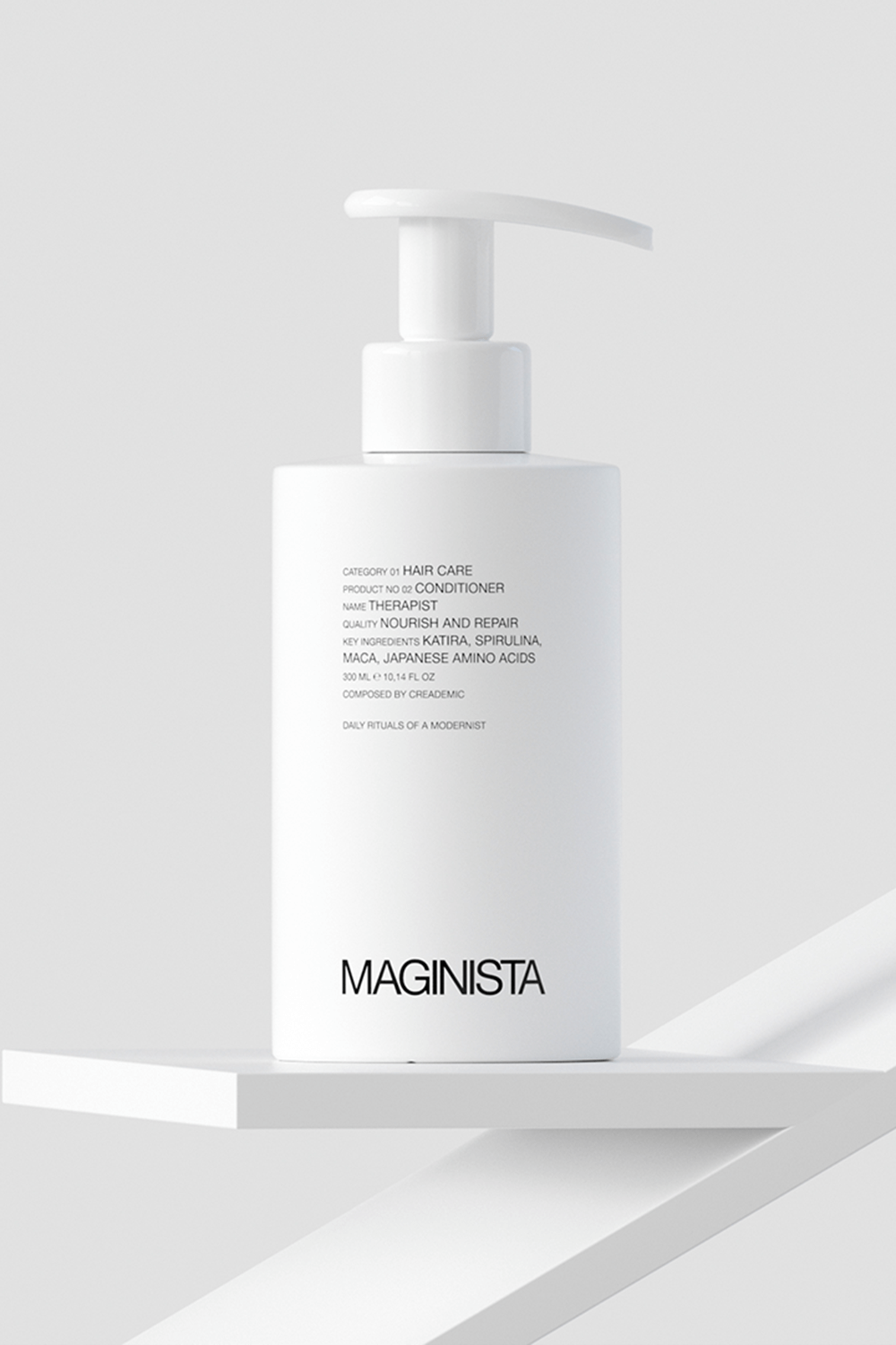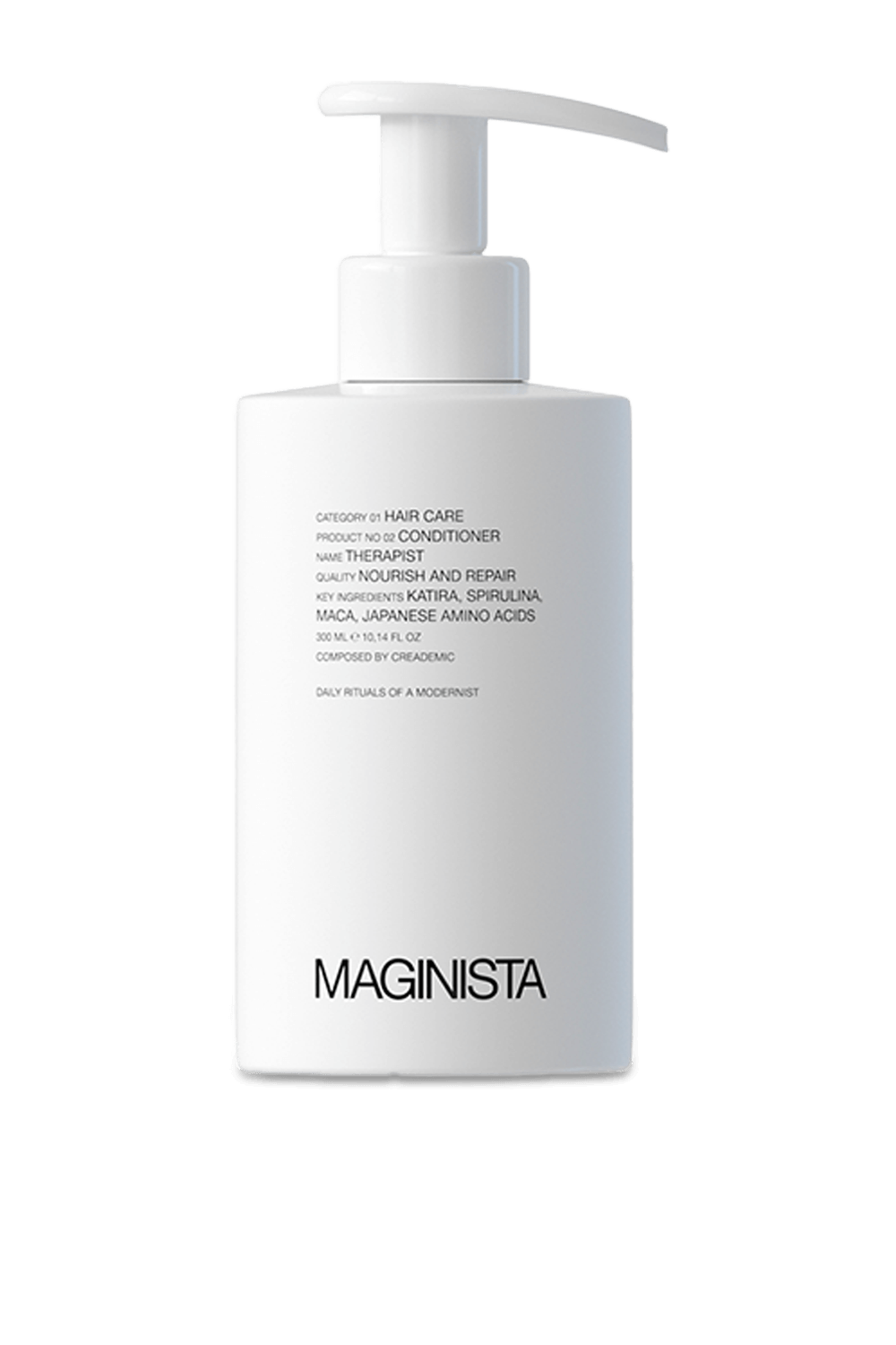 מרכך שיער Therapist מבית Maginista, בפורמולה המגנה ושומרת על השיער מפגעי היומיום. הפורמולה מבוססת על צמח מאקה פרואנית המחזק את השיער ומעניק לו גמישות וברק, אצת ספירולינה המסייעת במניעת נשירה, קרטין הידרוליזי - המסייע לחלבון לחדור בצורה טובה יותר לשיער ומעניק לו הגנה משופרת, גמישות, לחות והוא קל לסירוק קל. ללא בישום. מתאים לכל סוגי השיער. הבקבוק עשוי פלסטיק ממוחזר..