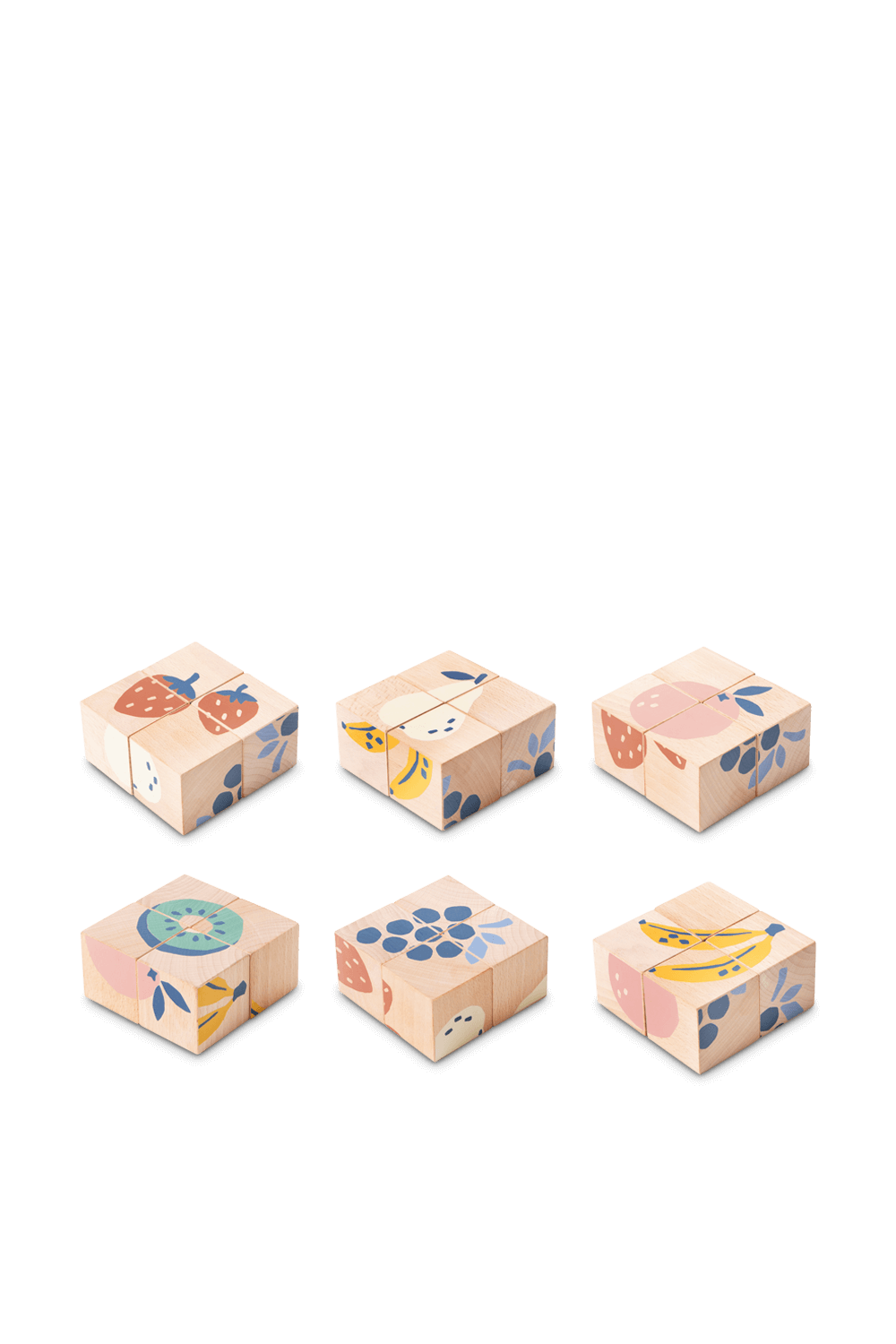 משחק קוביות עץ מבית Nobodinoz, עשוי עץ בהדפס נטול רעלים בעיצוב פירות שונים- בננה, אגס, תפוז, תותים, קיווי וענבים. משחק הקוביות מגיע בתיק בעיצוב אננס ובסגירת רוכסן.