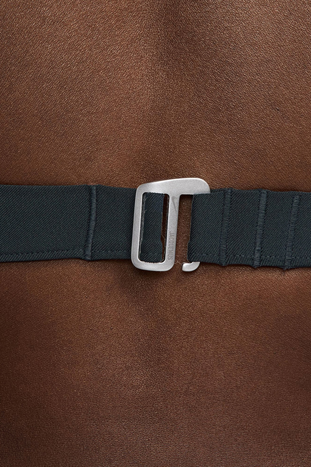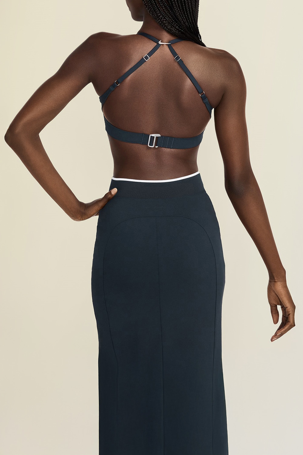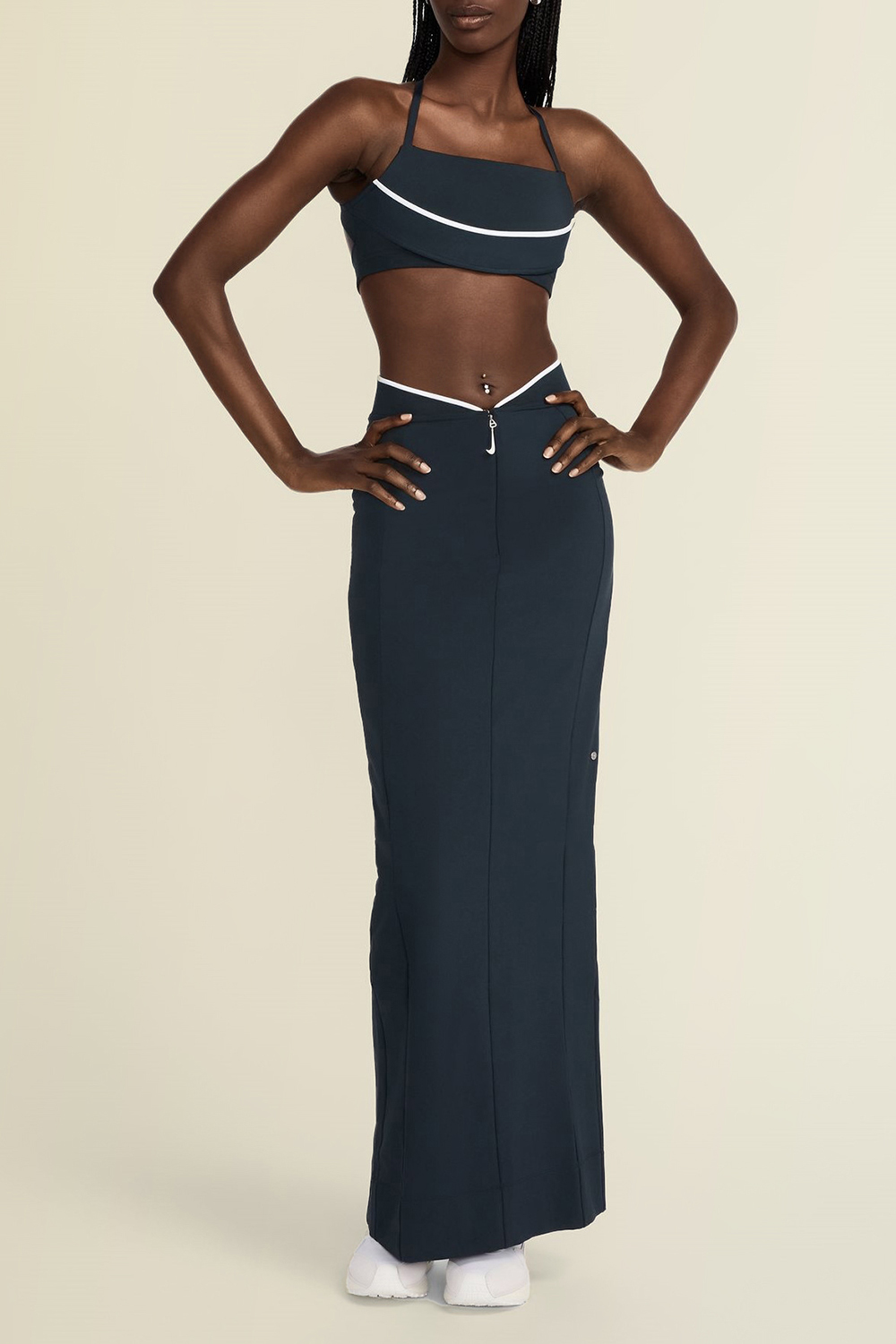 חזיית ספורט מתוך חגיגת הספורט והסטייל המשותפת לשני המותגים Nike x Jacquemus. החזייה עשויה פוליאסטר בצבע שחור עם דיטייל לבן, ויש לה שתי רצועות מתכווננות בגזרת רייסר בק בשילוב לוגו Nike מטאלי בצבע כסוף.