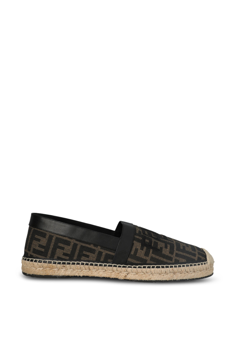 נעלי אספדריל מבית Fendi, עשויות בד בהדפס לוגו חזרתי בצבע חום עם דיטיילז מעור שחור ורקמת לוגו בחזית הנעל.