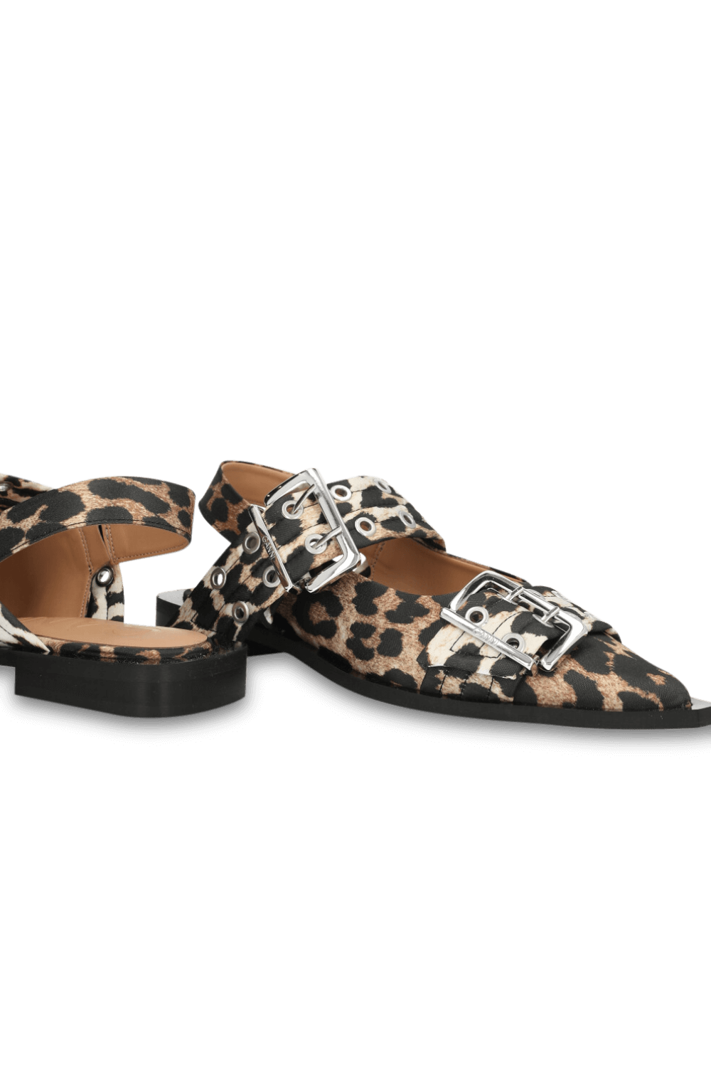 נעלי הבלרינה סלינג בק שכבר הפכו לעיצוב אייקוני של Ganni. הן עשויות עור ממוחזר בדוגמה מנומרת, עם שתי רצועות הנסגרות באבזמים כסופים ודומיננטיים. ברצועת הסלינג בק משולב גומי נסתר המאפשר את הכנסת הרגל לנעל בקלות ובנוחות.