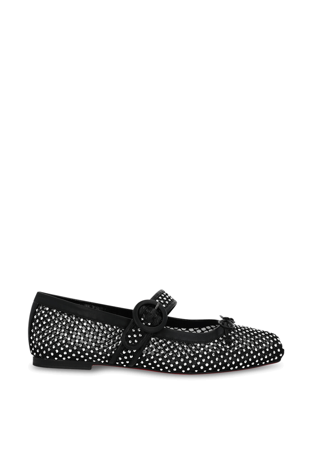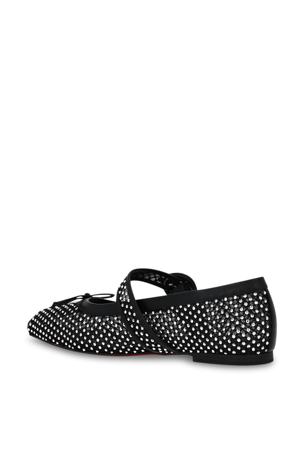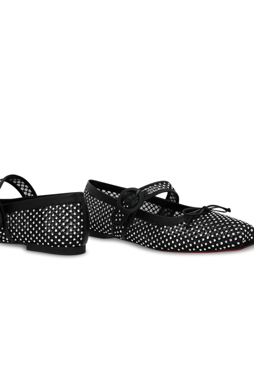 נעלי בלרינה Mamastrapitina מבית Christian Louboutin, עשויות תערובת עור ורשת בצבע שחור ובעיצוב קריסטלים מנצנצים. לנעליים סיומת פפיון קלאסית, בשילוב רצועה מתכווננת בהתאמה אישית וסוליה אדומה אייקונית.