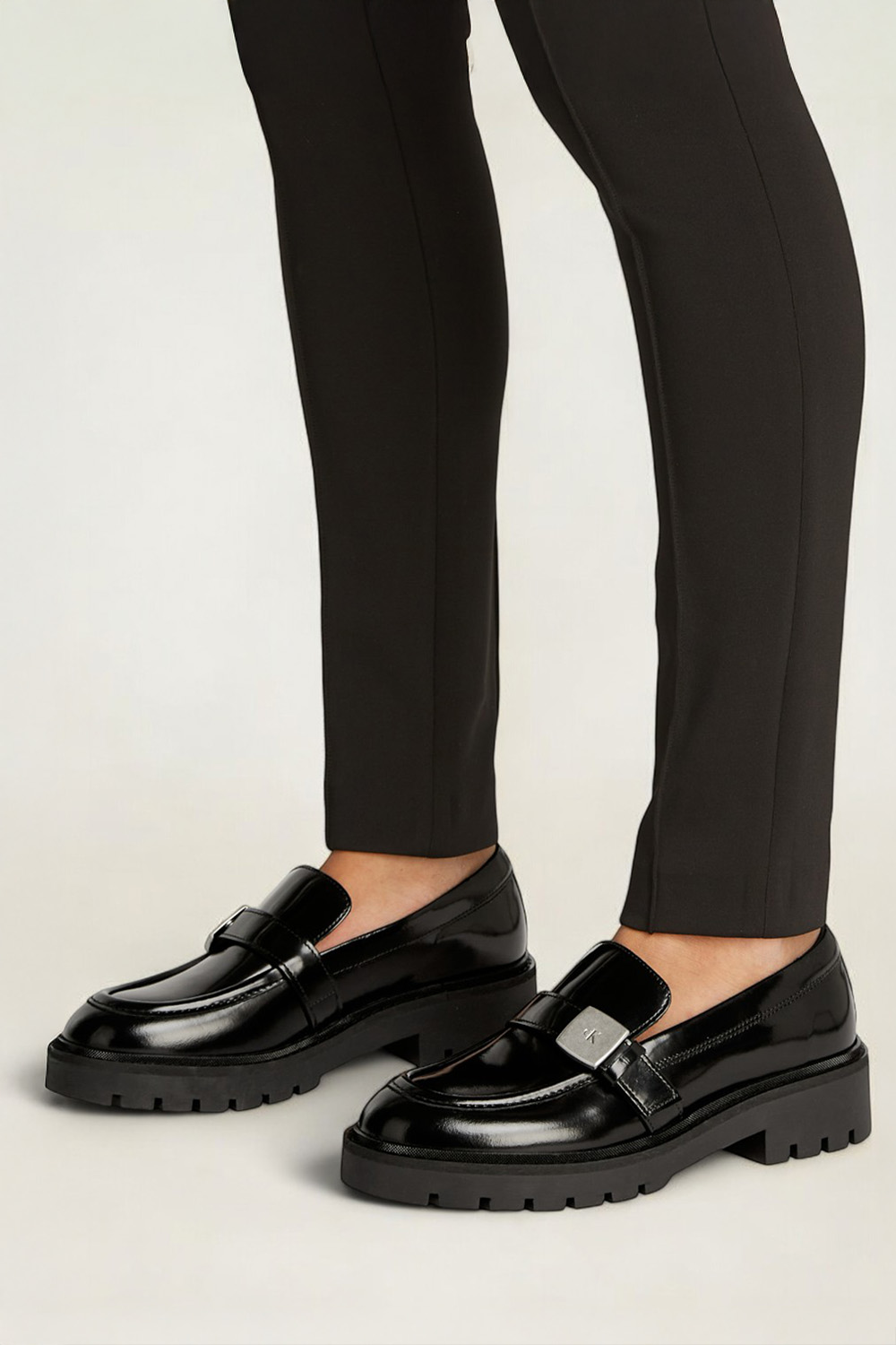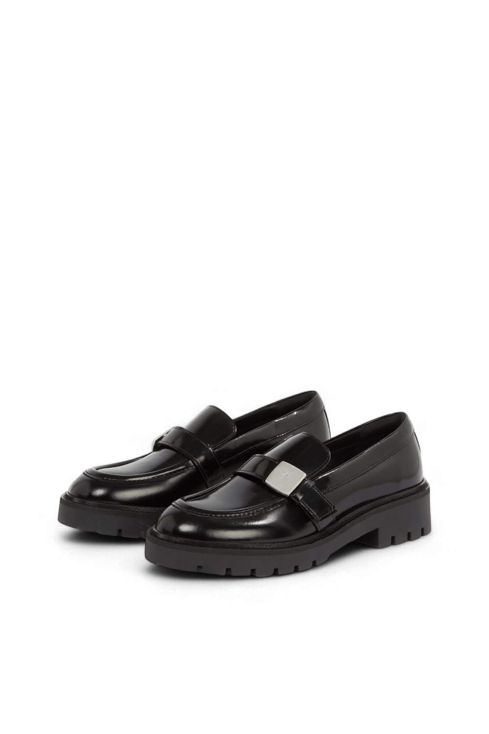 נעלי מוקסינים מבית Calvin Klein, מיוצרות באירופה מעור לכה איכותי בצבע שחור, בשילוב אבזם כסוף עם לוגו המותג. בחלקה הפנימי ביטנה מעור טבעוני.