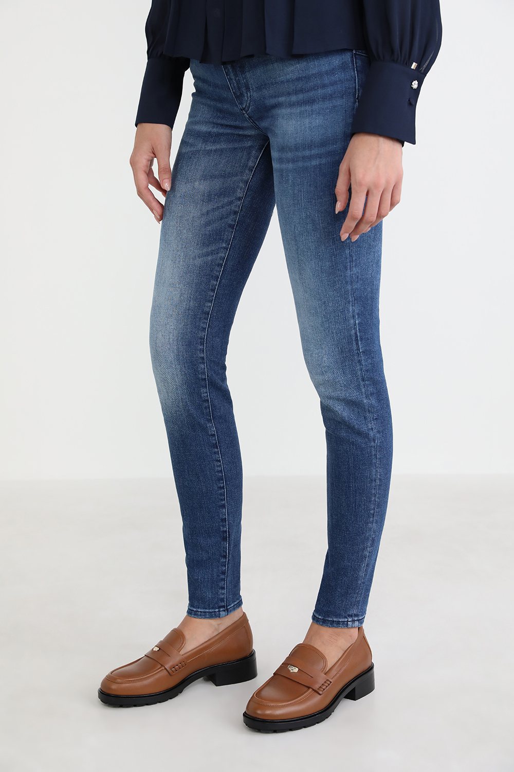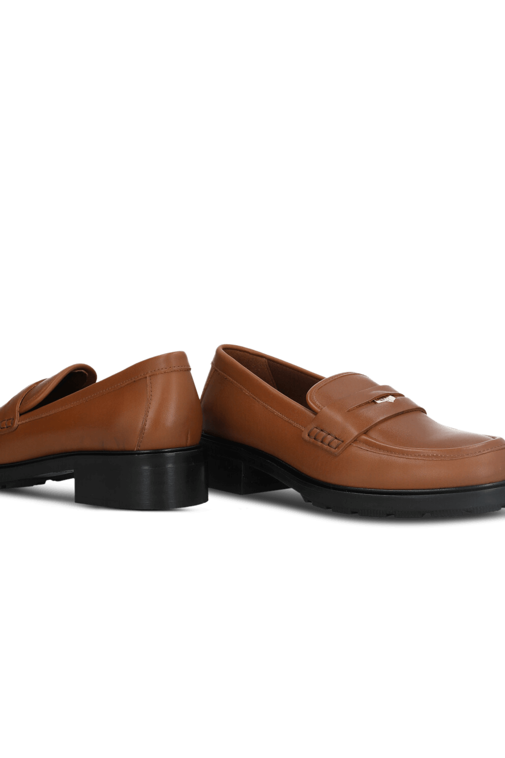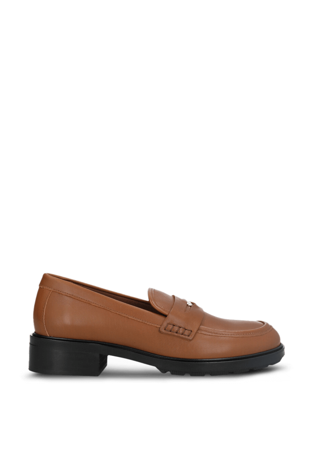 נעלי מוקסינים מבית Tommy Hilfiger, עשויות עור בצבע חום עם לוגו מטאלי בחזית וסוליית עקב נמוכה.