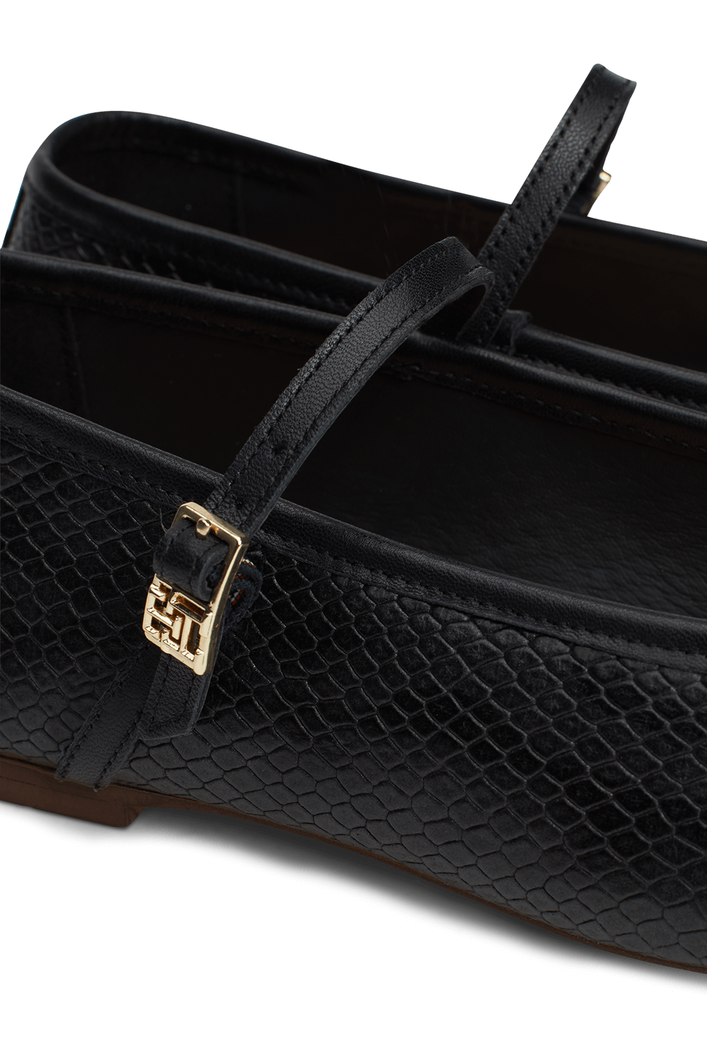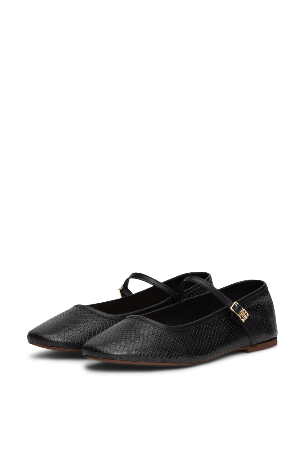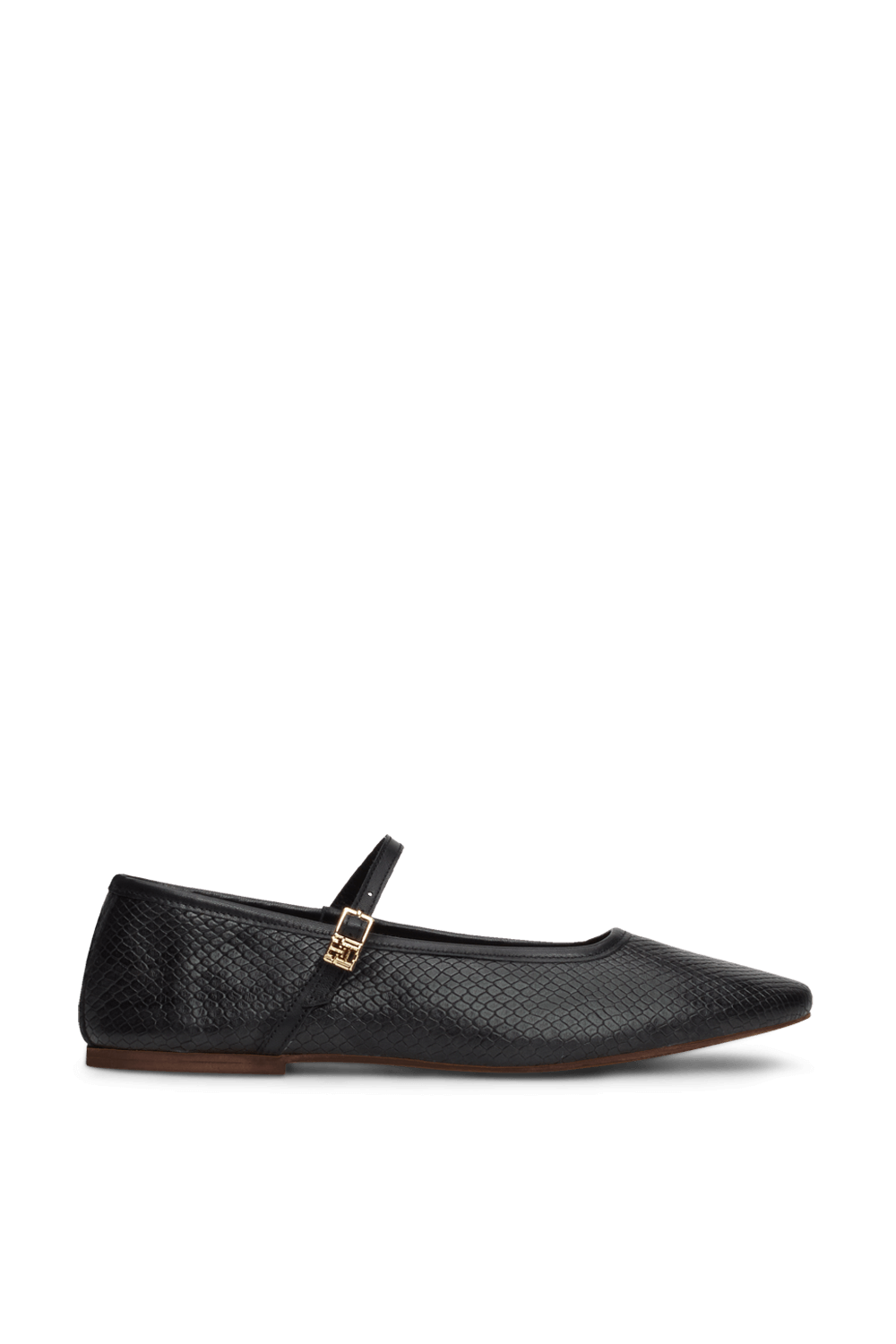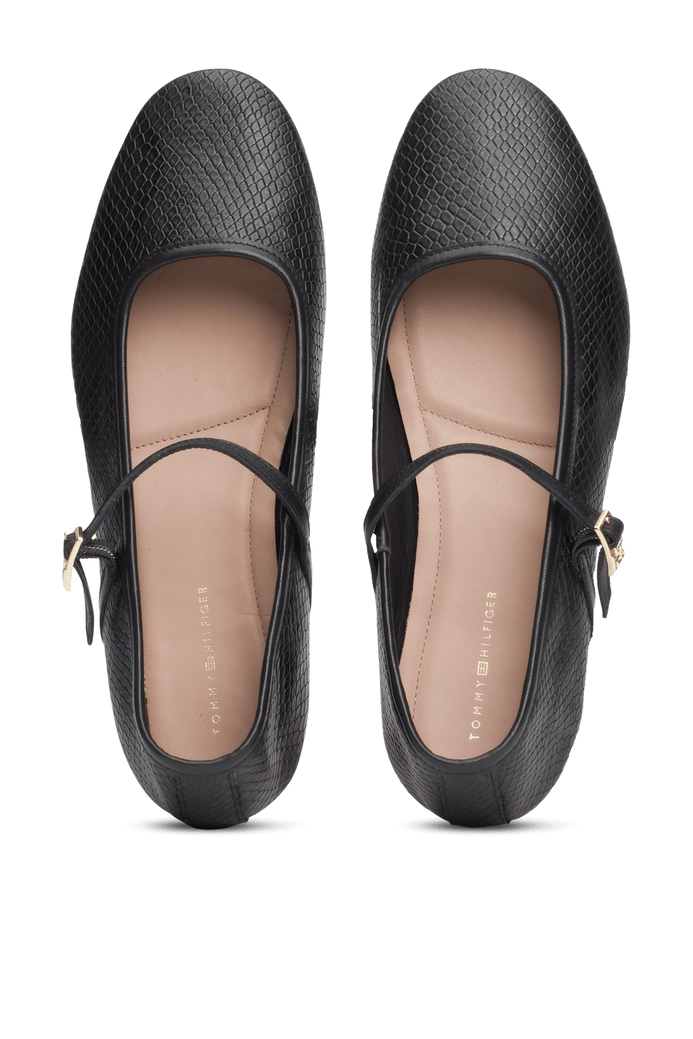 נעלי מרי ג'יין מבית Tommy Hilfiger. הן עשויות עור בצבע שחור בדוגמת קרוקו-רשת, עם ביטנת עור מרופדת ונוחה. נסגרות ברצועת עור עם תוספת אלסטית ובסגירת אבזם המעוצב כלוגו TH.