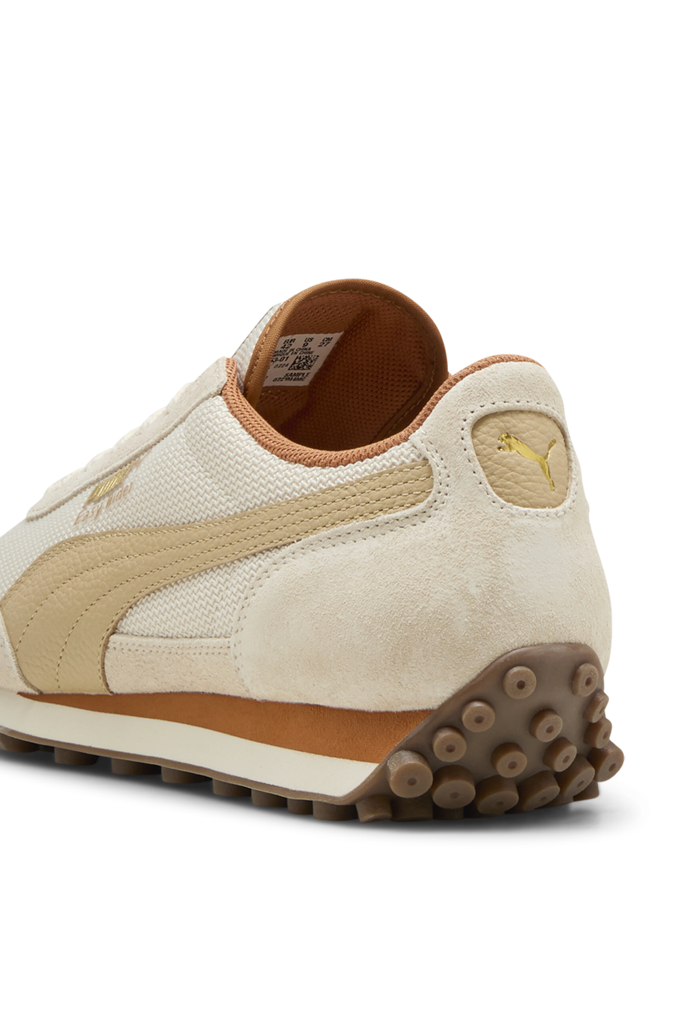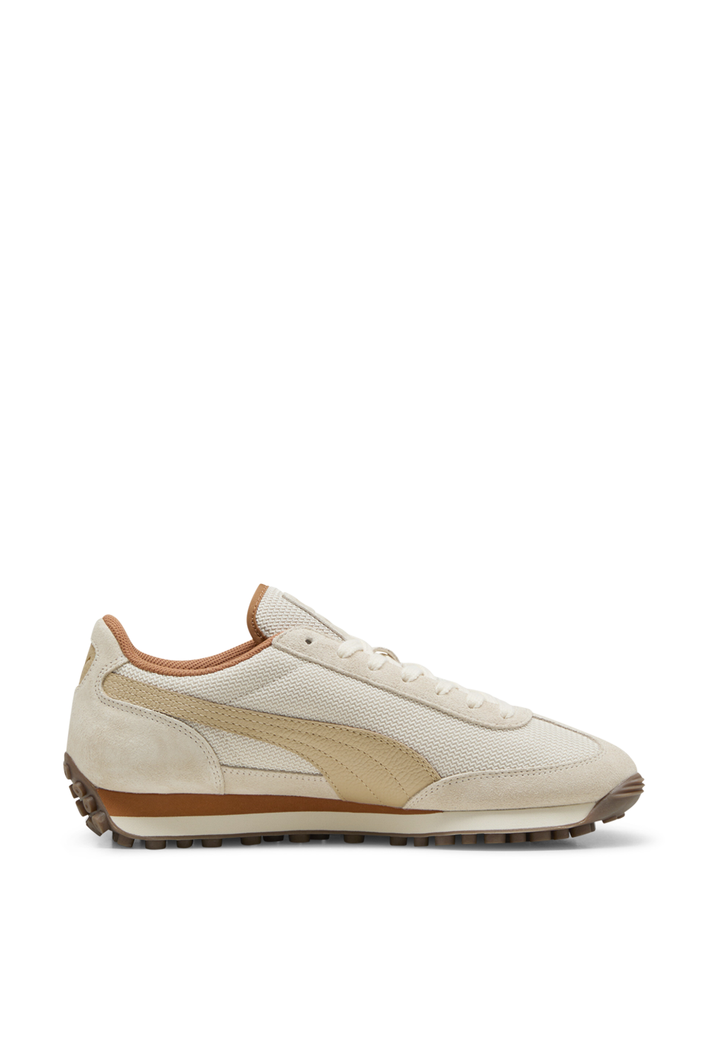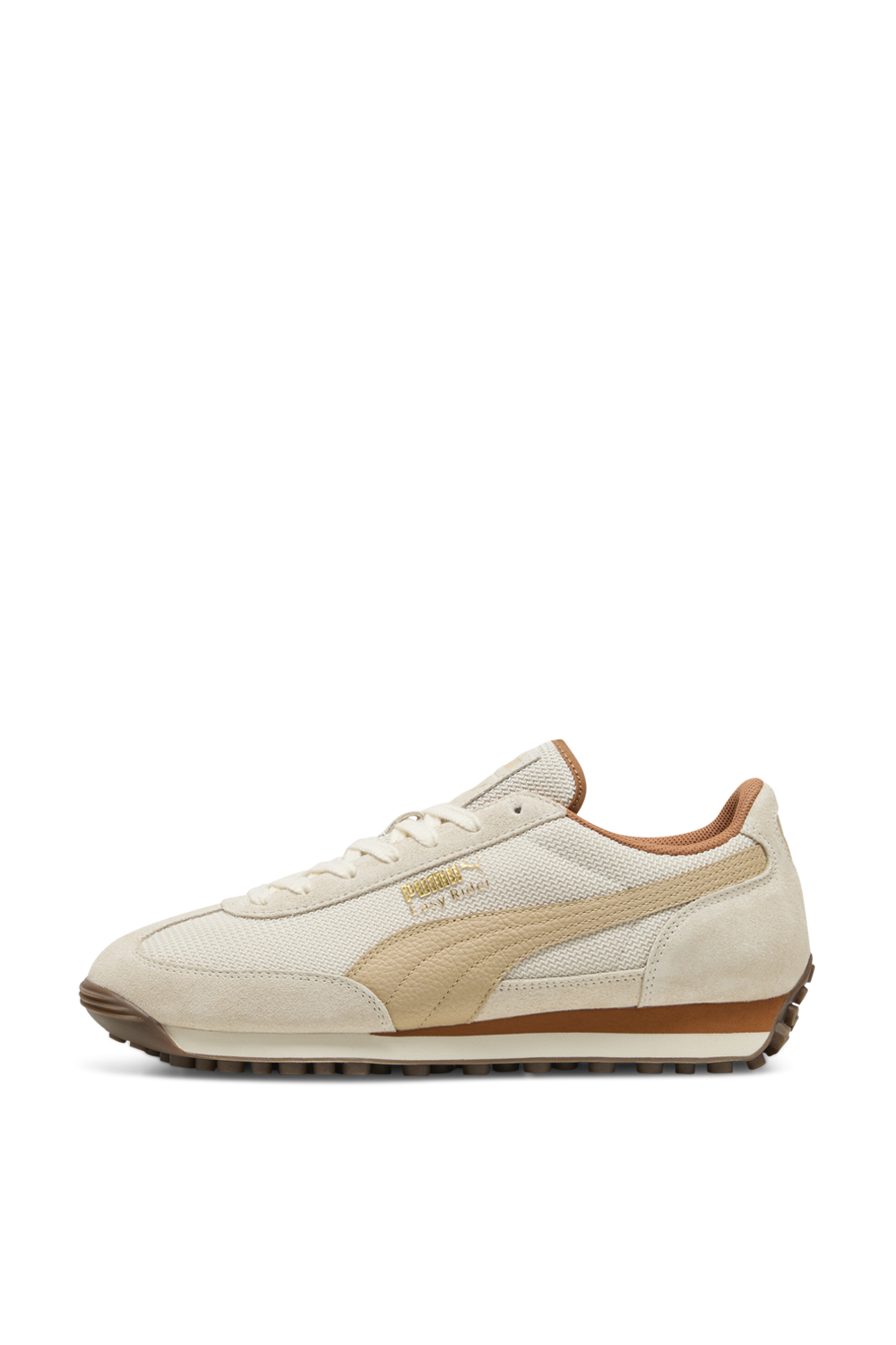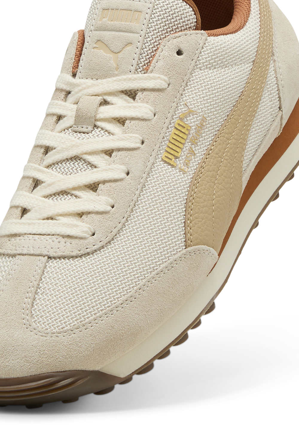 נעלי סניקרס Easy Rider מבית Puma, עשויות זמש ורשת בצבעי בז' בשילוב לוגו זהוב של המותג בצדדים. הנעליים מעוצבות בהשראת אופנת שנות ה-70, כשהריצה עשתה את המעבר ממסלולים לרחוב.