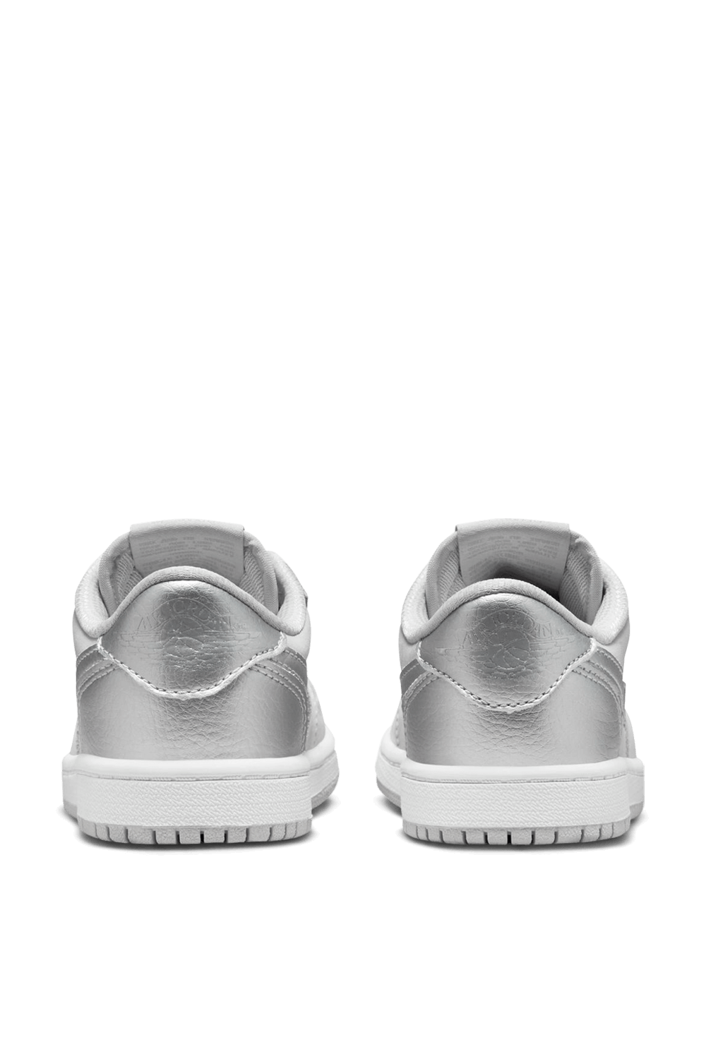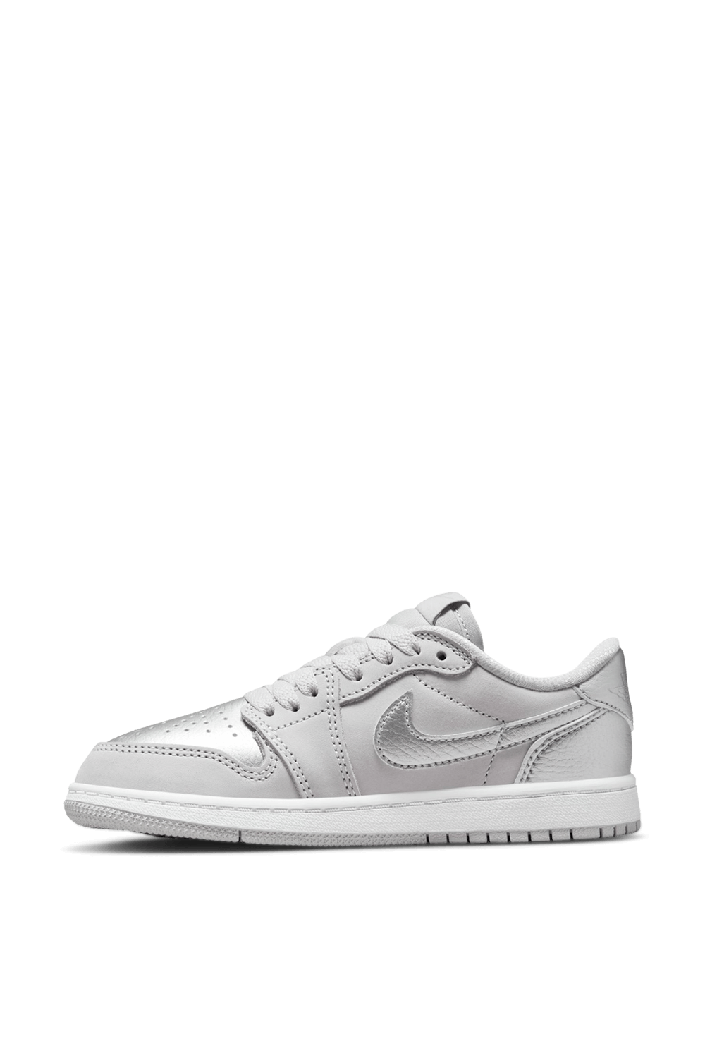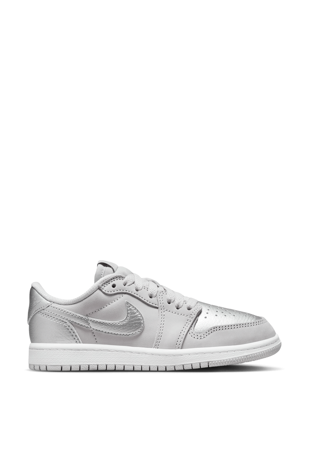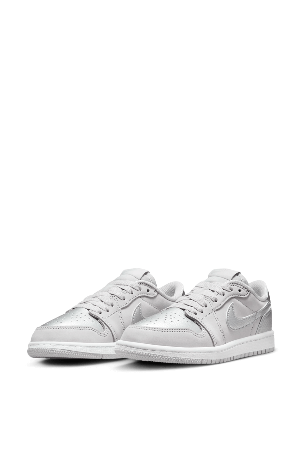 נעלי הסניקרס האייקוניות Air Jordan 1 Low SE של Nike בגרסה המעודכנת. החלק העליון עשוי עור ועור טבעוני בצבע כסוף, עם סוליית ניייקי אייר ורקמת אייר ג'ורדן מאחור בצבע לבן.