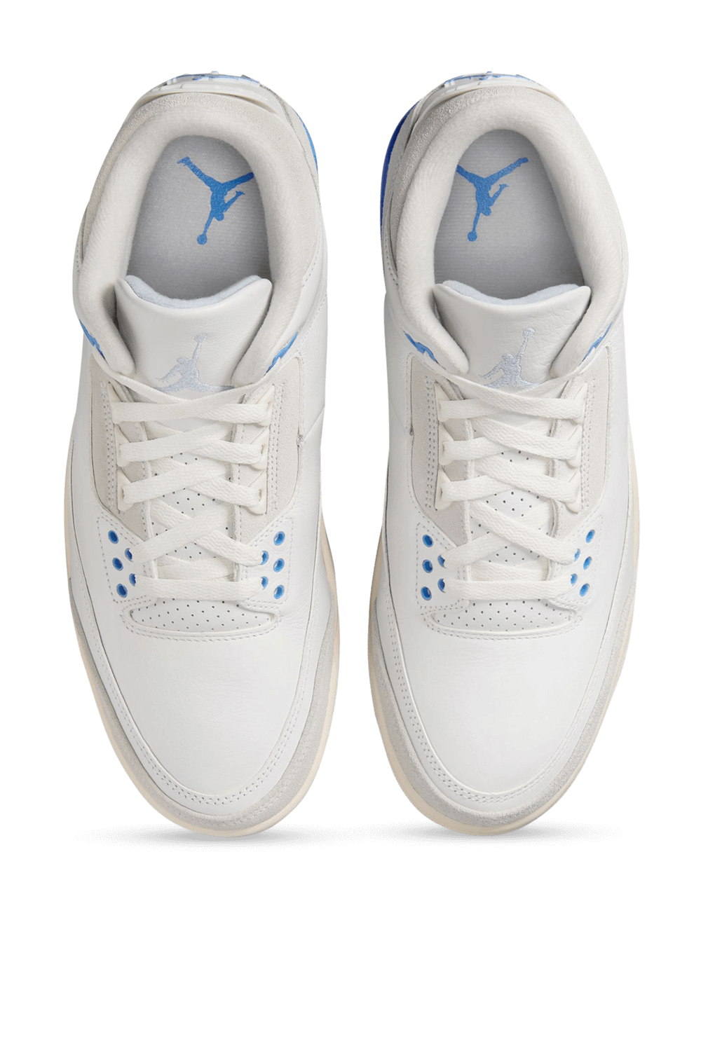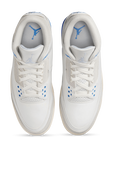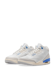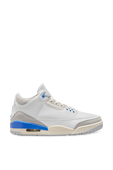 נעלי סניקרס Air Jordan 3 Retro מבית Nike, עשויות זמש ועור בצבע לבן ובגוון כחול יחודי - צבעם של מכנסי המזל שמייקל ג'ורדן נהג ללבוש מתחת למדי המשחק שלו במהלך הקריירה.