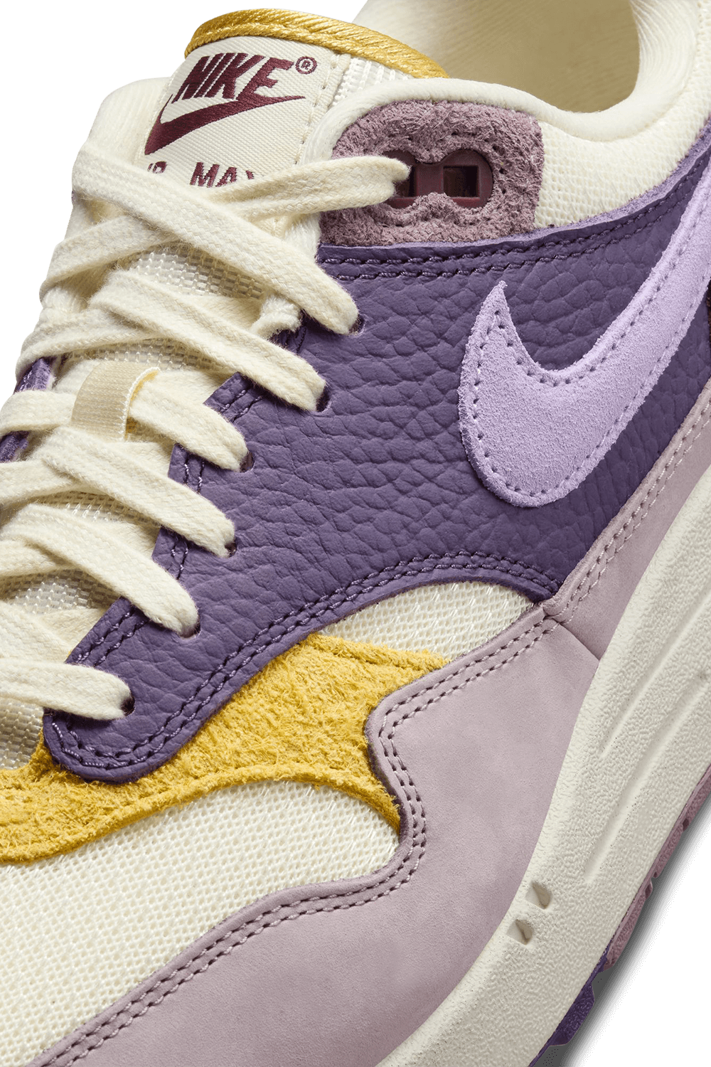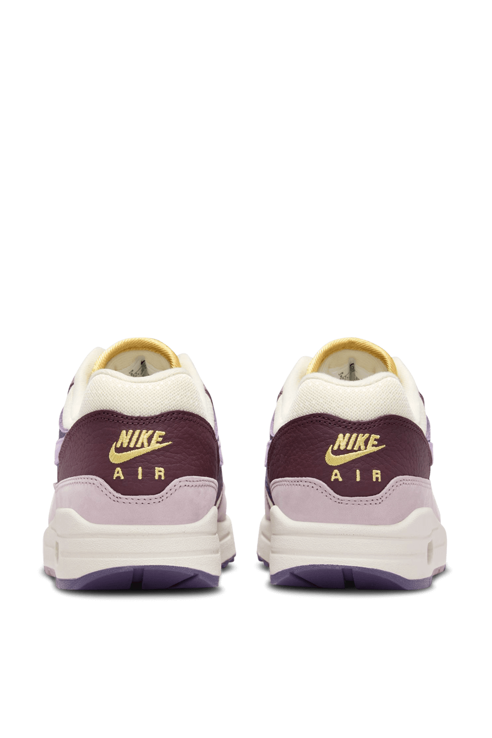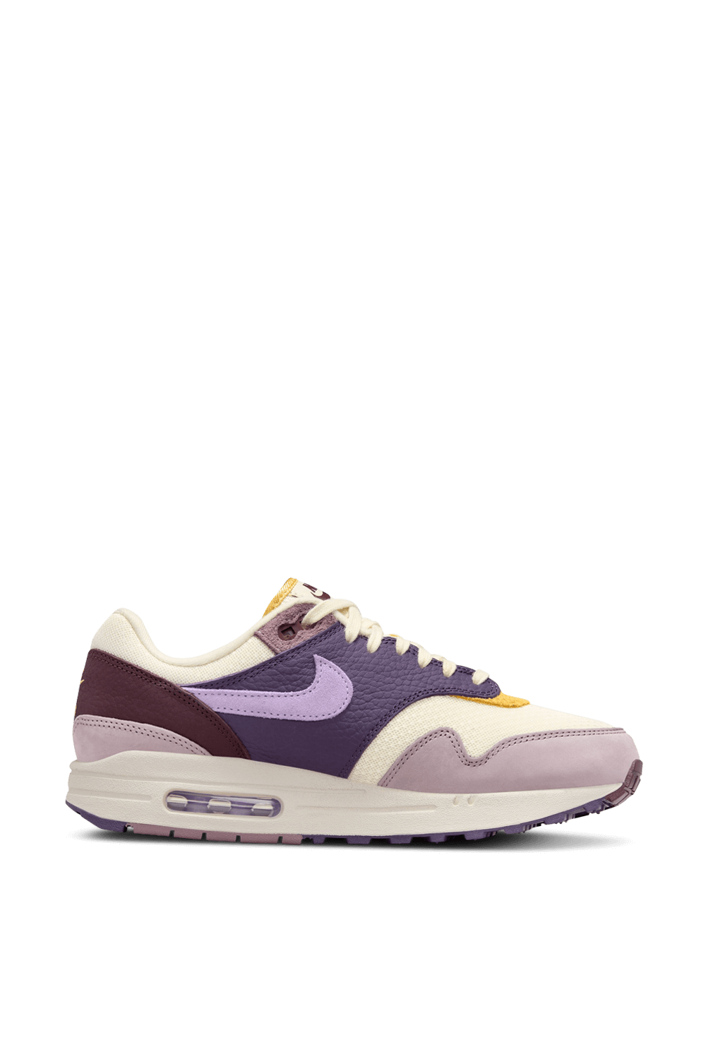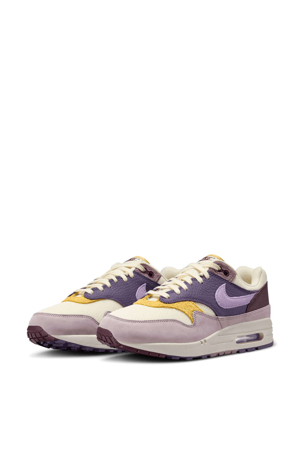 נעלי סניקרס Air Max 1 מבית Nike - הראשונות בסדרה ששילבו את טכנולוגיית האייר, עם עיצוב על זמני וסוליה מרופדת. הן עשויות עור בגווני סגול, לבן וצהוב ומעוצבות בהשראת הדגם האייקוני משנת 1987. יש להן סוליית קצף אמצעית נוחה במיוחד.