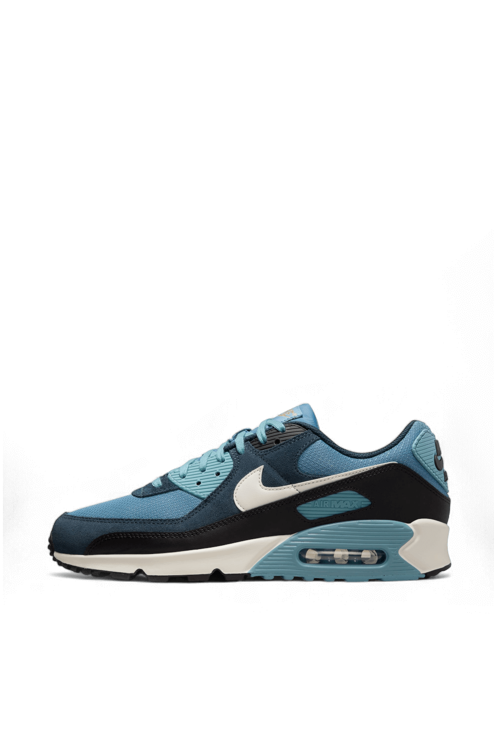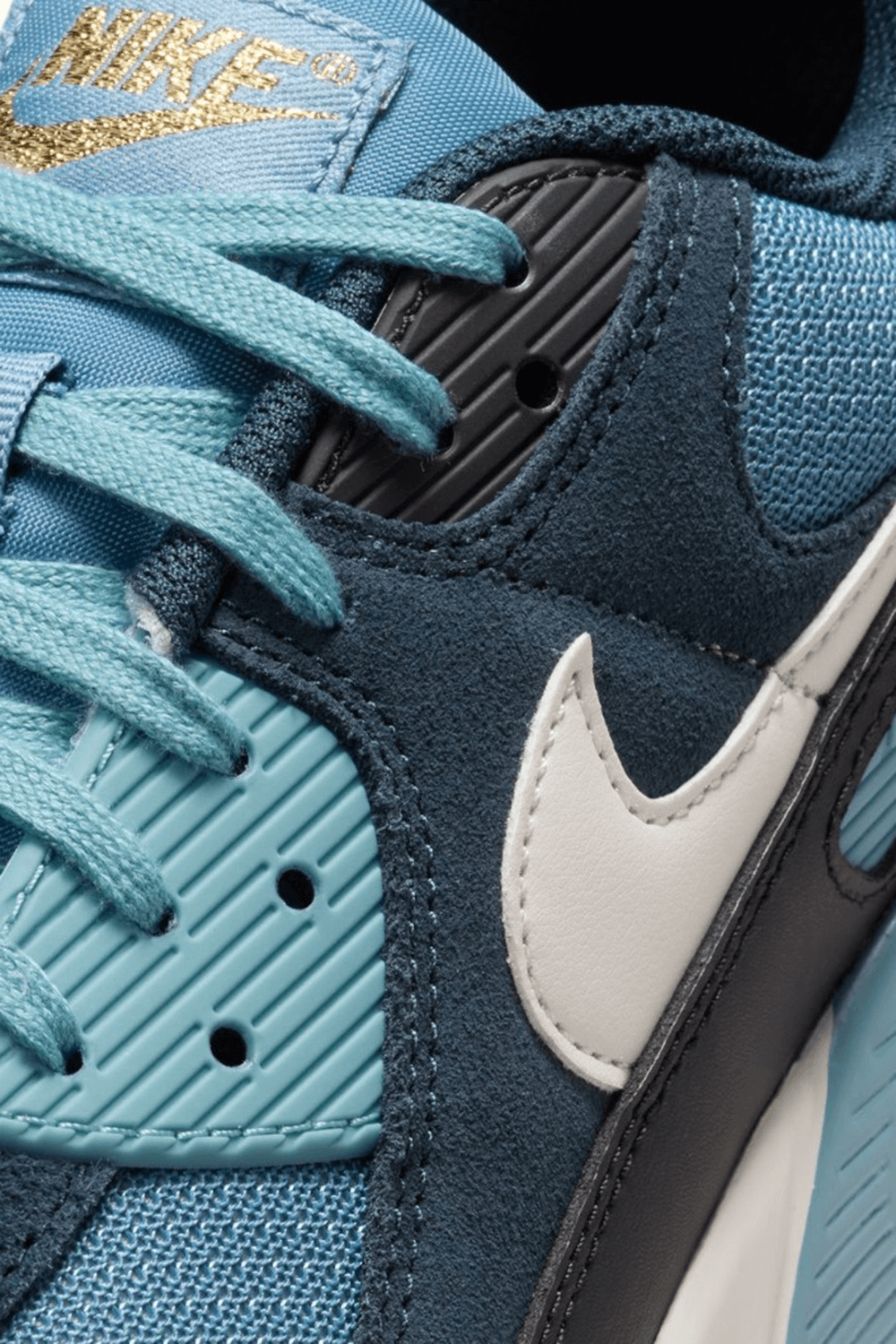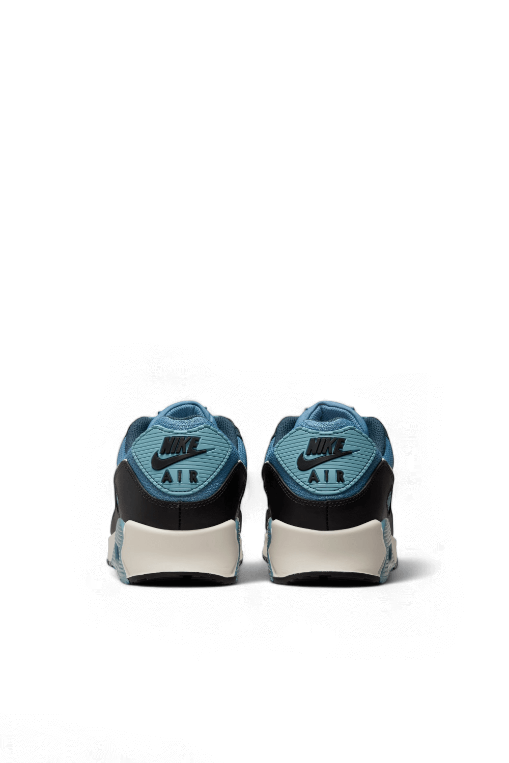 נעלי סניקרס Air Max 90 Premium מבית Nike, עשויות תערובת עור טבעוני, טקסטיל וזמש בגווני כחול כהים ובהירים. לנעליים מרקם וופל בתוספת ריפוד Nike Air שתוכנן במקור עבור ריצה, בשילוב סוליית גומי המספקת שיפור במתיחה. הנעליים מעוצבות בהשראת שנות ה-90 אשר היוו נקודת מפנה בתרבות, אומנות, אופנה ונעלי ספורט.
