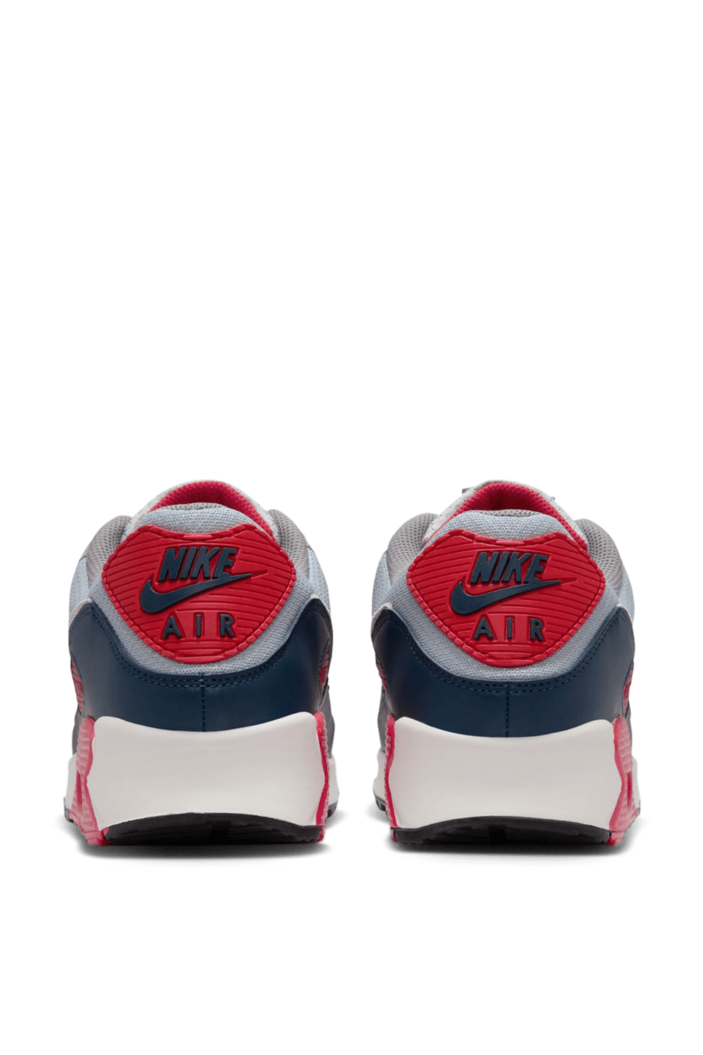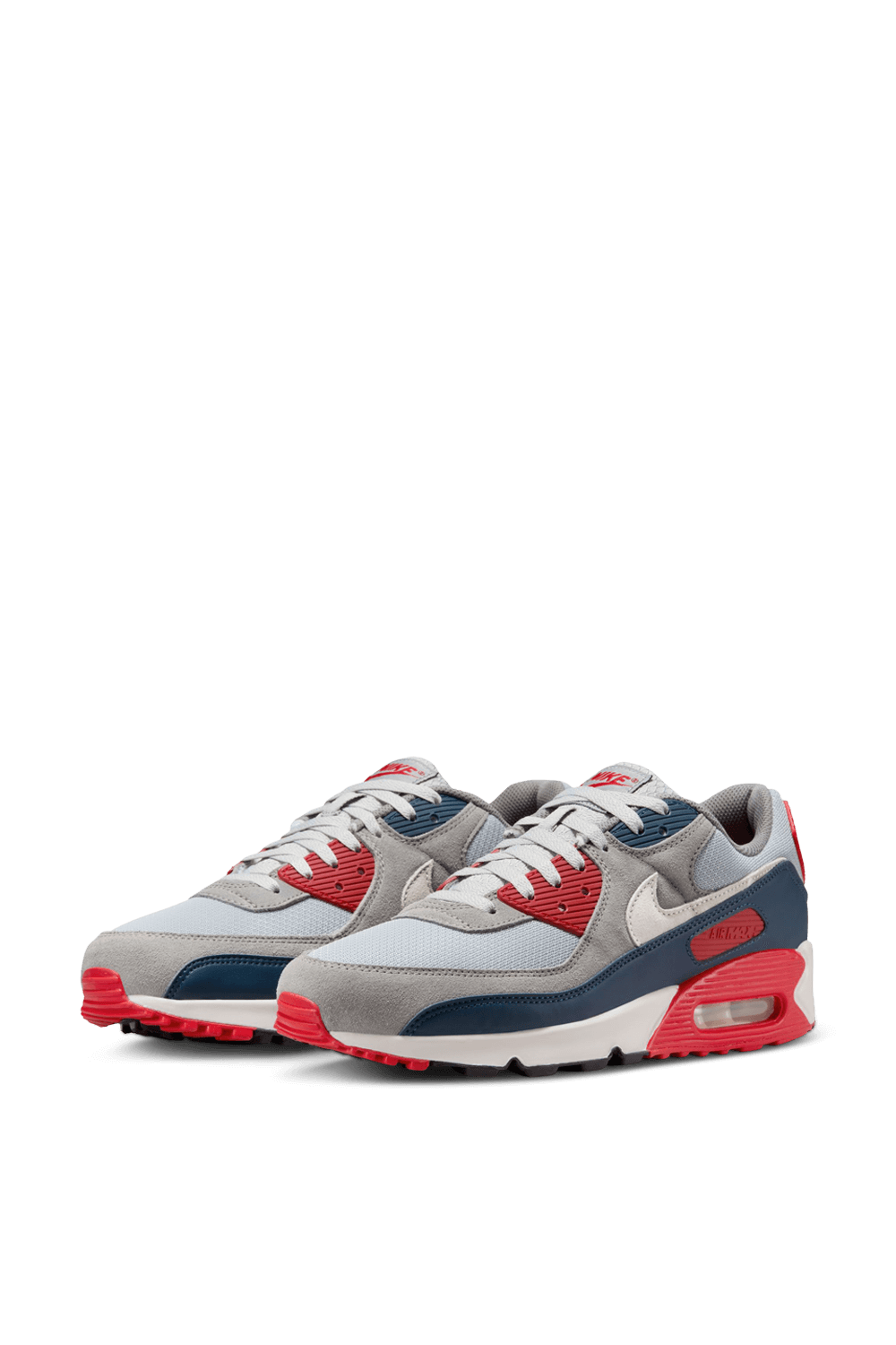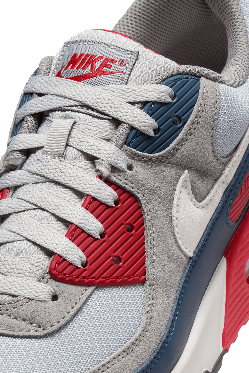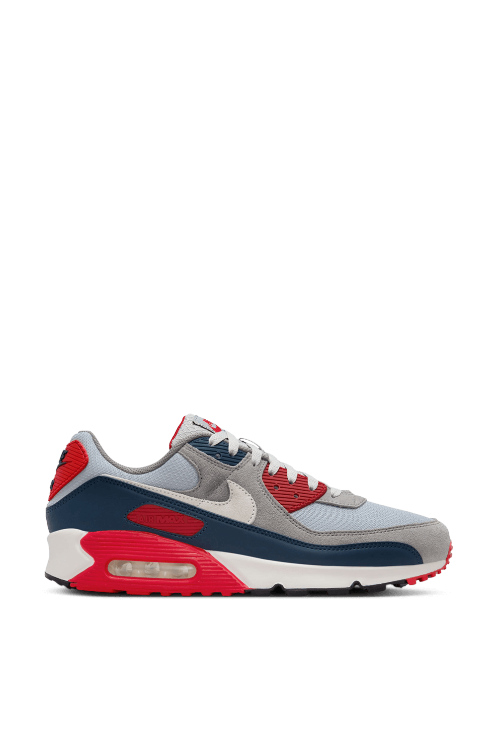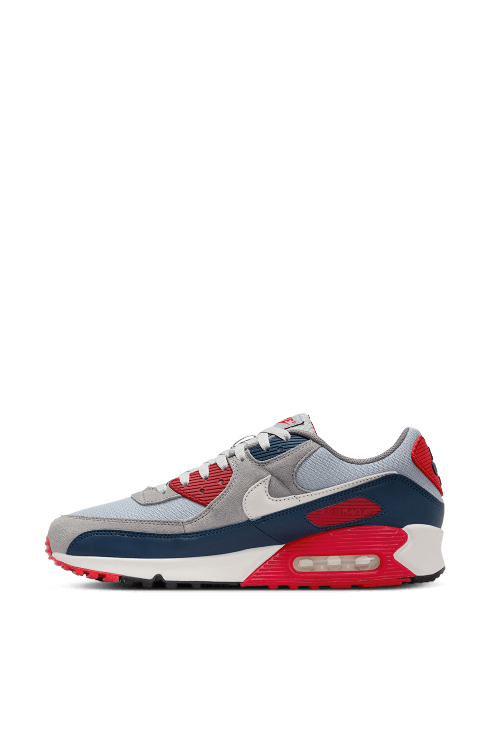 נעלי סניקרס Air Max 90 מבית Nike Nbhd, עשויות טקסטיל בצבעי אדום, כחול ואפור בשילוב רשת וזמש, כשהן מעוצבת כחלק ממהדורה החוגגת את הגאווה והאתלטיות של ארצות הברית.
