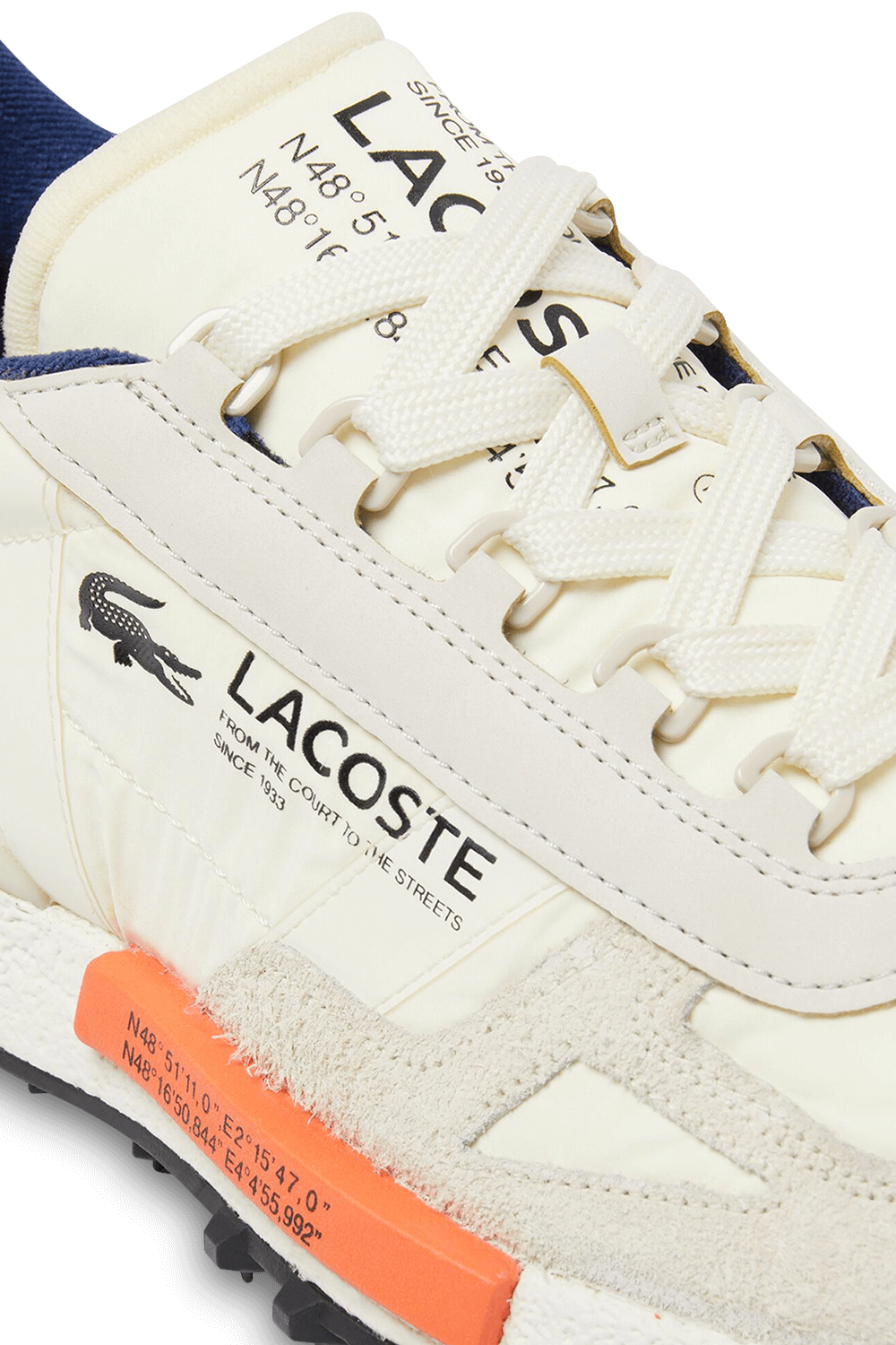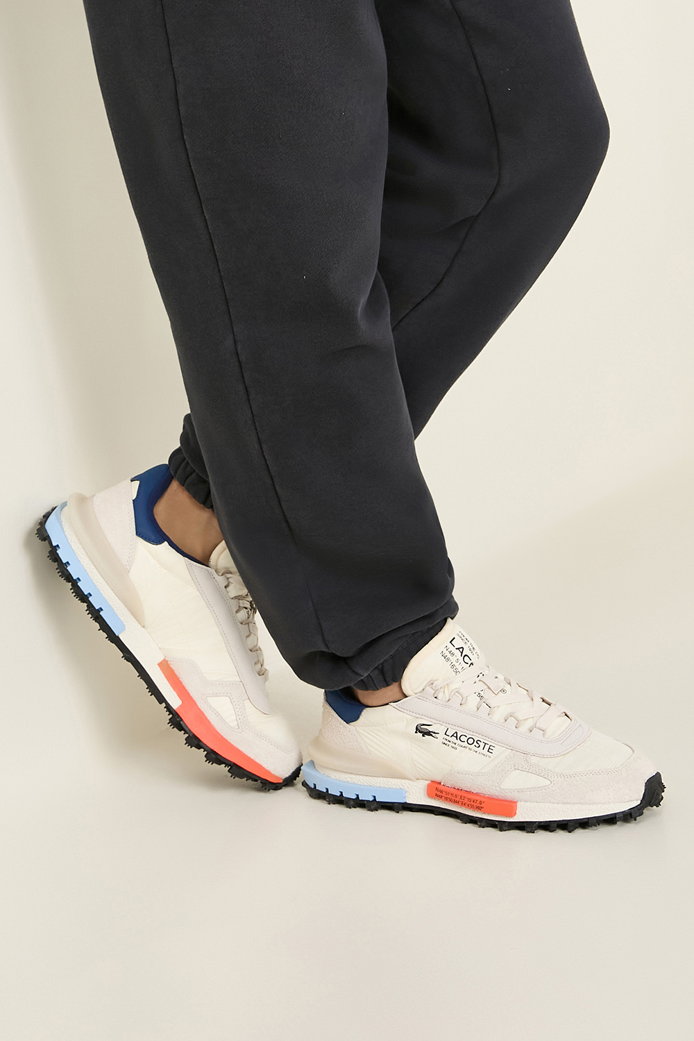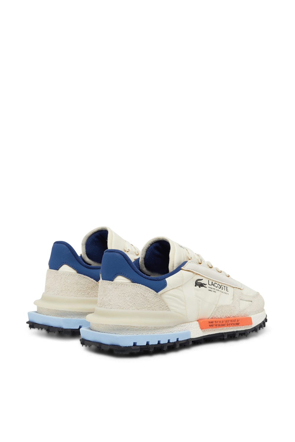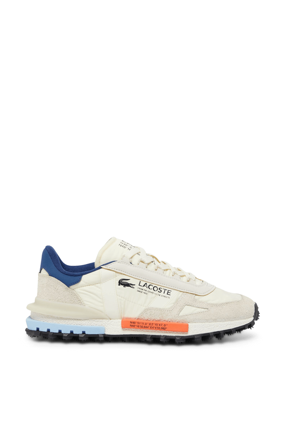 נעלי סניקרס דגם Elite Active מבית Lacoste, המעוצבות בסגנון וינטג', בהשראת ארכיון המותג. הן עשויות ניילון וזמש בצבעי אפור ולבן עם דיטיילים בכחול ובכתום, עם הדפס לוגו בצד.