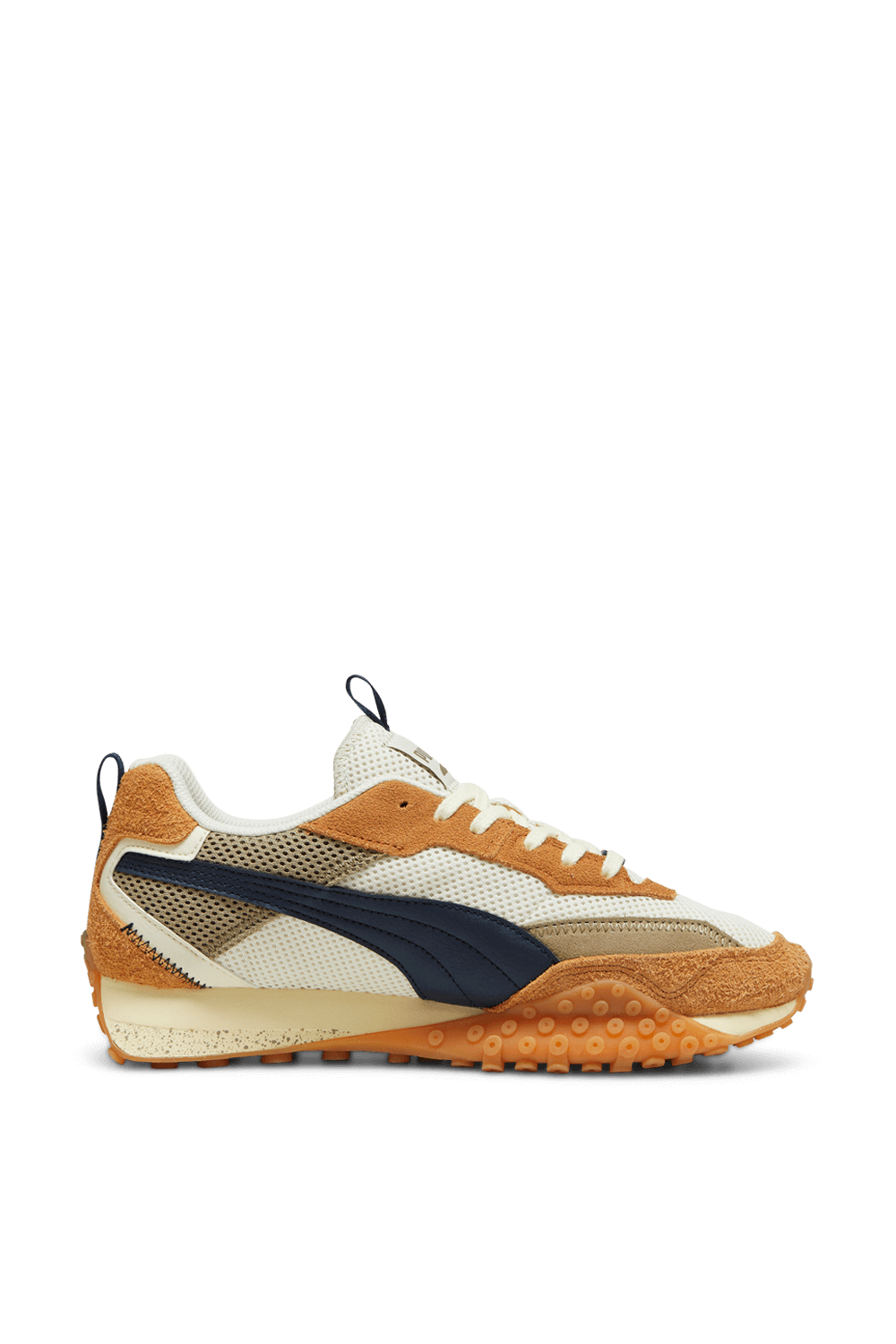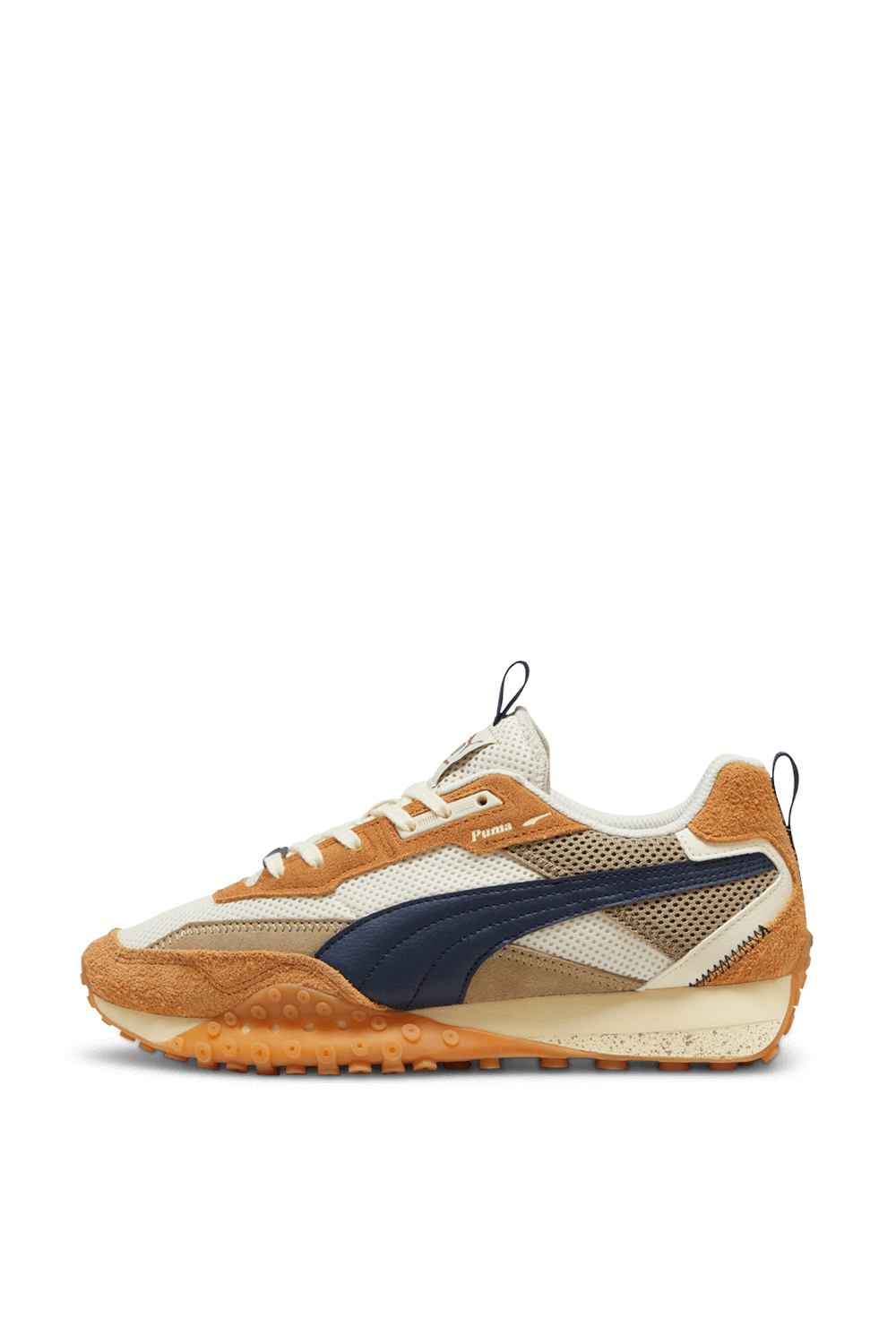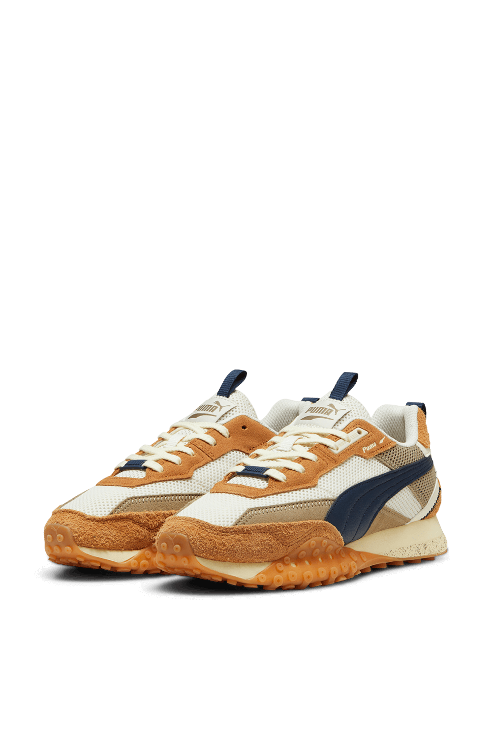 נעלי סניקרס Blacktop Rider מבית Puma, עם סוליה צ'אנקית בהשראת ארכיון נעלי הטיולים והמסעות של המותג משנות ה-80. עשויות רשת, עור וזמש בצבעי חום, ירוק וכחול וסוליית קצף EVA נוחה.