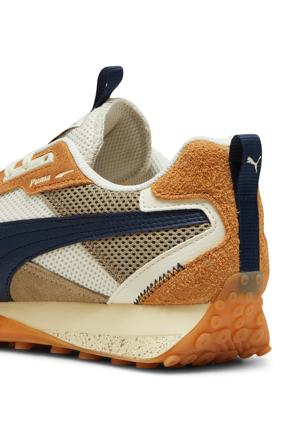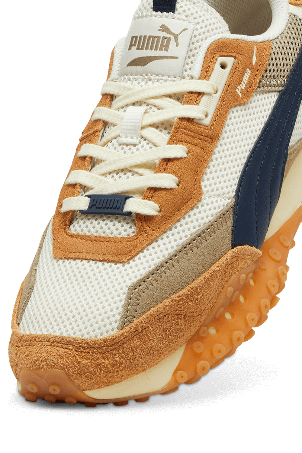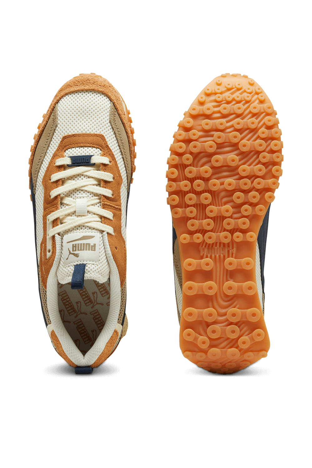 נעלי סניקרס Blacktop Rider מבית Puma, עם סוליה צ'אנקית בהשראת ארכיון נעלי הטיולים והמסעות של המותג משנות ה-80. עשויות רשת, עור וזמש בצבעי חום, ירוק וכחול וסוליית קצף EVA נוחה.