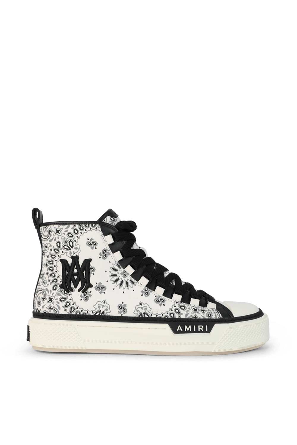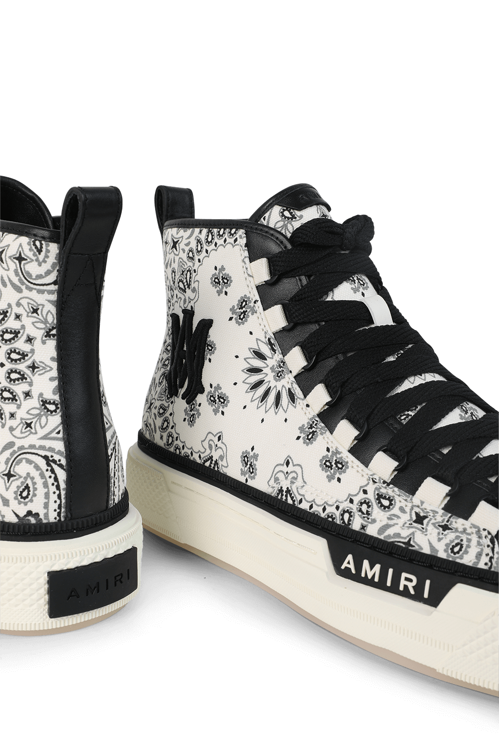 נעלי סניקרס ברכיסה גובהה דגם Bandana מבית Amiri, עשויות כותנה עם הדפס פייזלי בגווני שחור ולבן עם לוגו שחור רקום בצד.