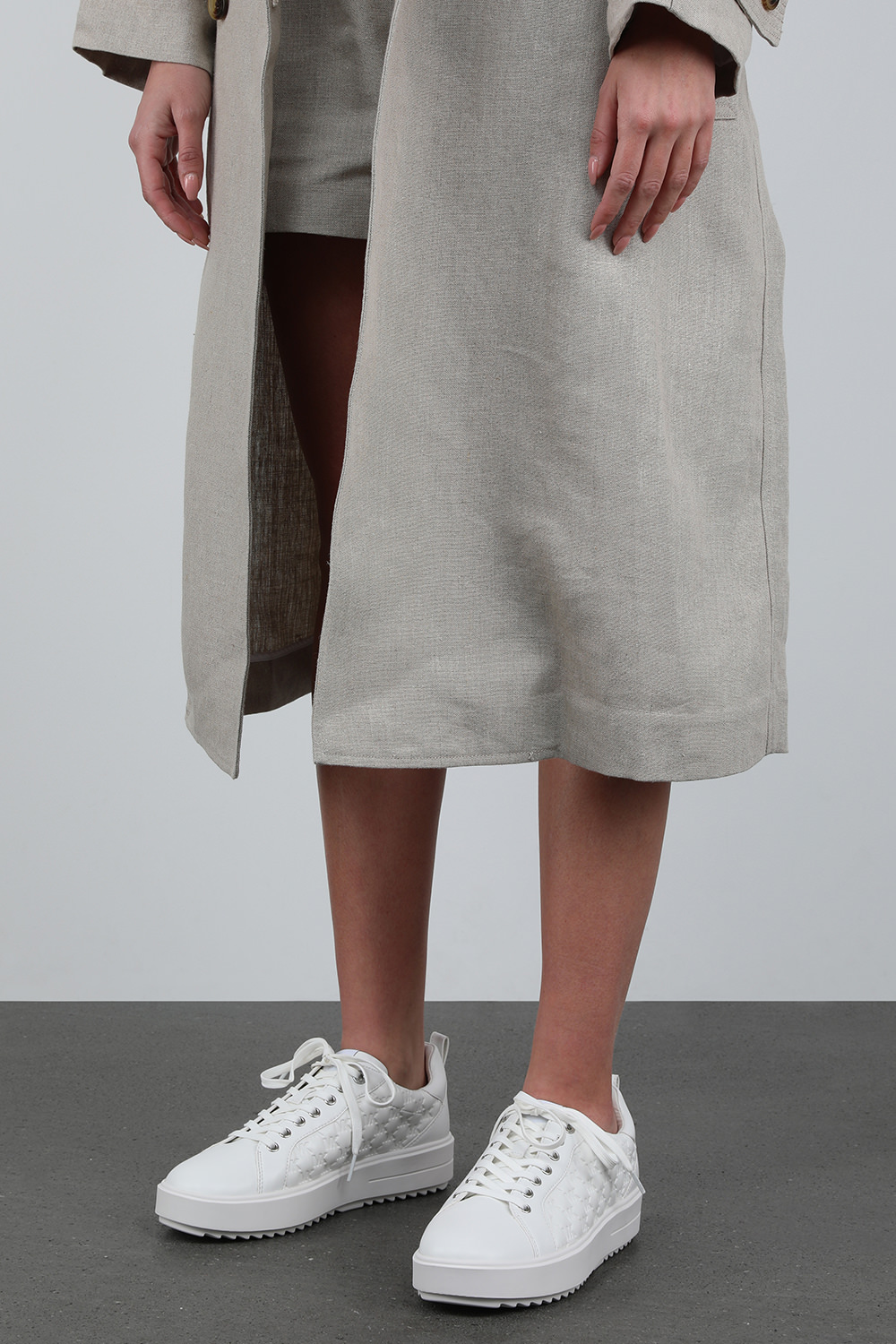 נעלי סניקרס מבית האופנה היוקרתי מייקל קורס. דגם זה עשוי טקסטיל משובח בגוון לבן המציג את אותיות הלוגו בסגנון טונאלי. סוליות יציבות עם תחתית שיני כריש למניעת החלקה וכתוספת סטייל משגע ומשלימה את עיצובן המוקפד.