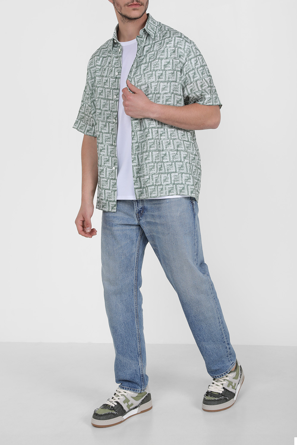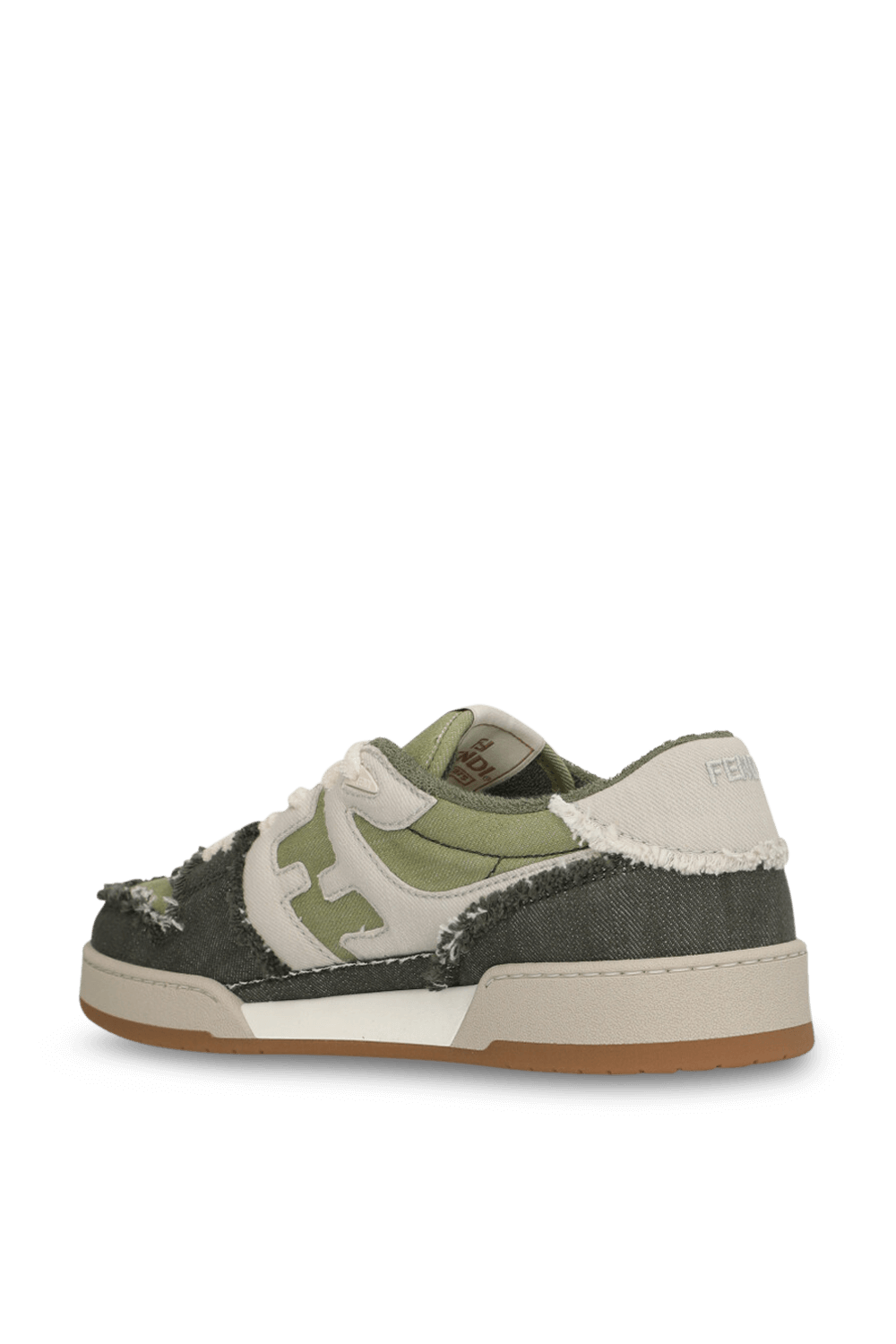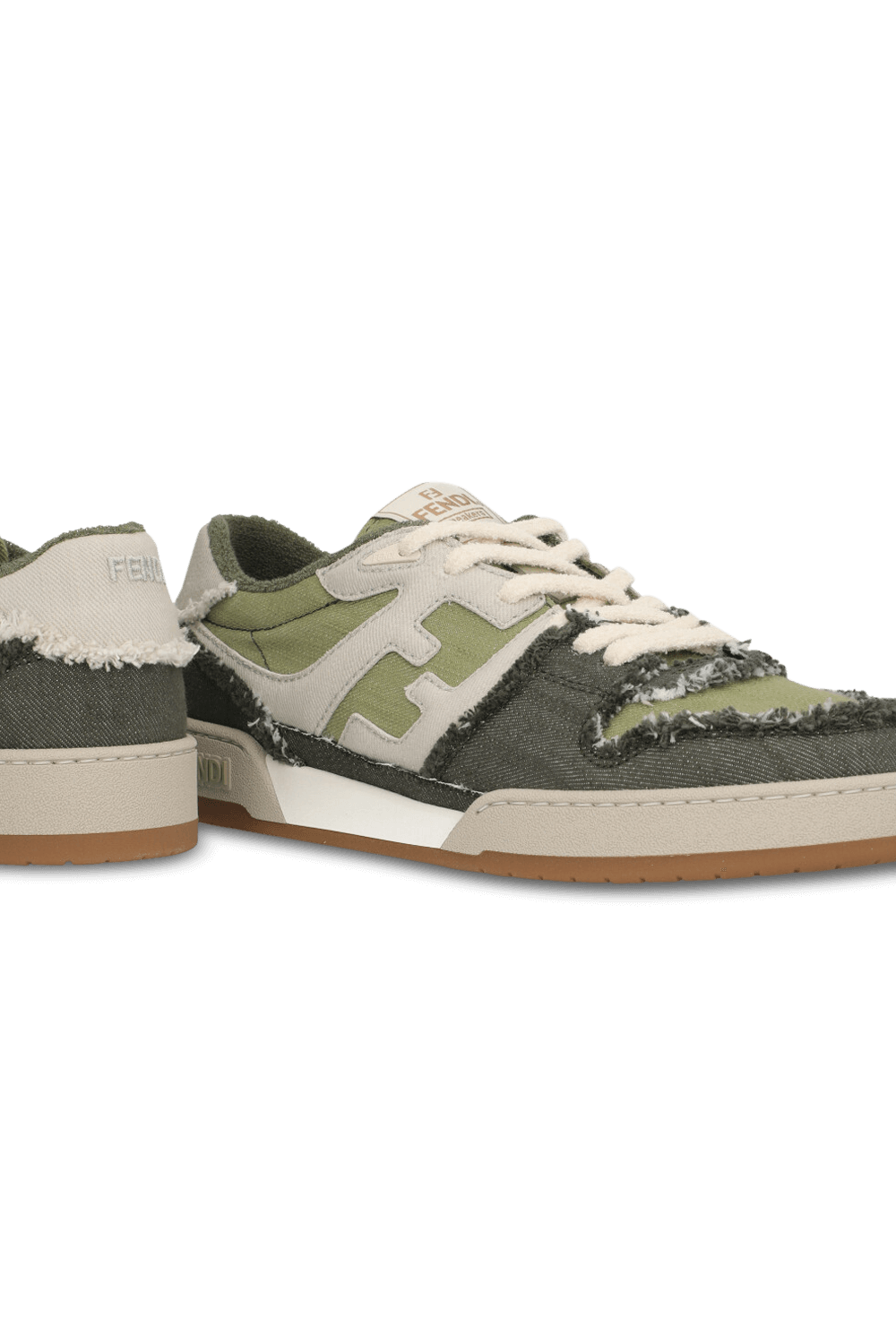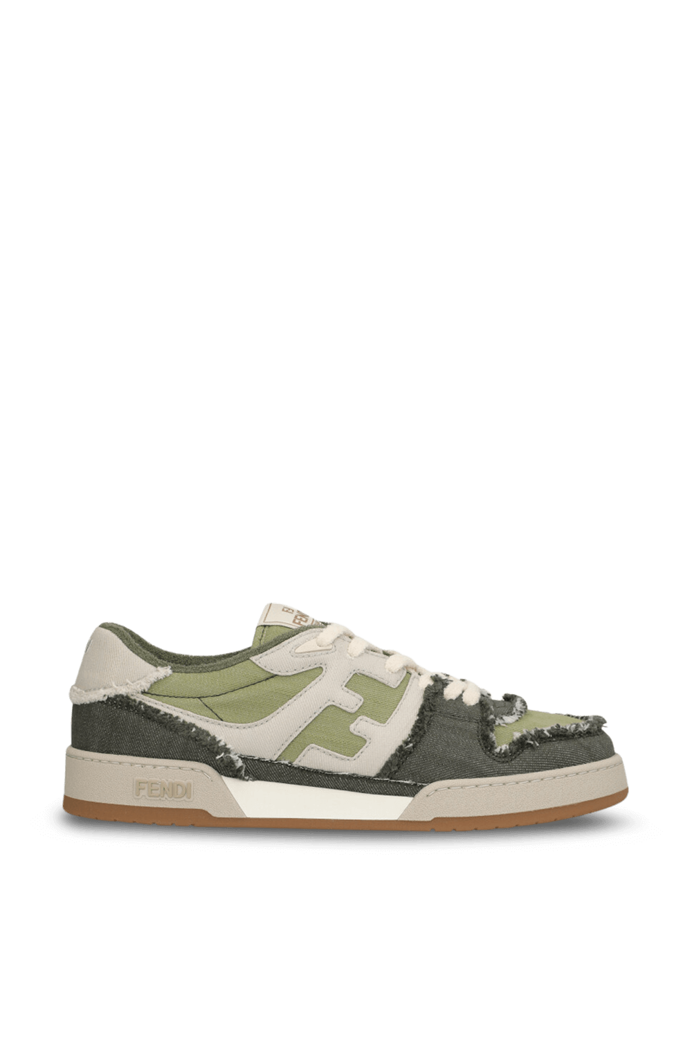 נעלי סניקרס ברכיסה נמוכה מבית Fendi, עשויות כותנת דנים בצבעים ירוק ובז' עם לוגו בצדדים ובלשונית הנעל.