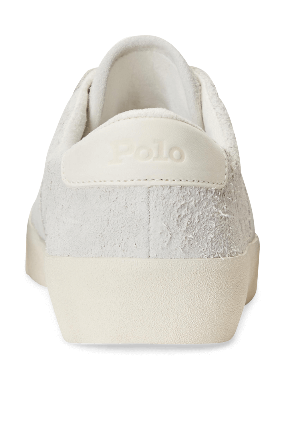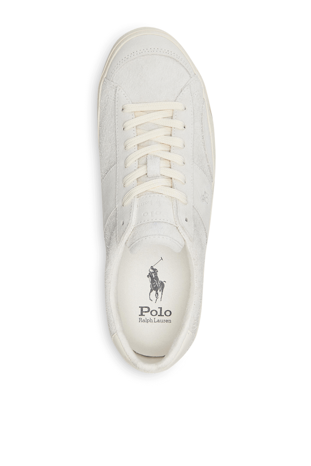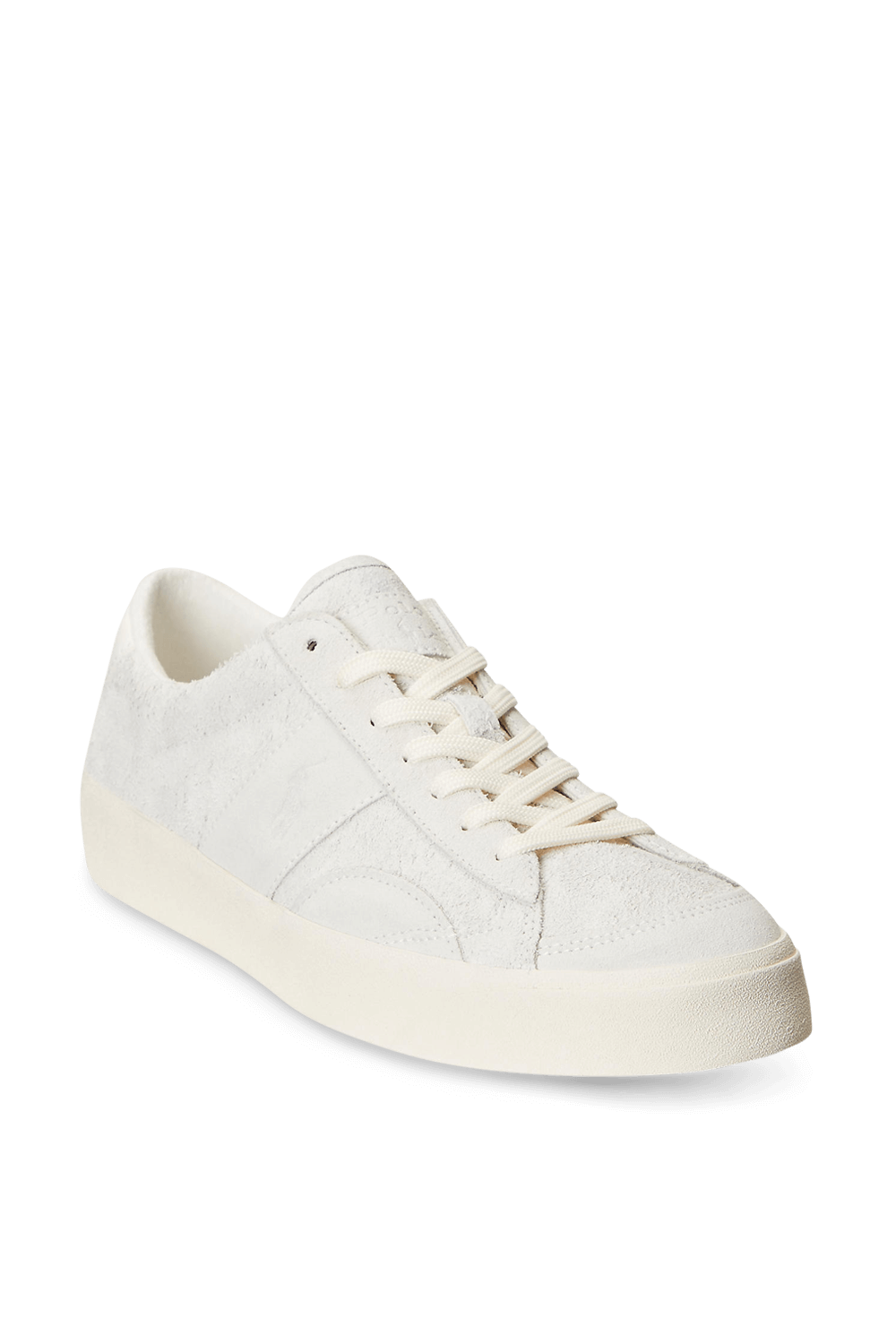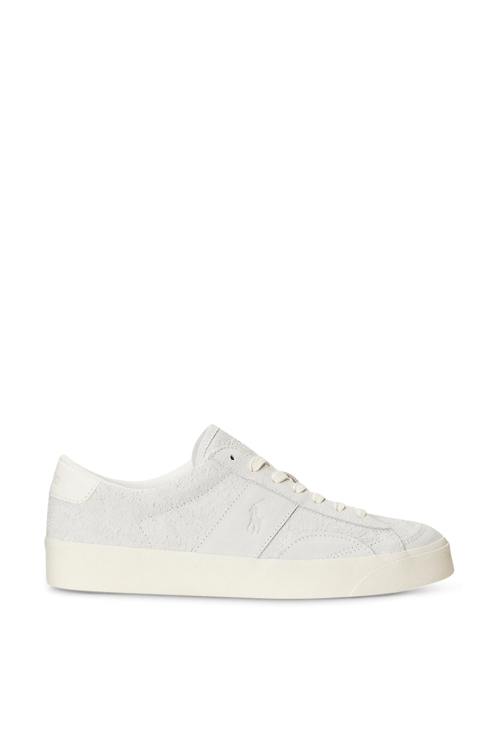 נעלי סניקרס מבית Polo Ralph Lauren, עשויות עור זמש בצבע אוף וייט כשלוגו המותג רקום בצד הנעל וברכיסה נמוכה.