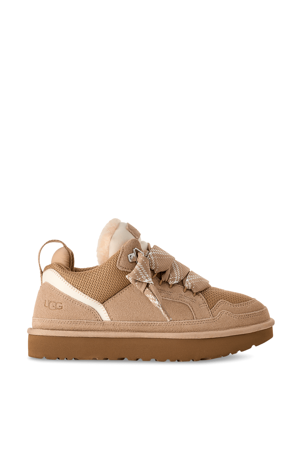 נעלי סניקרס Lowmel מבית Ugg, עשויות זמש בצבע חום בהיר בשילוב בטנת UGGplush™ עשויה צמר רך ונעים בצבע לבן. לנעליים שרוכים רחבים שמיועדים ללבישה משוחררת. סוליית הנעליים SugarSole™ עשויה תערובת קנה סוכר ומאפשרת להפחית את התלות בדלק מאובנים.