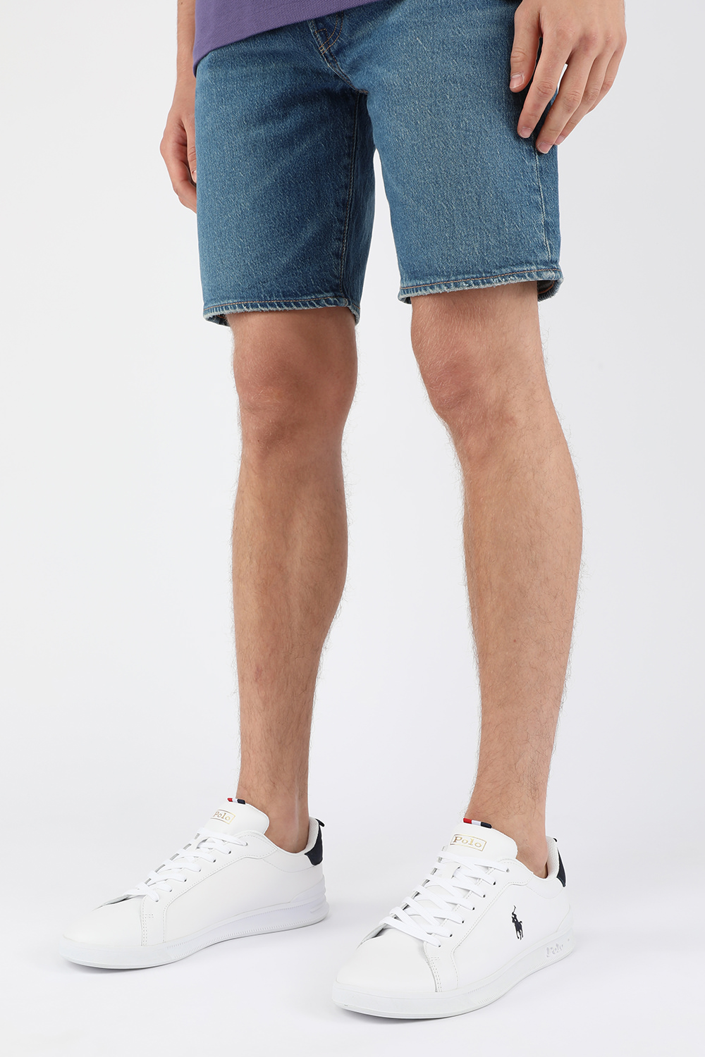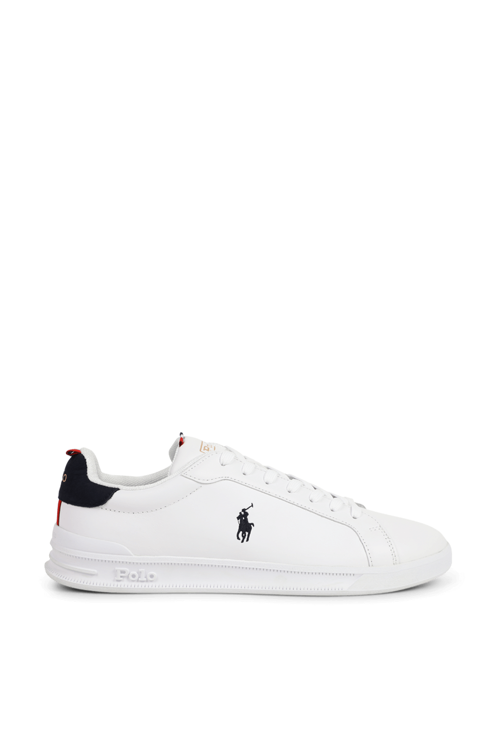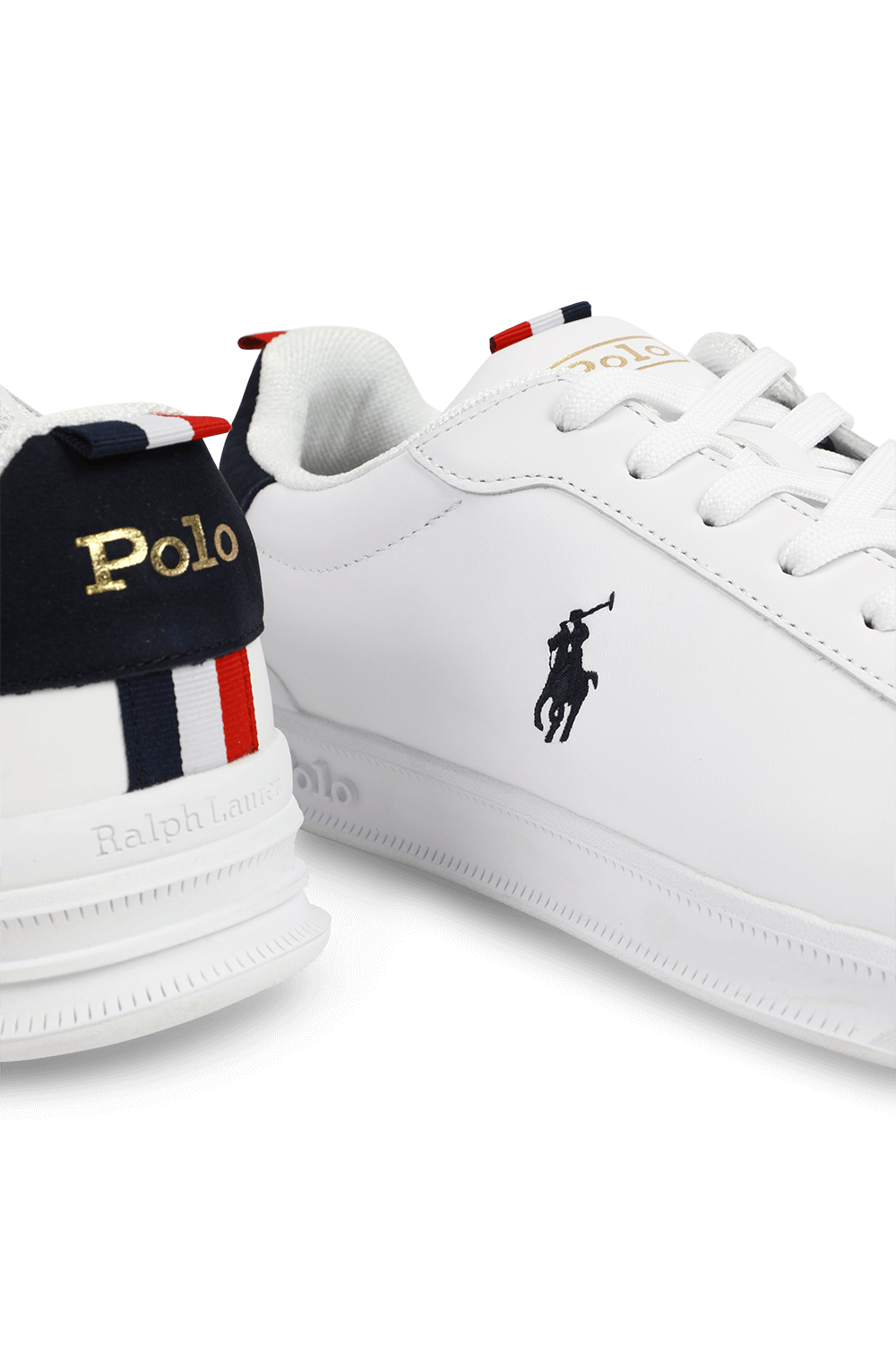 נעלי סניקרס מבית Polo Ralph Lauren. נעליים העשויות 100% עור משובח בגוון לבן עם תפרים בולטים. לפריט צללית קלאסית ברכיסה נמוכה כאשר לוגו המותג הרקום על צידי הגפות בחוט כחול, בעוד שפאנל אחורי ממותג בגוון כחול הכולל רקמה בגווני המותג משלימים את העיצוב הלוגומאני של הנעליים.