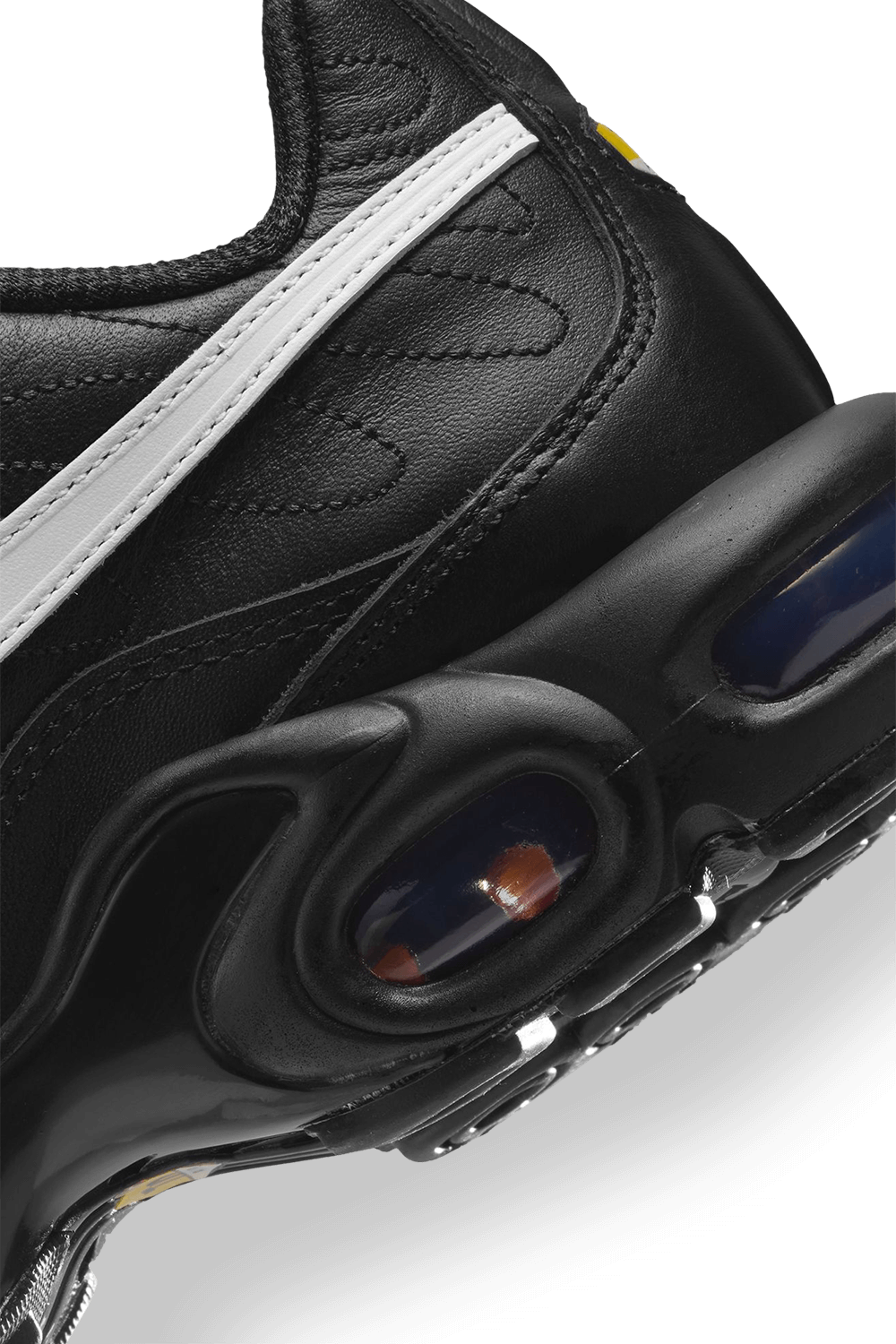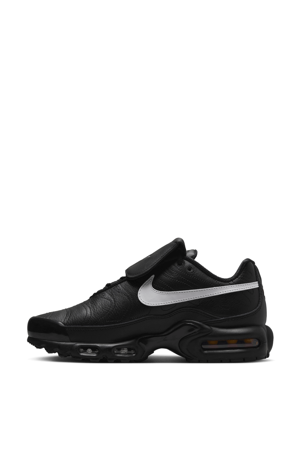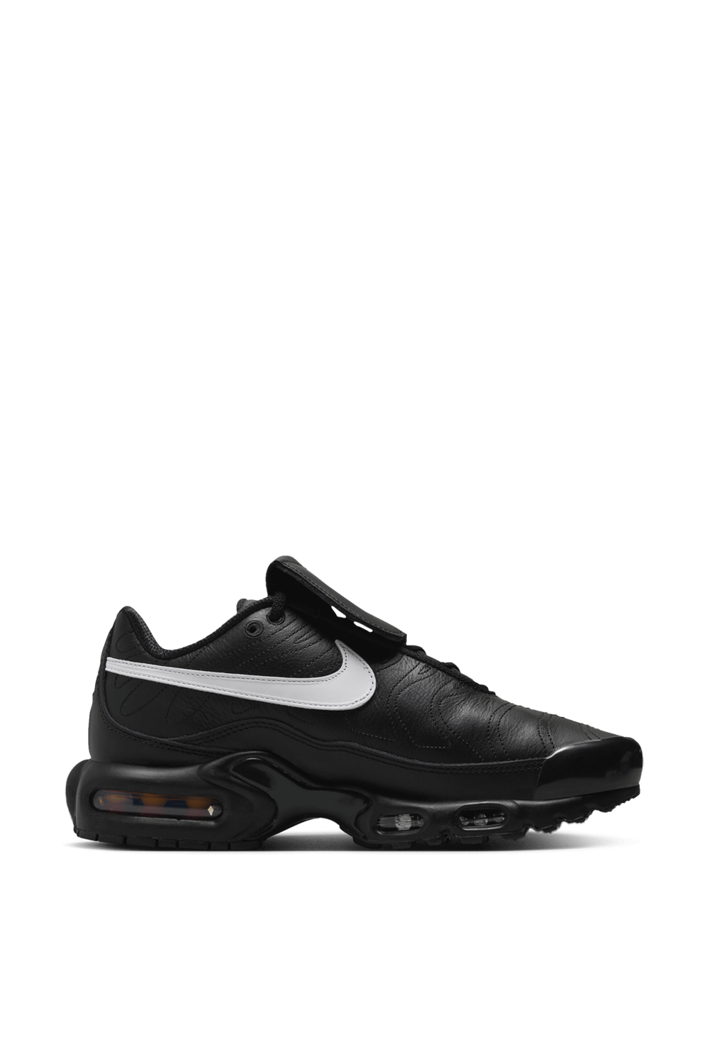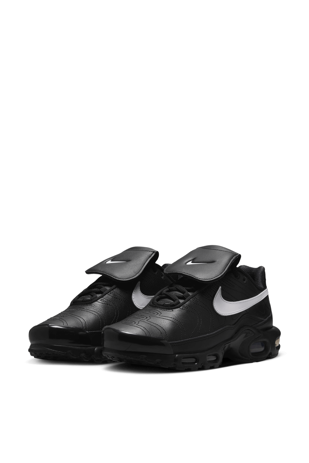 נעלי סניקרס Air Max Plus מבית Nike Nbhd, עשויות טקסטיל בצבע שחור ובעיצוב תיפורים בשילוב לשונית בולטת בחזית וסוליה צ'אנקית.