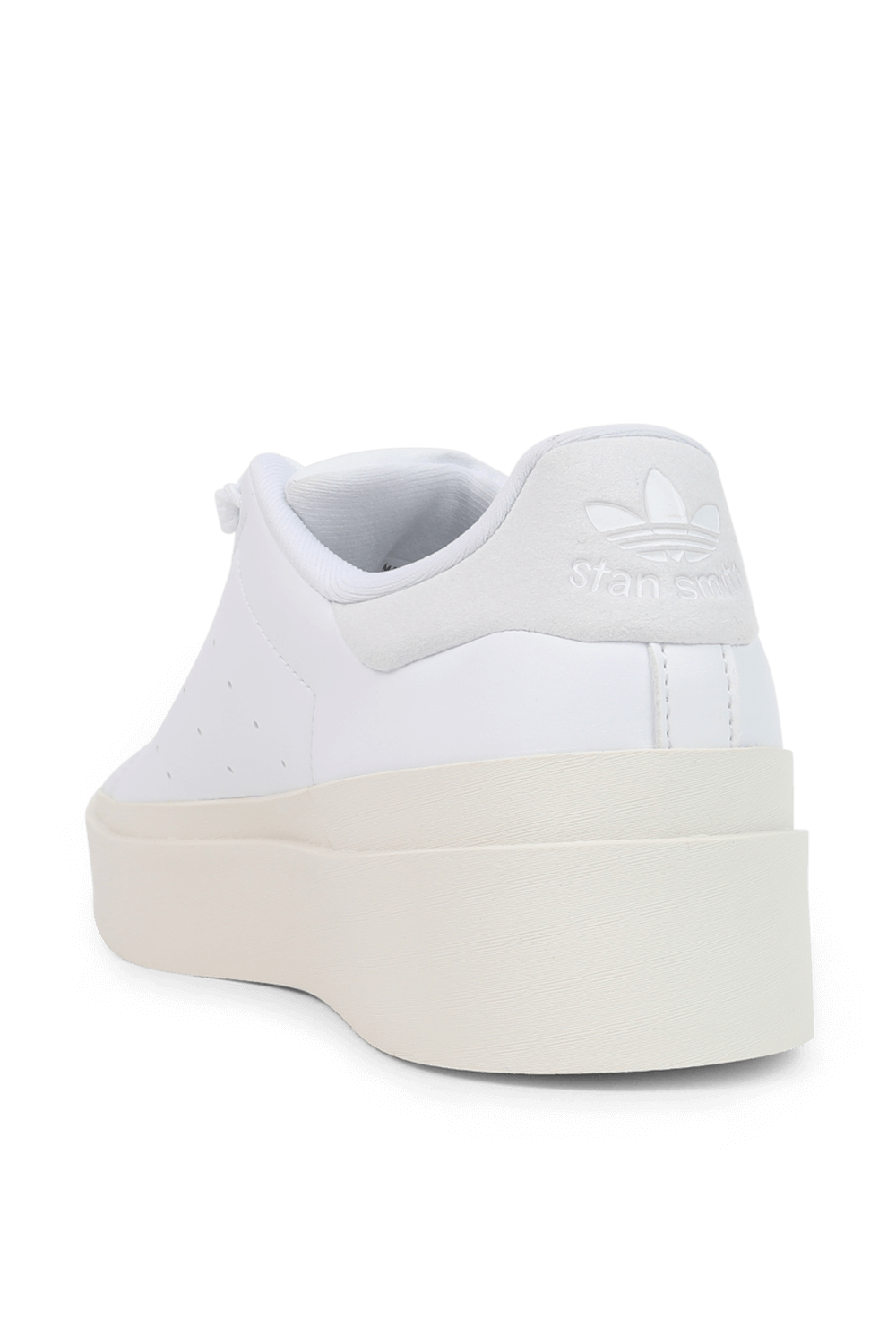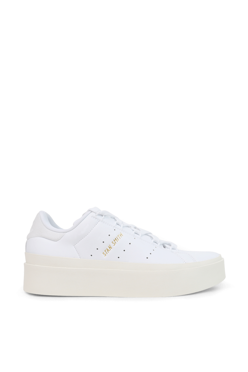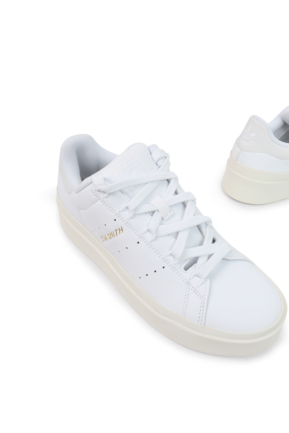 נעלי סניקרס Stan Smith לבנות מבית האופנה והספורט Adidas בטוויסט ייחודי, עם סוליית פלטפורמה מפוסלת. גפות הנעליים עשויות מטקסטיל משובח ומעוטרות בלוגו המותג בגוון זהב ובתפרים בולטים.