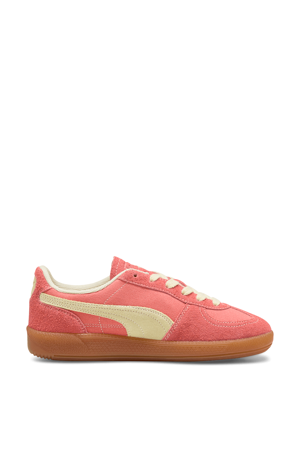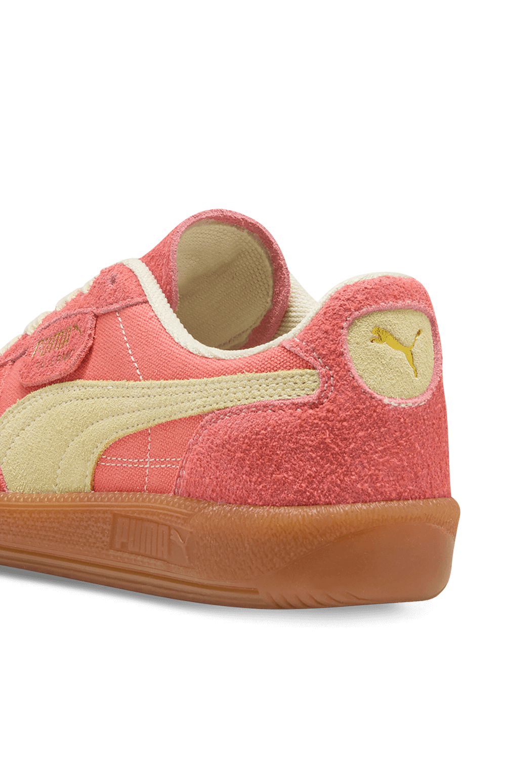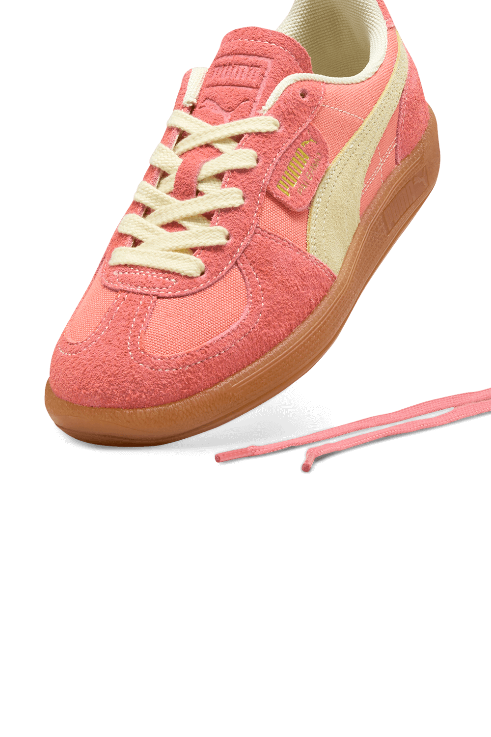 נעלי סניקרס מדגם Palermo Vintage מבית Puma, עשויות שילוב זמש ובד בצבע ורוד מיוחד, עם סוליית גומי חומה בהשראת הזוג המקורי משנות ה-80. הנעליים מגיעות עם זוג שרוכים נוסף בצבע ורוד.