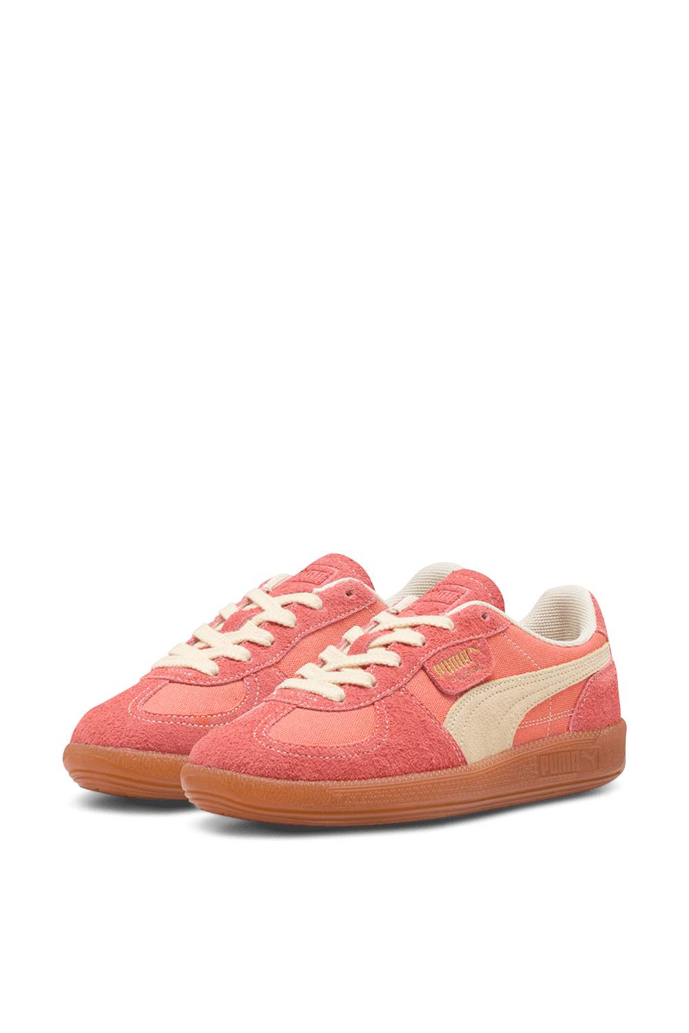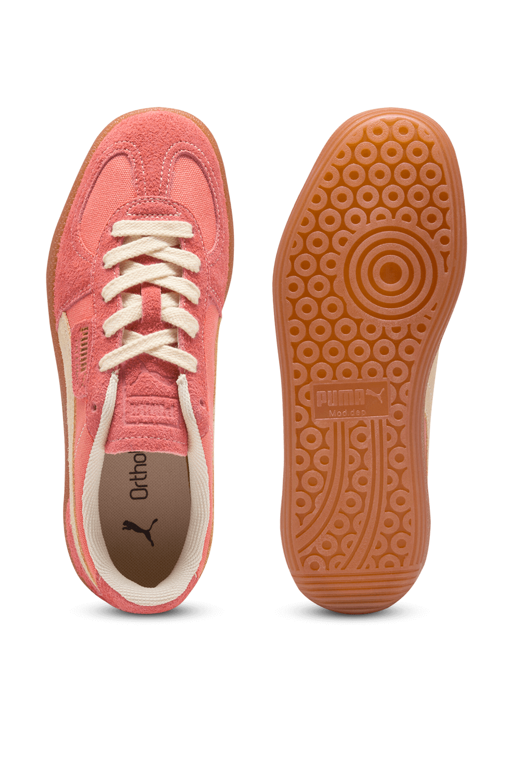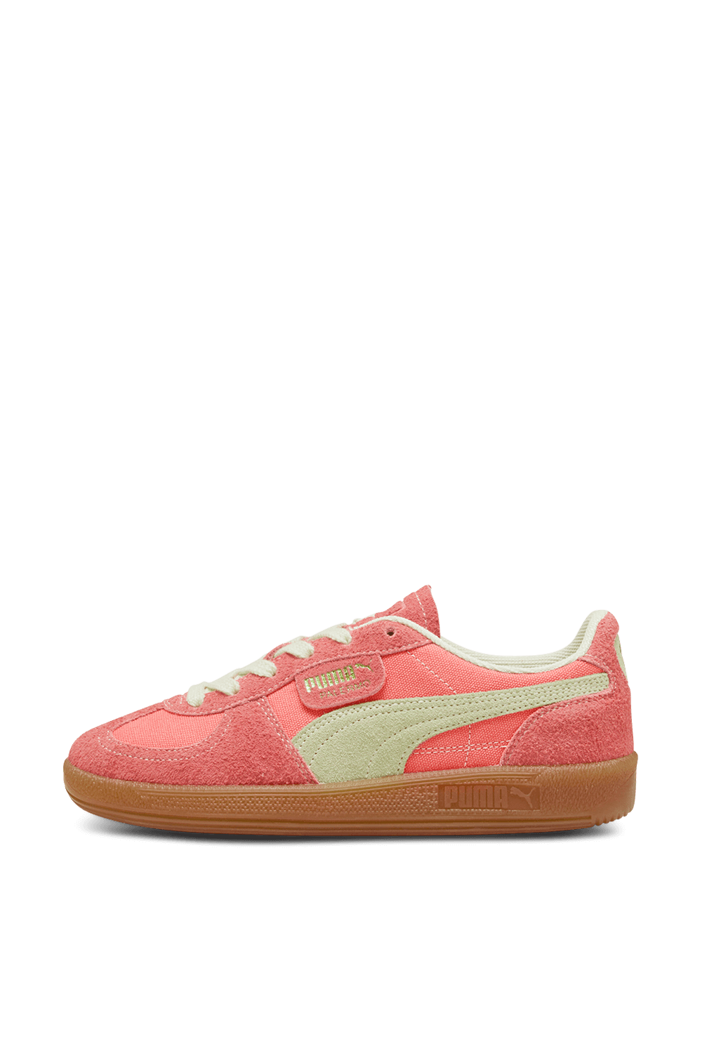נעלי סניקרס מדגם Palermo Vintage מבית Puma, עשויות שילוב זמש ובד בצבע ורוד מיוחד, עם סוליית גומי חומה בהשראת הזוג המקורי משנות ה-80. הנעליים מגיעות עם זוג שרוכים נוסף בצבע ורוד.