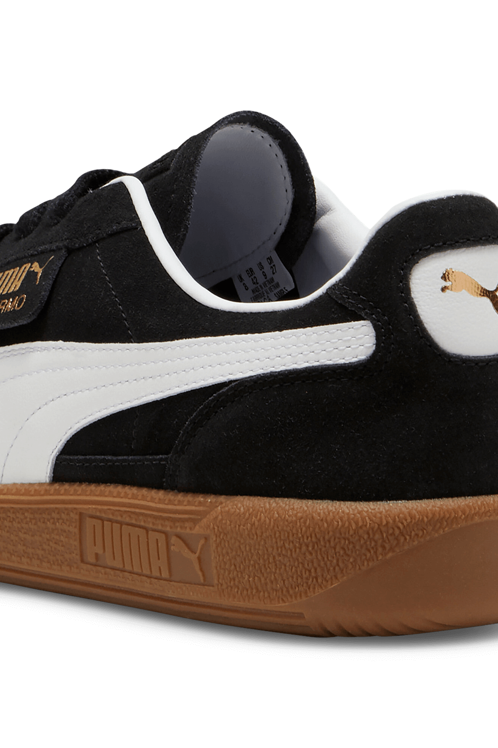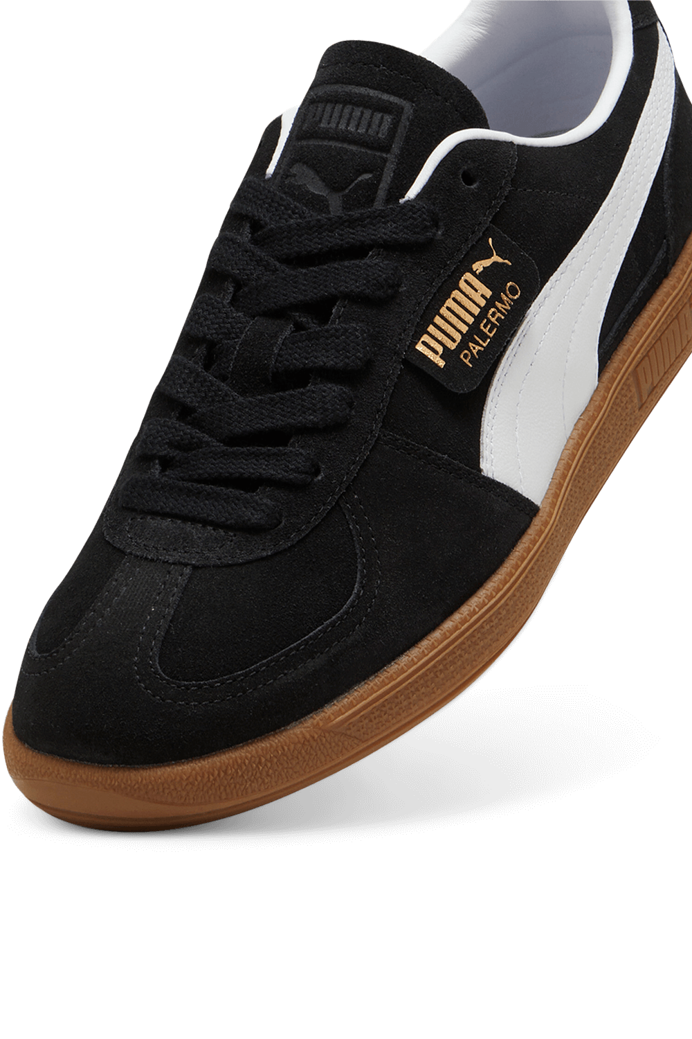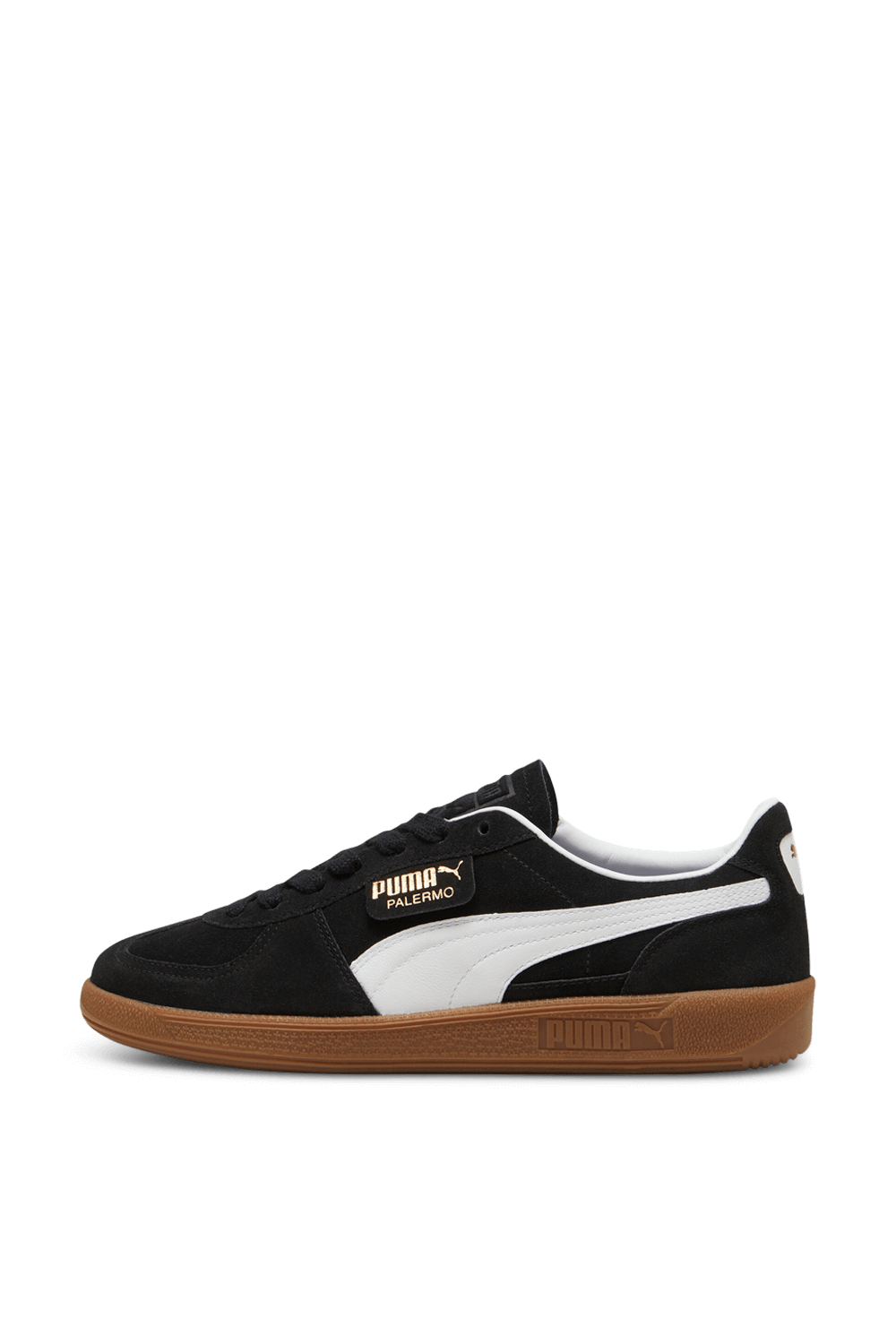 נעלי סניקרס מדגם Palermo מבית Puma, עשויות עור זמש בצבע שחור בשילוב דיטיילז בצבע לבן. לנעליים סוליית גומי חומה כשהן מעוצבות בהשראת הזוג המקורי משנות ה-80.