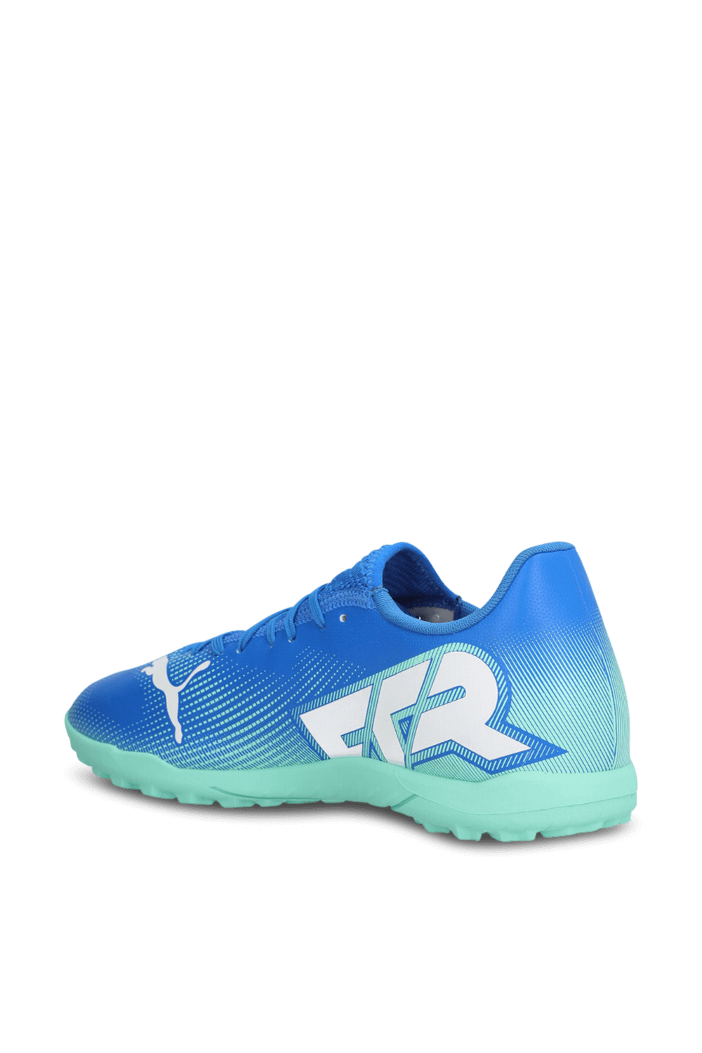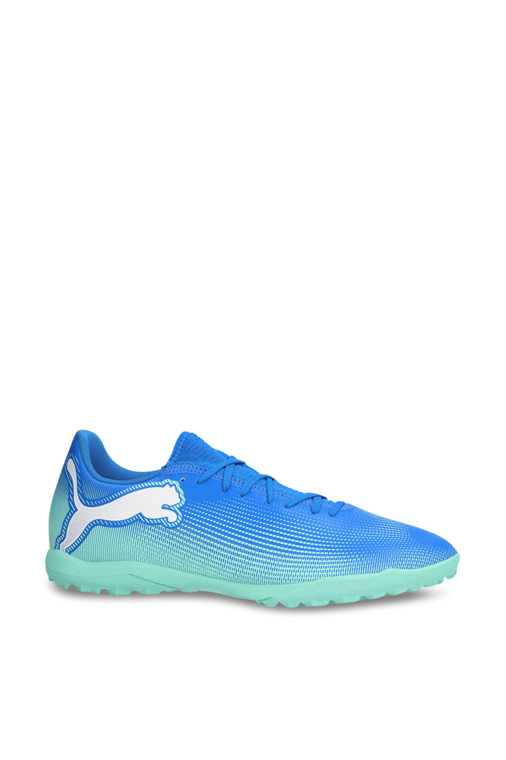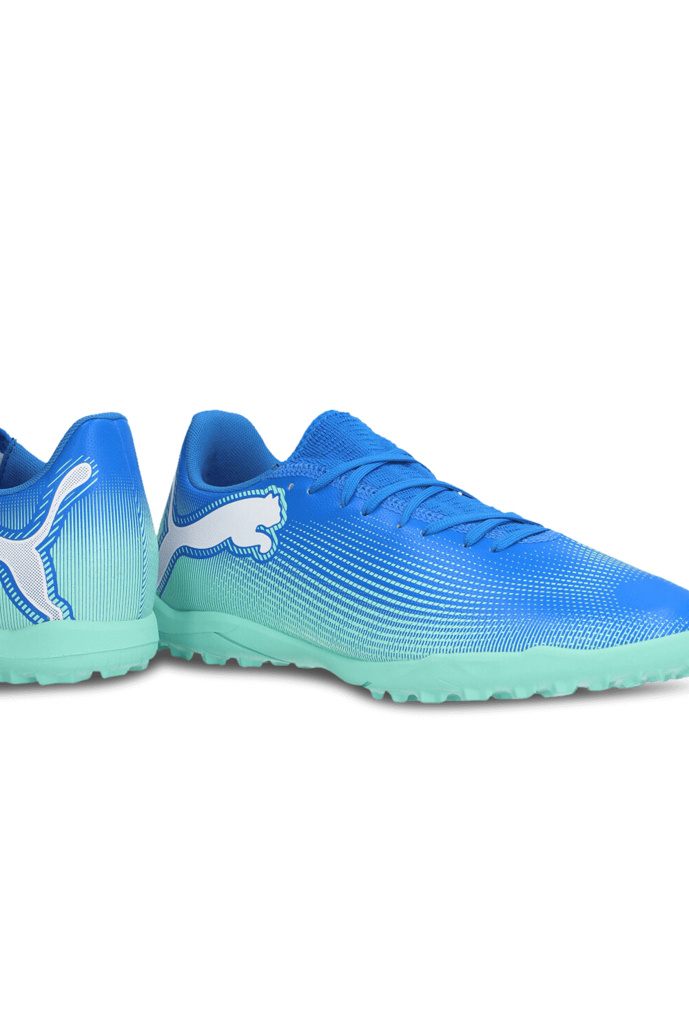 נעלי כדורגל Future 7 מבית Puma, עשויות טקסטיל איכותי בצבע כחול ובעיצוב דיטיילס טורקיז כשלוגו המותג מופיע בצדדים. עיצוב הנעליים מאפשר תנועה דינמית תוך כדי יציבות. מרקמים תלת מימדיים באזורי מגע מרכזיים עם הכדור, מותאמים כדי לשפר את האחיזה והשליטה בכדור ובמגרש.