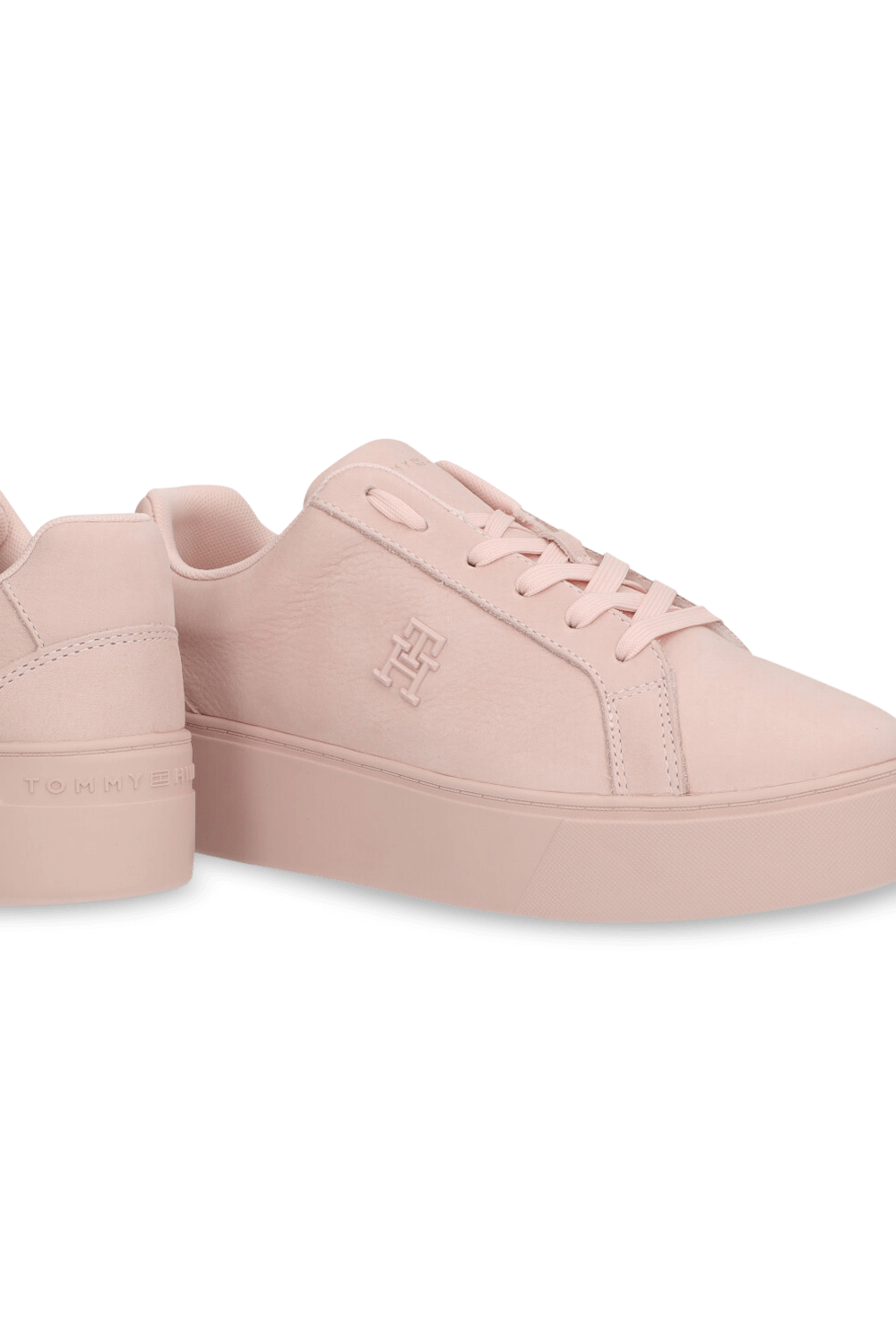 נעלי סניקרס פלטפורמה מבית Tommy Hilfiger, עשויות עור בצבע ורוד בשילוב הטבעת לוגו המותג בצדדים. הנעליים הקלאסיות ישמשו אותך בכל לוק במראה נקי וקז'ואלי.