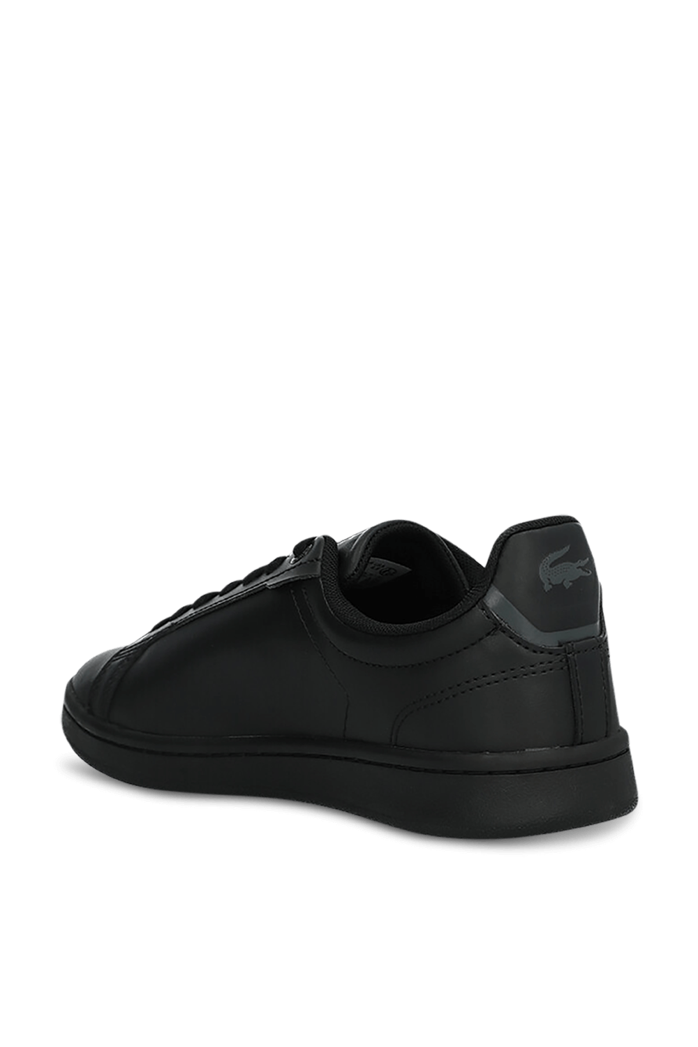 נעלי סניקרס מדגם Carnaby Evo מבית Lacoste, עשויות פוליאוריתן בצבע שחור בשילוב פאץ' לוגו המותג בצדדים, כשהן נשרכות ברכיסה נמוכה.