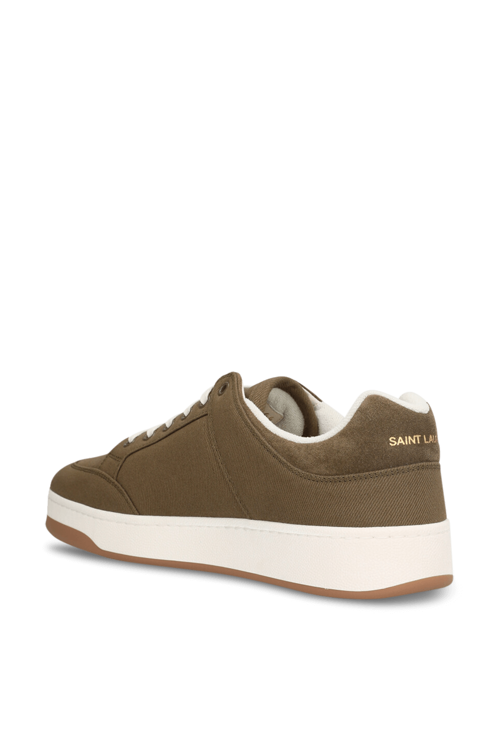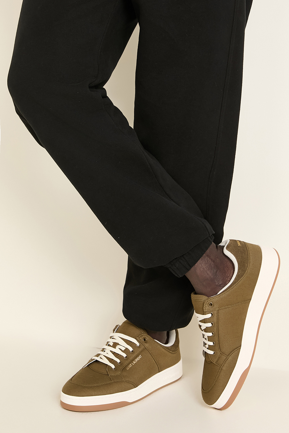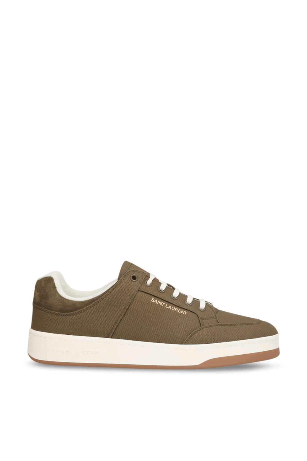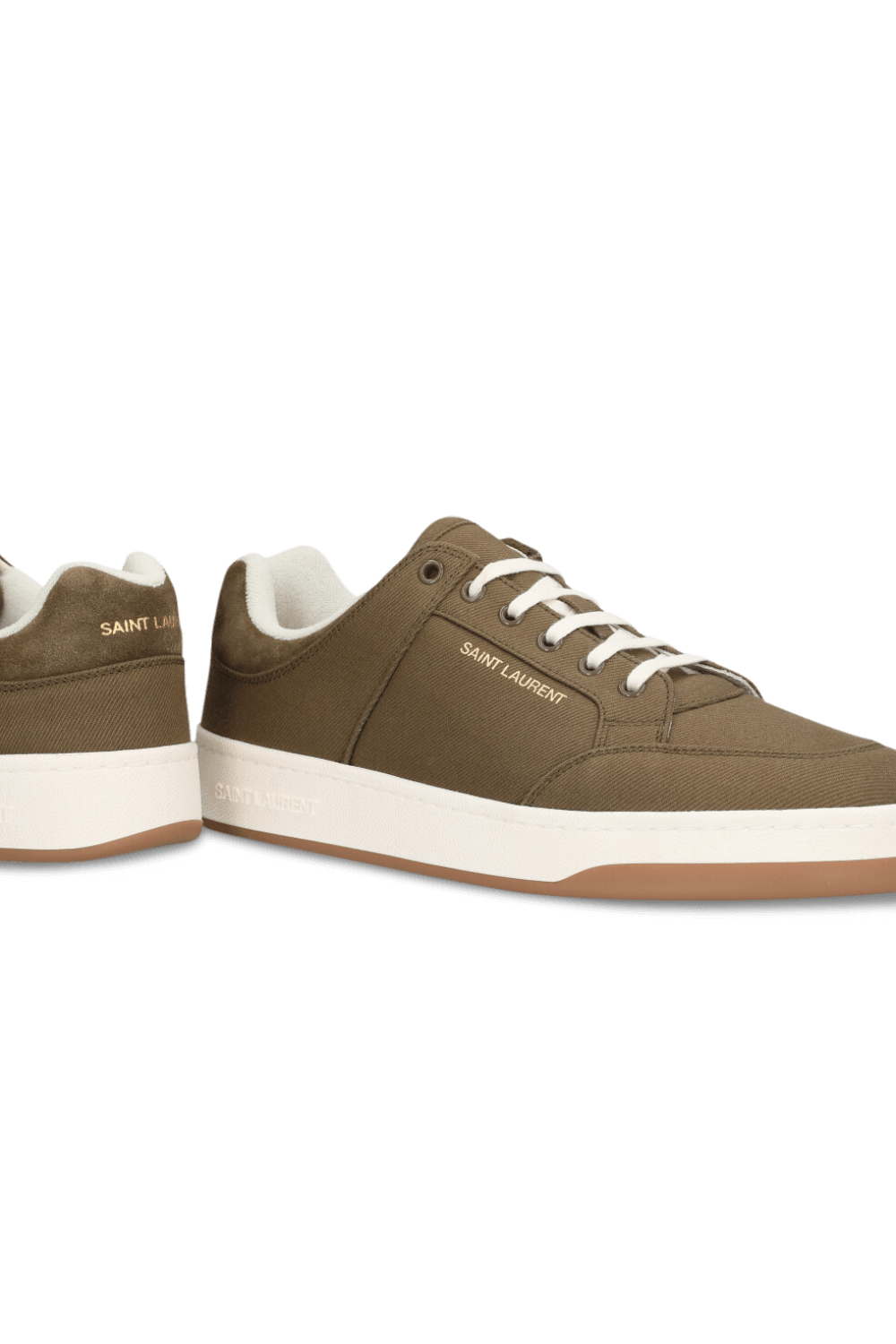 נעלי סניקרס מבית Saint Laurent עשויות בד קורדרוי בצבע ירוק חאקי עם סולייה לבנה.