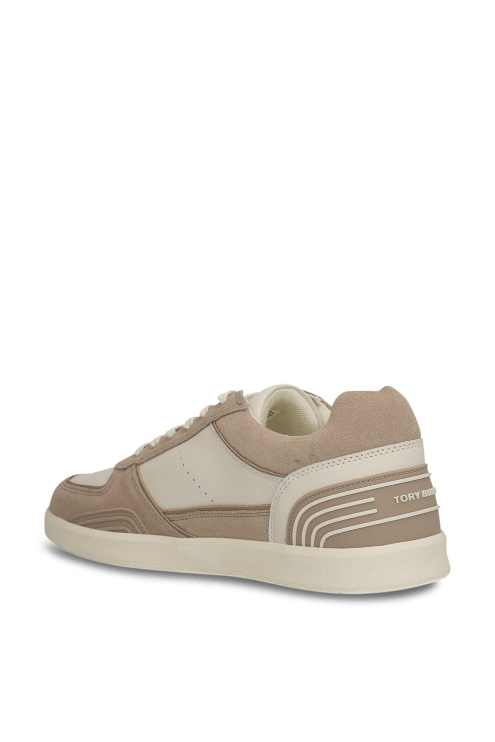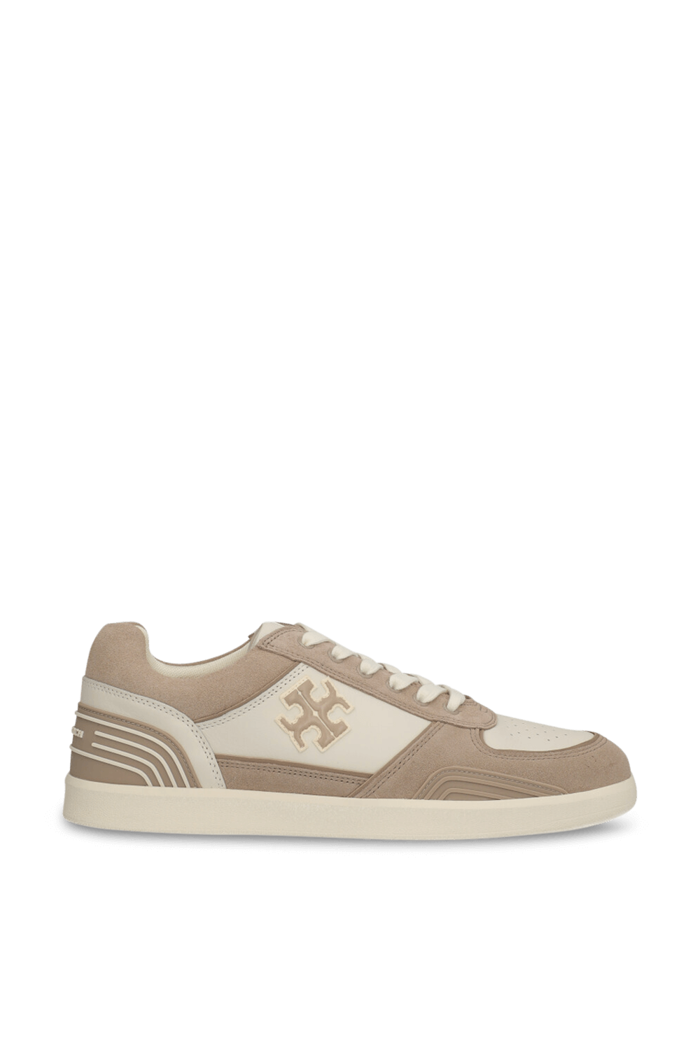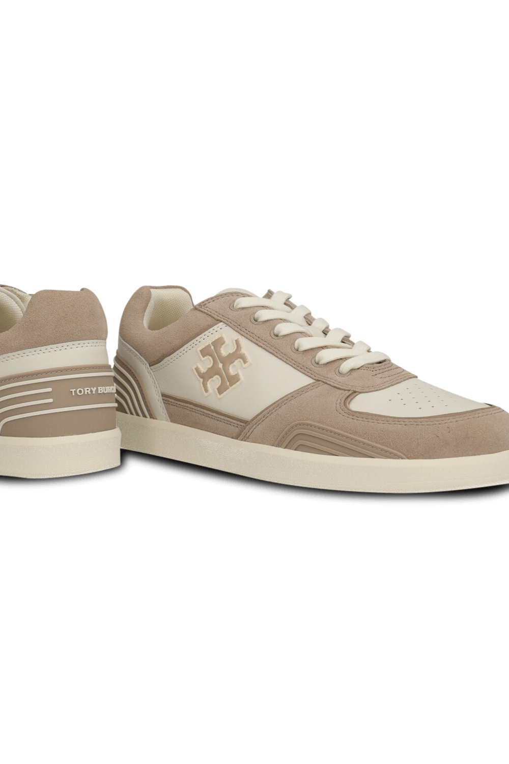 נעלי סניקרס Clover Court מבית Tory Burch, עשויות עור בצבע בז' וזמש חום עם עקב ולוגו סיליקון. ישתלבו בלוק יומיומי ונוח.