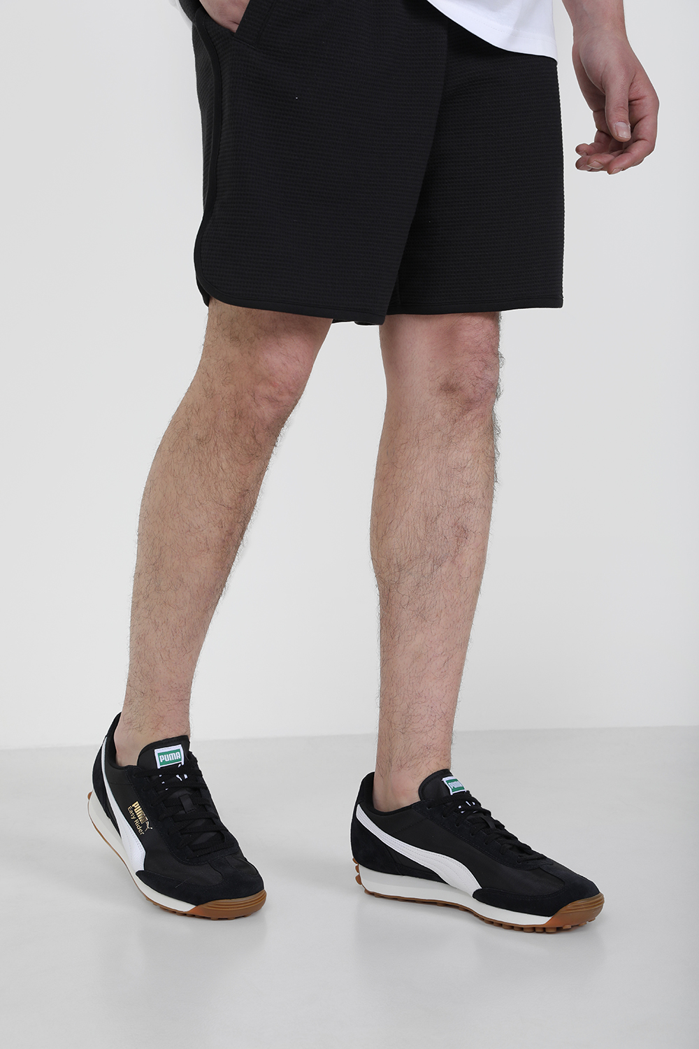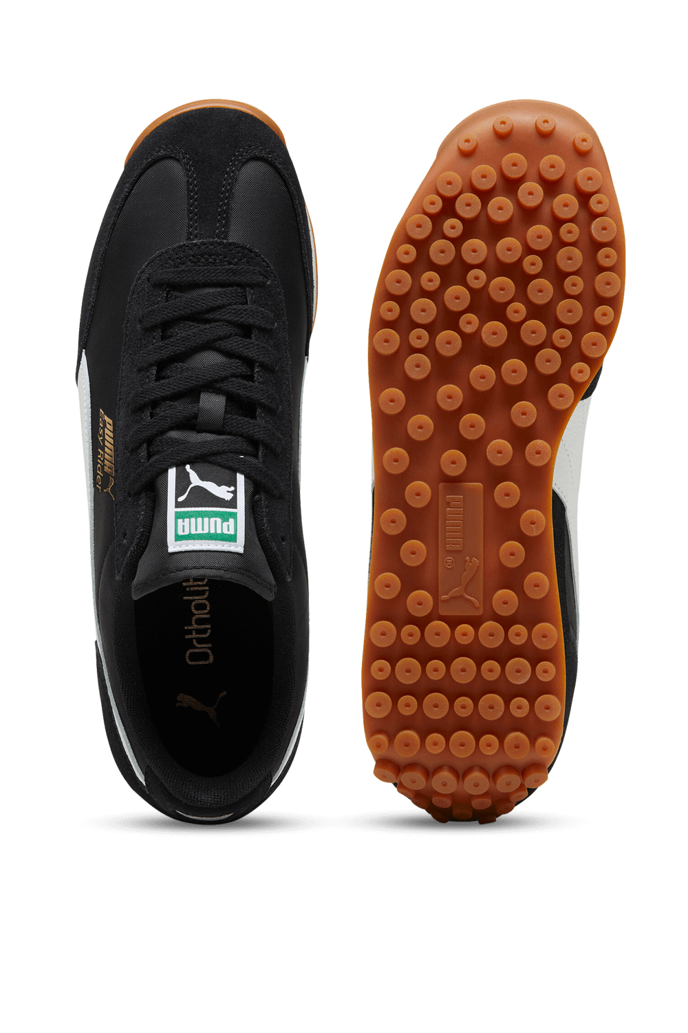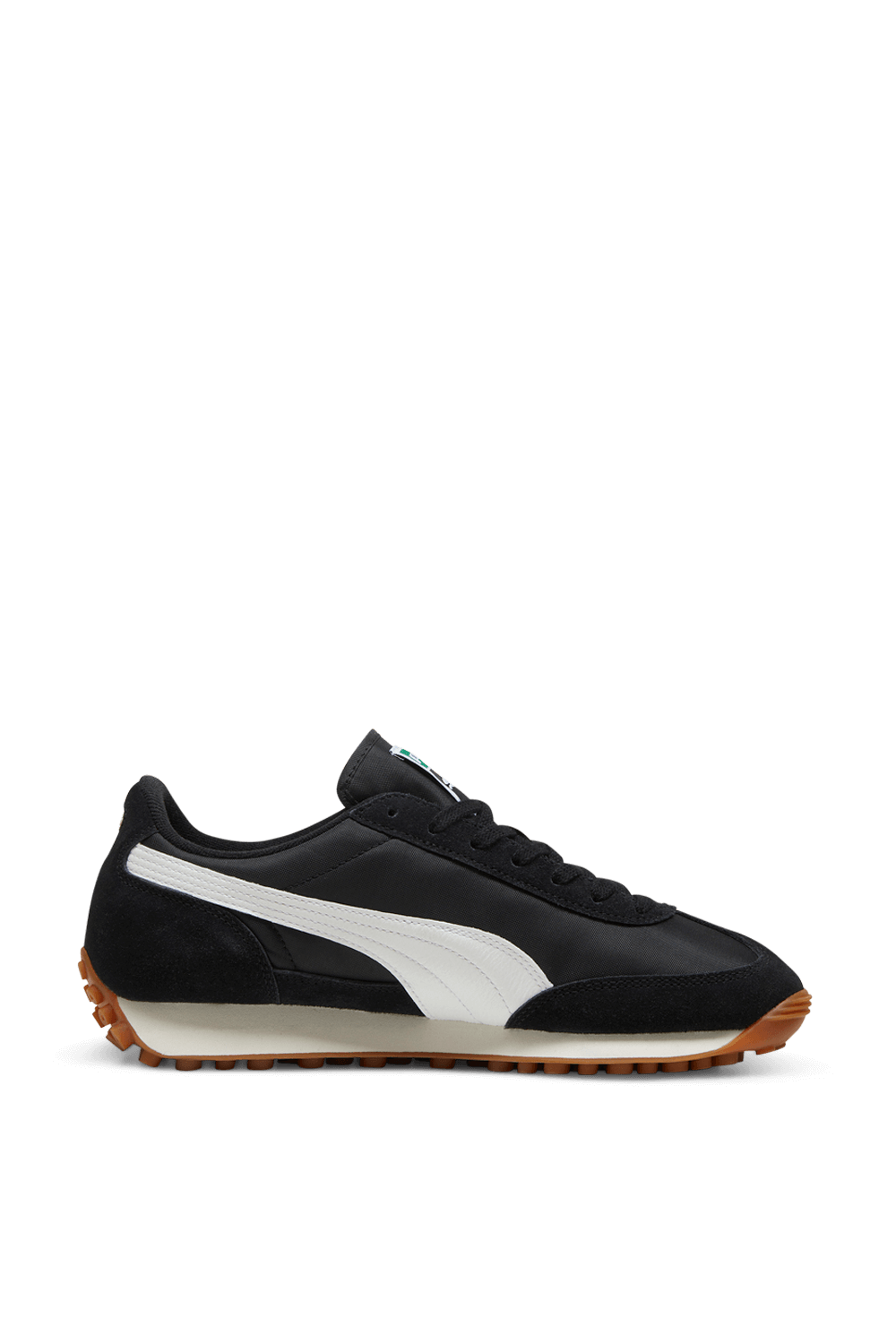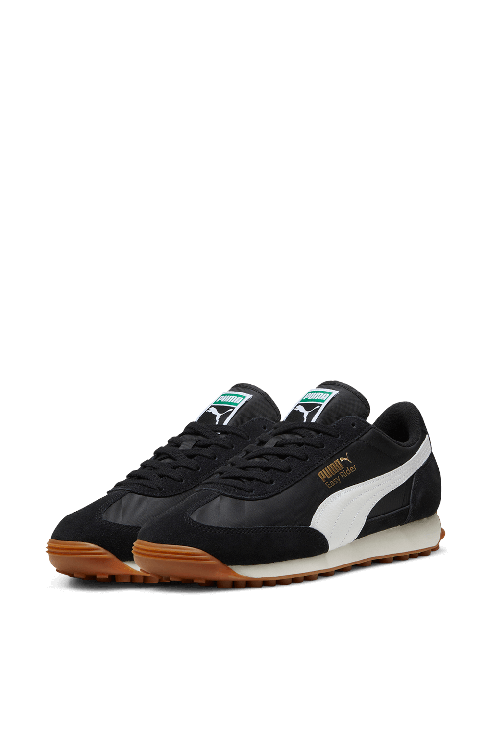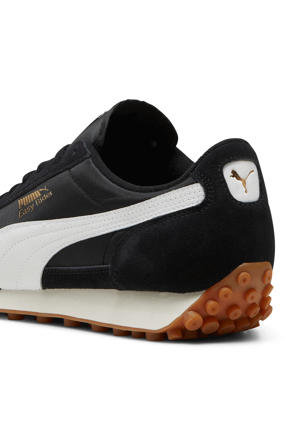 נעלי סניקרס Rider Vintage מבית Puma, עשויות רשת לבנה וזמש בצבע שחור עם לוגו לבן וסוליית גומי בהשראת ארכיון המסלול והשטח משנות ה-80.